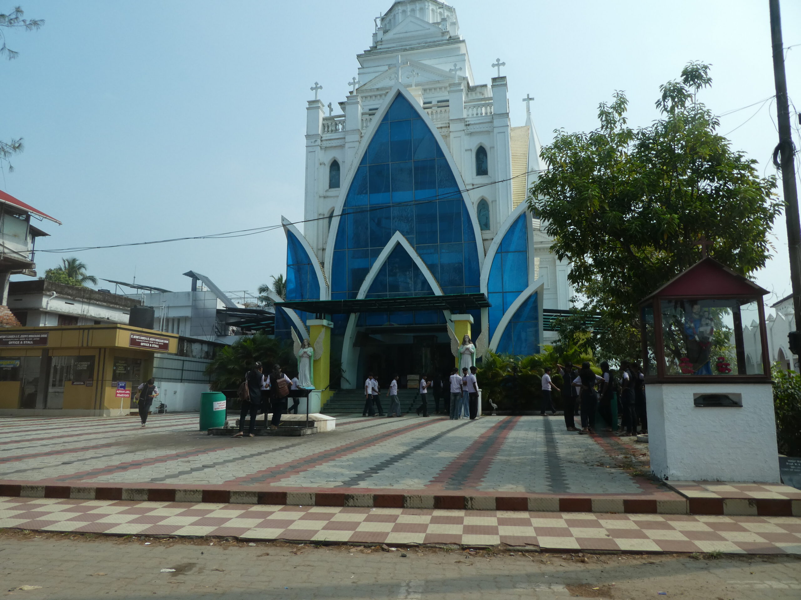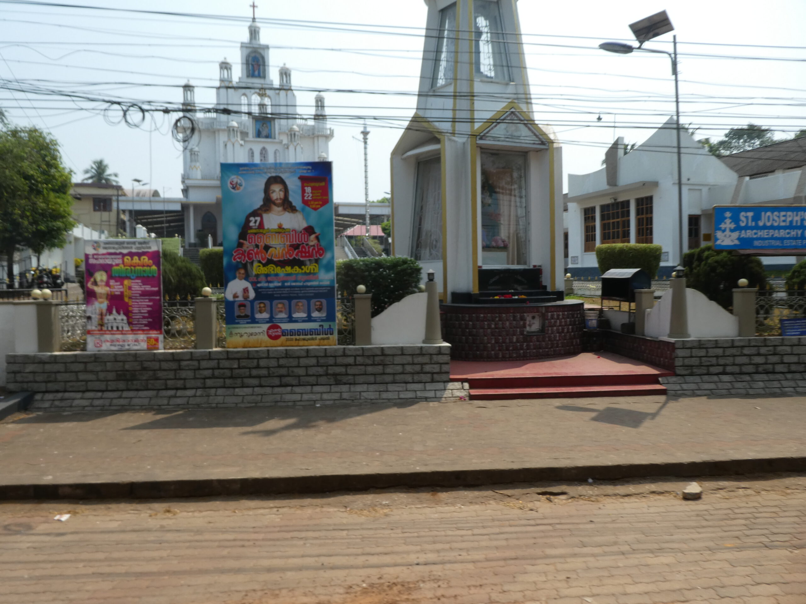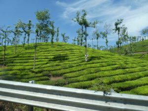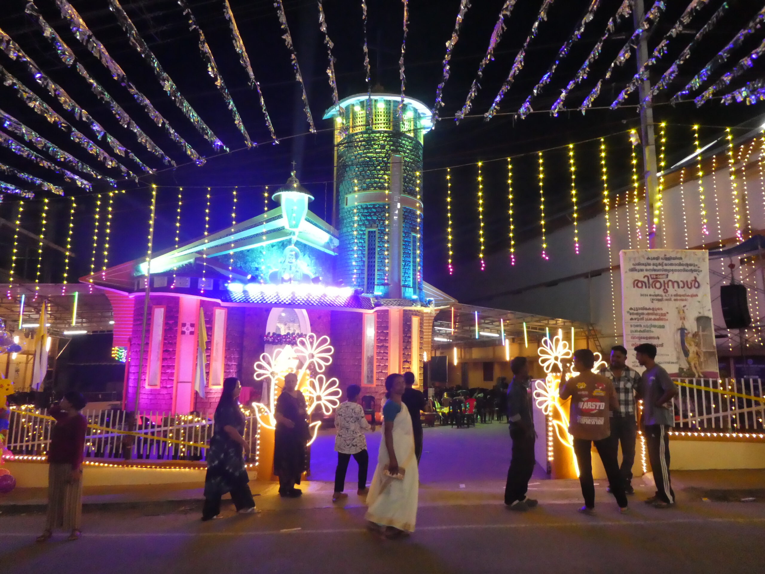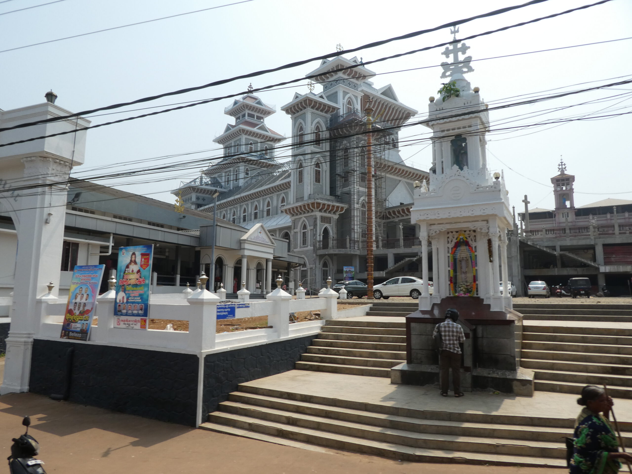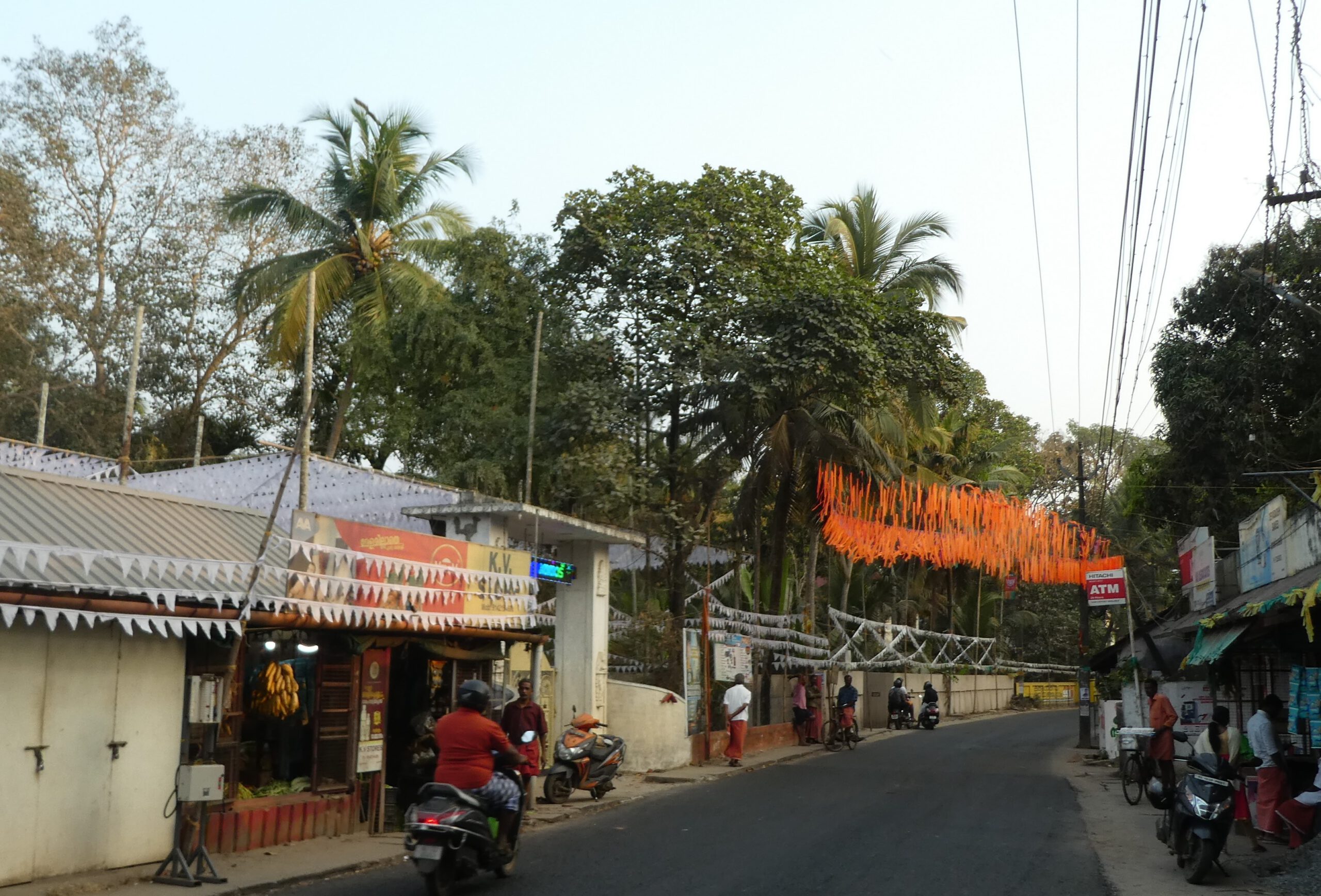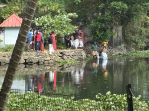 Wir staunen über die vielen Kirchen, die wir während der knapp einstündigen Fahrt sehen, Der Süden Keralas ist stark christlich geprägt, doch auch der Hinduismus hat seinen Platz, das ist an Dekorationen an und über den Straßen schnell zu erkennen. Es vergeht kaum ein Tag, an dem wir nicht durch laute Musik auf irgendein religiöses Fest hingewiesen werden.