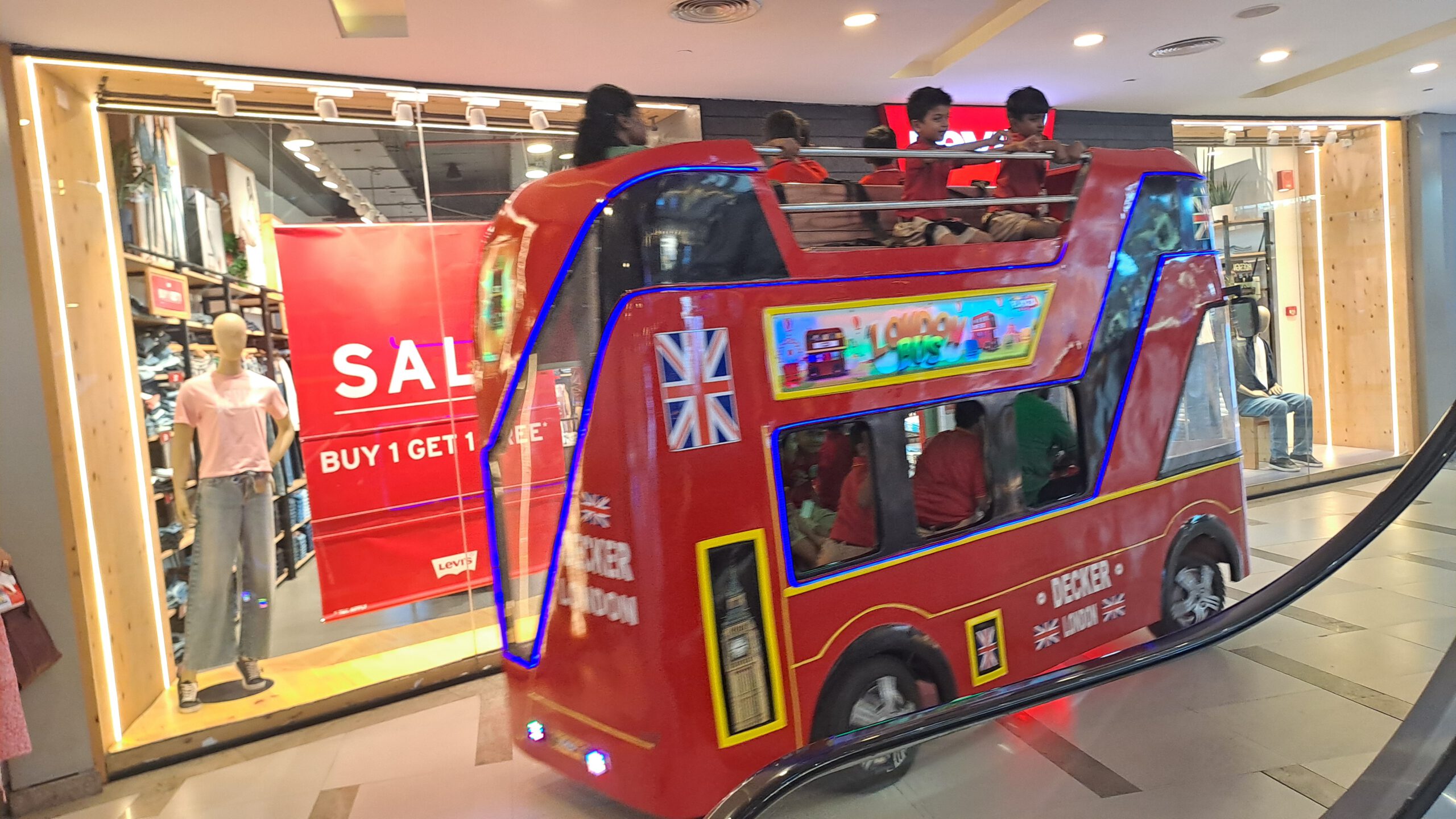 Noch ein Abstecher in ein Einkaufszentrum, wo wir etwas essen. Im Erdgeschoss fährt zur Freude der Kinder ein englischer Doppeldeckerbus durch die Gänge und alle wollen mitfahren.