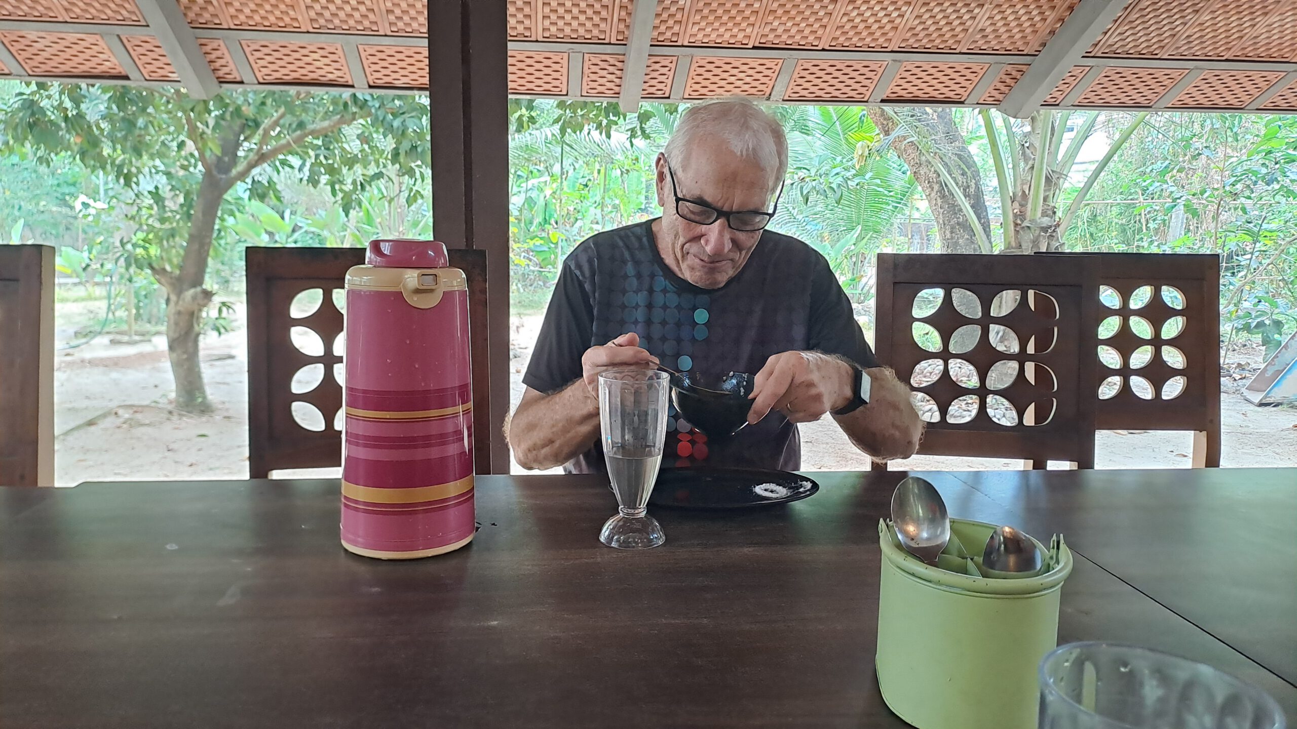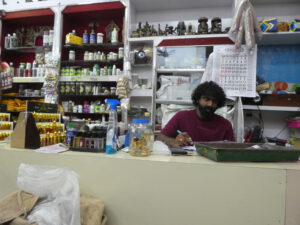 Wir haben inzwischen von einer Assistenzärztin unseren Therapieplan bekommen. Außer den täglichen Massagen muss Klaus 3 Tage lange Reisporridge essen und Ingwerwasser trinken, morgens reicht ihm die Ärztin vor dem Frühstück ein Becherchen warmes Ghee. Ich komme mit verschiedenen Medikamenten und drei Einläufen davon. Dreimal am Tag gibt es vegetarisches Essen, schwach gewürzt, mit frisch gepressten Säften (morgens) und immer leckerem Salat (mittags).