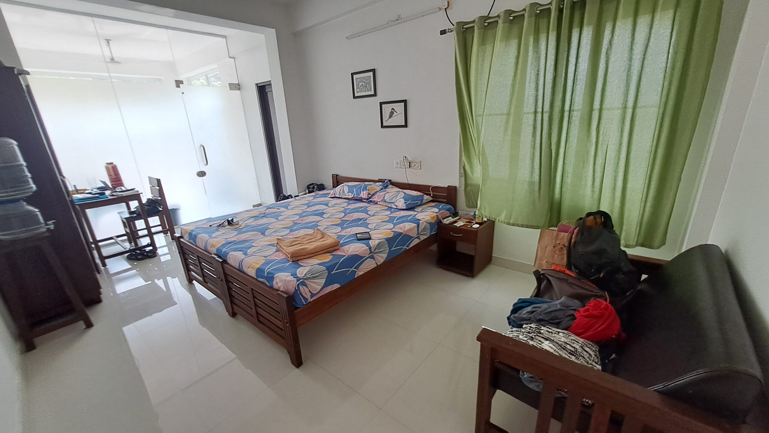 Im Ayurvedahospital – das übrigens von einem Deutschen mitgegründet wurde – wird Klaus schon namentlich mit einem Zettel an der Anschlagtafel begrüßt. Das Hauptgebäude könnte einen neuen Anstrich vertragen, aber bei der Lage in der Nähe des Ozeans würde der nicht lange halten. Wir beziehen ein Zimmer mit Bad im neueren der beiden Gebäude. Es hat ein großes Doppelbett, Schrank, Tisch und Stuhl und eine kleine Couch. Trinkwasser bekommen wir aus einem großen Wasserspender. Außerdem haben wir einen großen Balkon, der rundherum mit Fliegengitter umschlossen ist. Ob man sich mit Klimaanlage oder Ventilator abkühlt, bleibt jedem selbst überlassen.