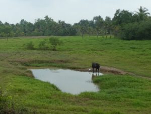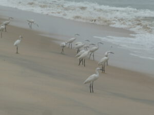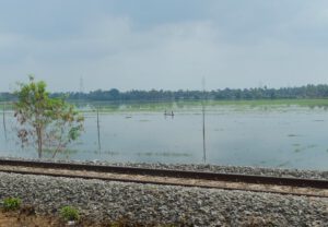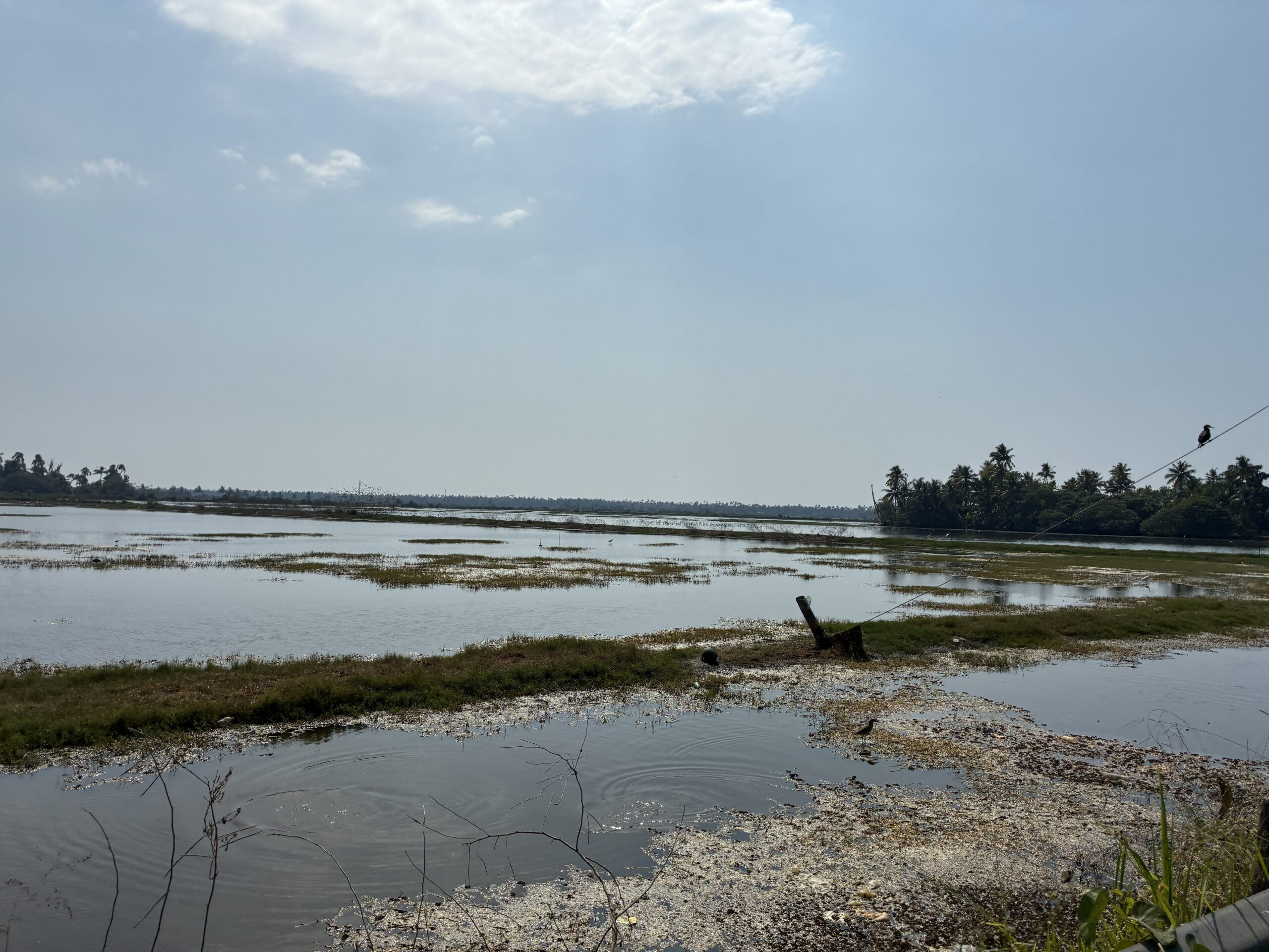 Die Fahrt führt fast fast die ganze Zeit am Meer entlang, auf der anderen Seite riesige Wasserflächen, unterteilt durch kleine Dämme. Es sind abgeerntete Reisfelder, Fische und Garnelen (Tigerprawns) haben die ca. 10 cm tiefe Wasserfläche bis zur Neuanpflanzung jetzt ganz für sich. Sehr zur Freude der verschiedenen Reiherarten, die hier massenhaft im Wasser stehen und auf Beute lauern. Früher wurde das Wasser nach der Reisernte abgelassen, doch die Wasserknappheit hat die Bauern gezwungen, auf kombinierte Fisch-Reiszucht umzustellen. Ein doppelter Gewinn: Die Tiere vertilgen Unkraut und Schädlinge im Wasser, ihre Ausscheidungen düngen wiederum die Reispflanzen und der Verkauf bringt zusätzlichen Gewinn. Im Bundesstaat Kerala wird diese Methode intensiv genutzt.