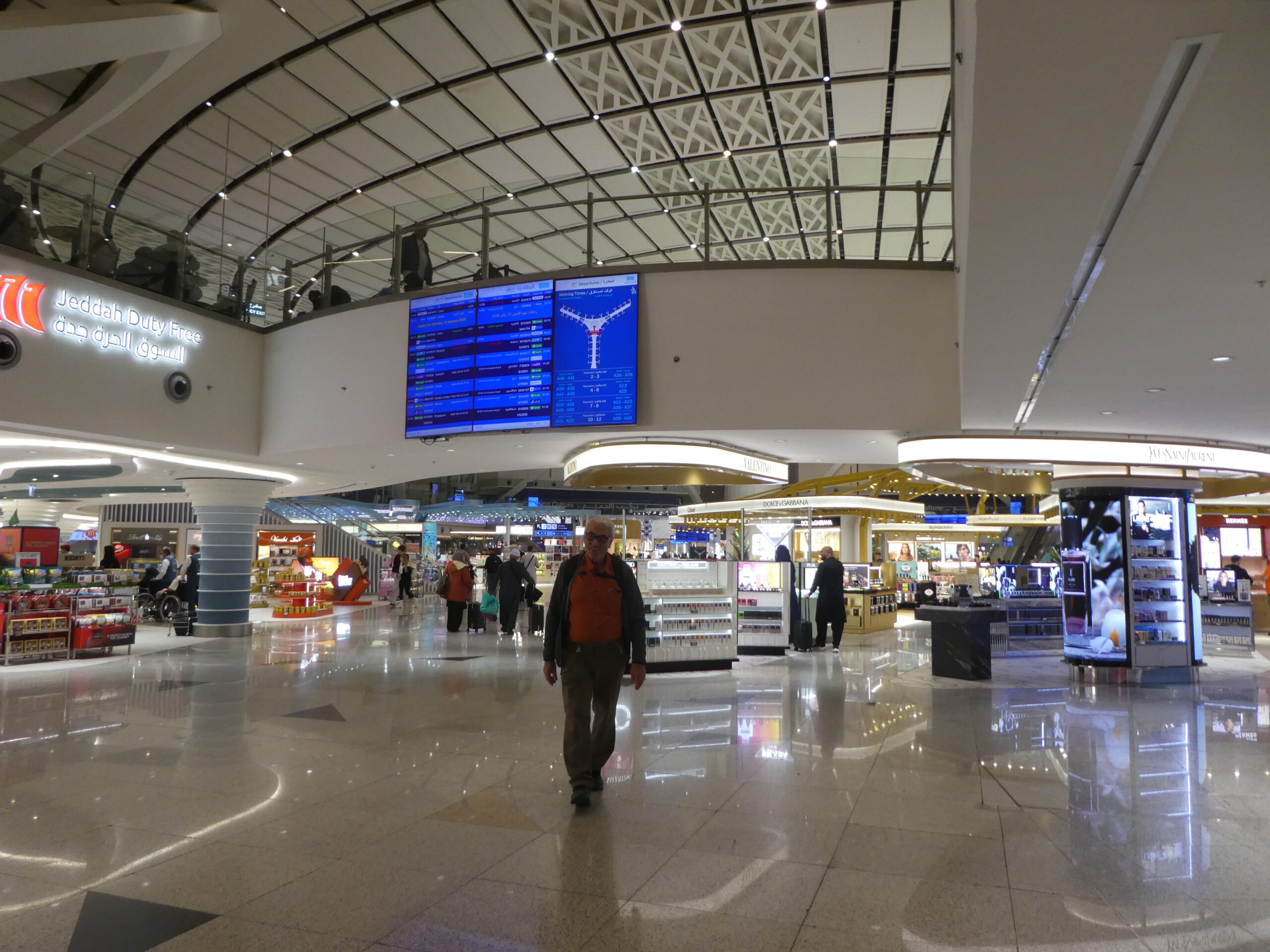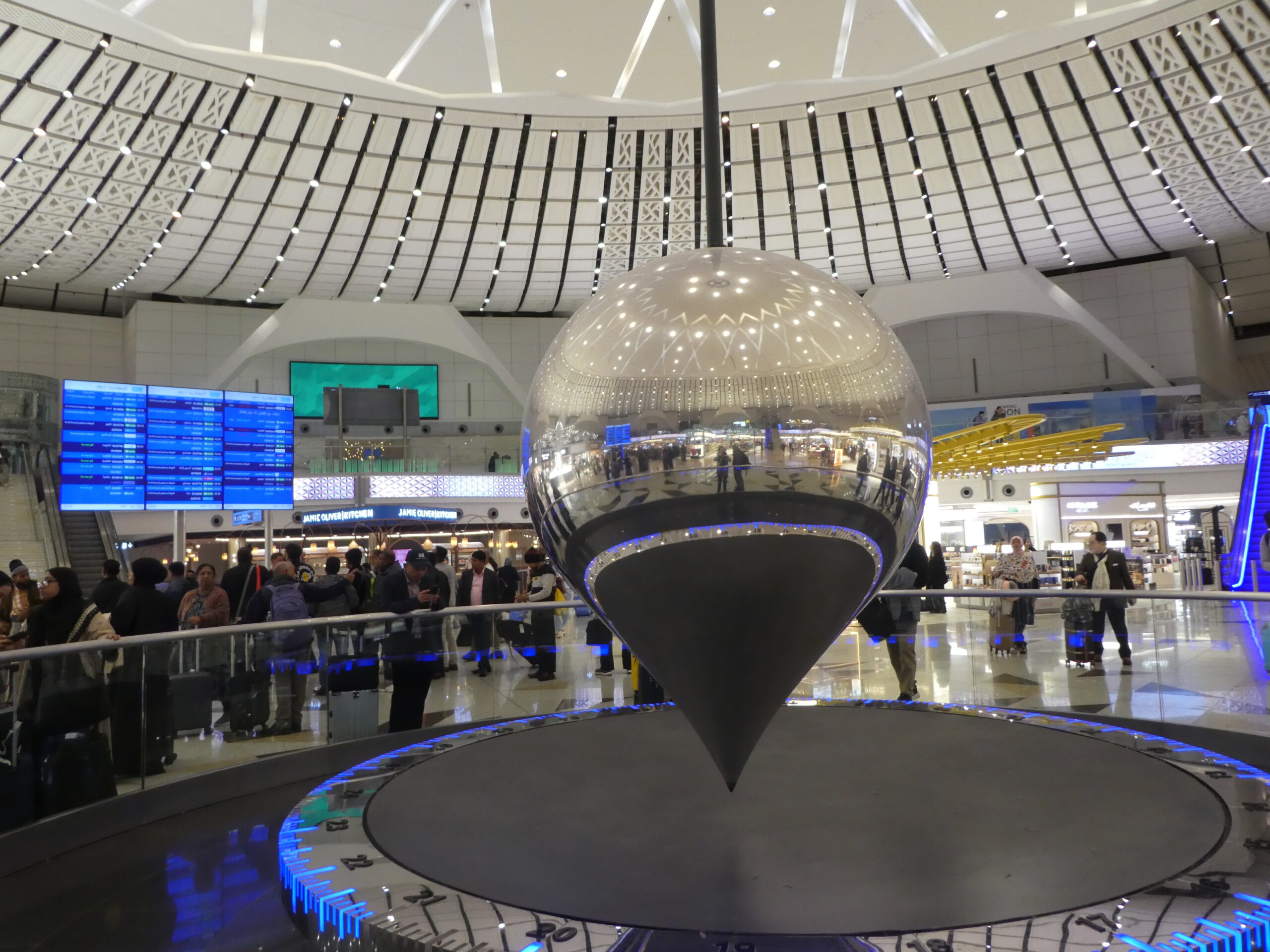 Der König-Abdal-Aziz-Flughafen – 1980 von einer deutschen Firma erbaut – ist flächenmäßig einer der größten der Welt und bietet Pilgermaschinen viel Stellplatz. Das neue Terminal wurde 2018 eröffnet und hat im Zentrum ein gigantisches Pendel.