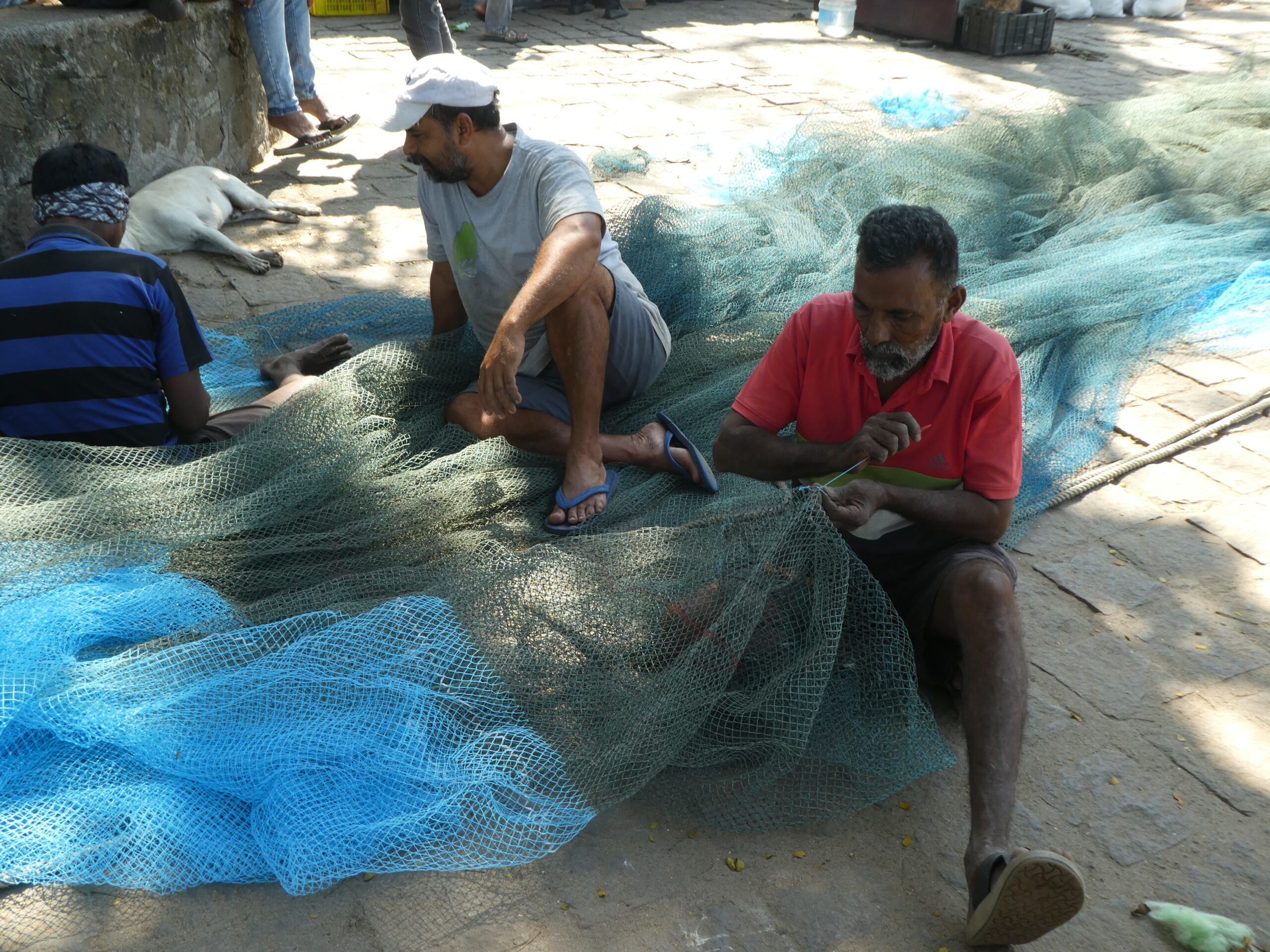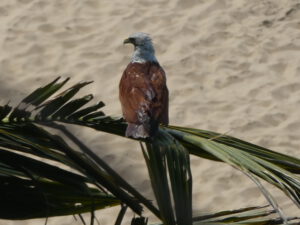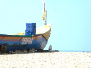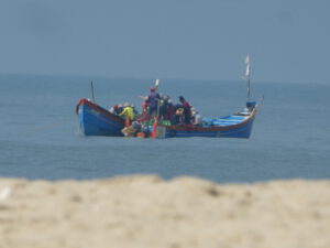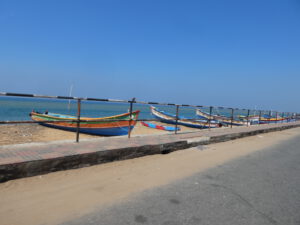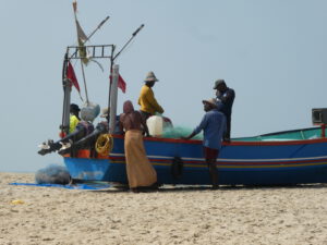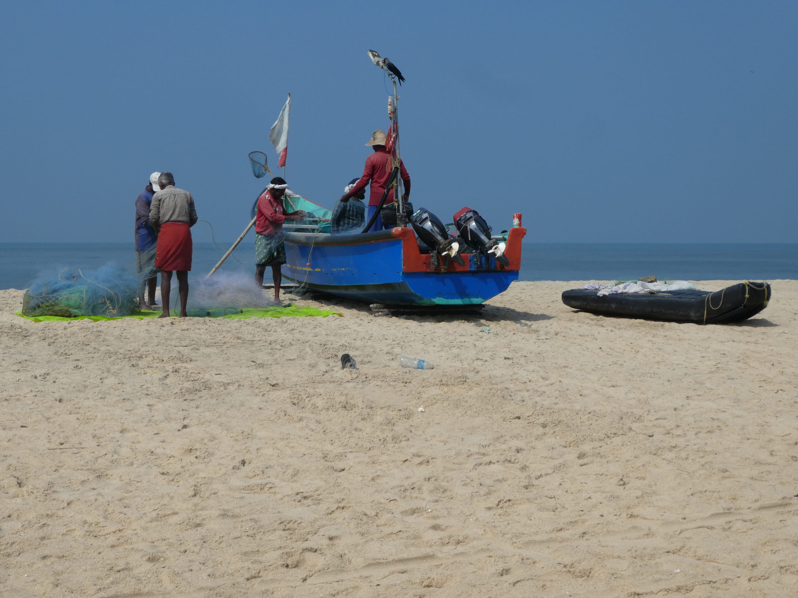„Amballa ok,“ sagt Habib eifrig am nächsten Morgen. Kurzes rätseln, ach er meint, dass er den Umbrella (Sonnenschirm) am Strand für uns aufgespannt hat. Jetzt können wir dort bequem vom Sessel aus die Rückkehr der Fischer beobachten. Ein Schwarm Krähen kreist über den Booten, und über ihnen beobachtet ein etwas kleinerer Schwarm Brahminenweihen (eine Habichtart) das Geschehen. Mit vereinten Kräften ziehen die Fischer die ca. 8 Meter langen Holzboote an den Strand und dann beginnt noch eine zeitraubende Arbeit für die Besatzung. Das Netz wird Stück für Stück kontrolliert, entwirrt und falls nötig repariert. Dann ordentlich zusammengelegt und wegen der zersetzenden UV-Strahlung sofort mit einer Plane abgedeckt. Danach wird der Fang geteilt, jeder bekommt eine Plastiktüte mit vielleicht 2 – 3 kg der sardinengroßen Fische. So wenig Ertrag für diese anstrengende Arbeit. Zum Schluss kommt eine weitere Plane über das ganze Schiff, dann verlassen die Fischer den Strand. Darauf haben die streunenden Hunde gewartet, im Schatten der Boote haben sie bis zum Abend einen angenehmen Ruheplatz. Nie sind sie Menschen gegenüber aggressiv, nur nachts hört man sie ihre Kämpfe untereinander austragen.