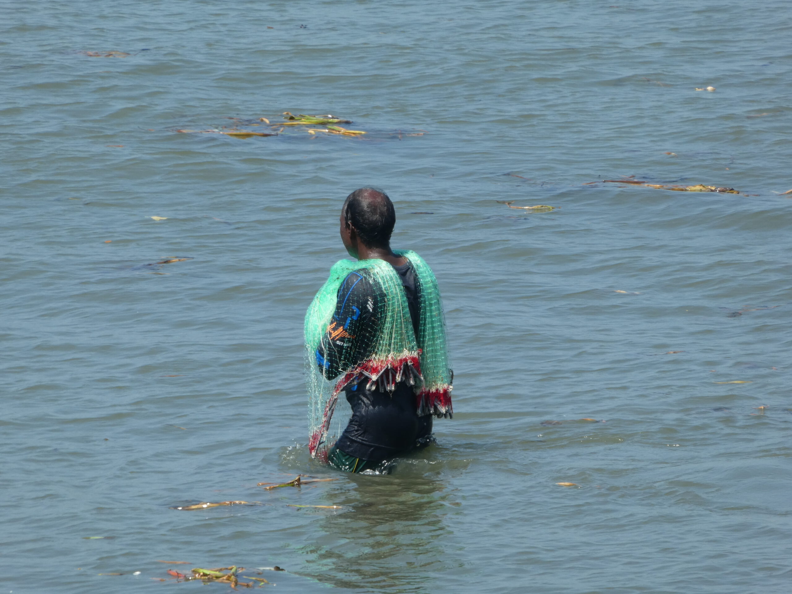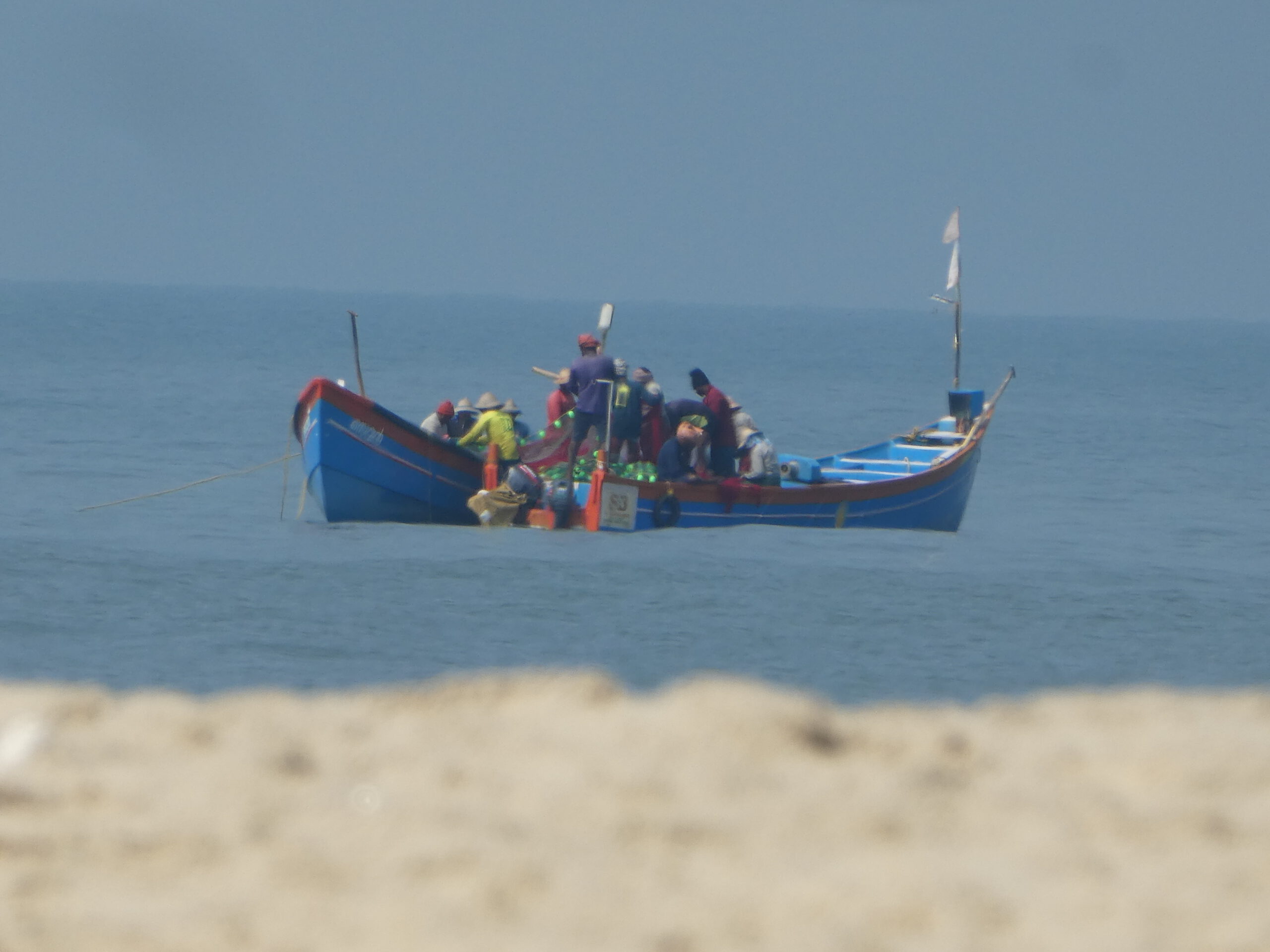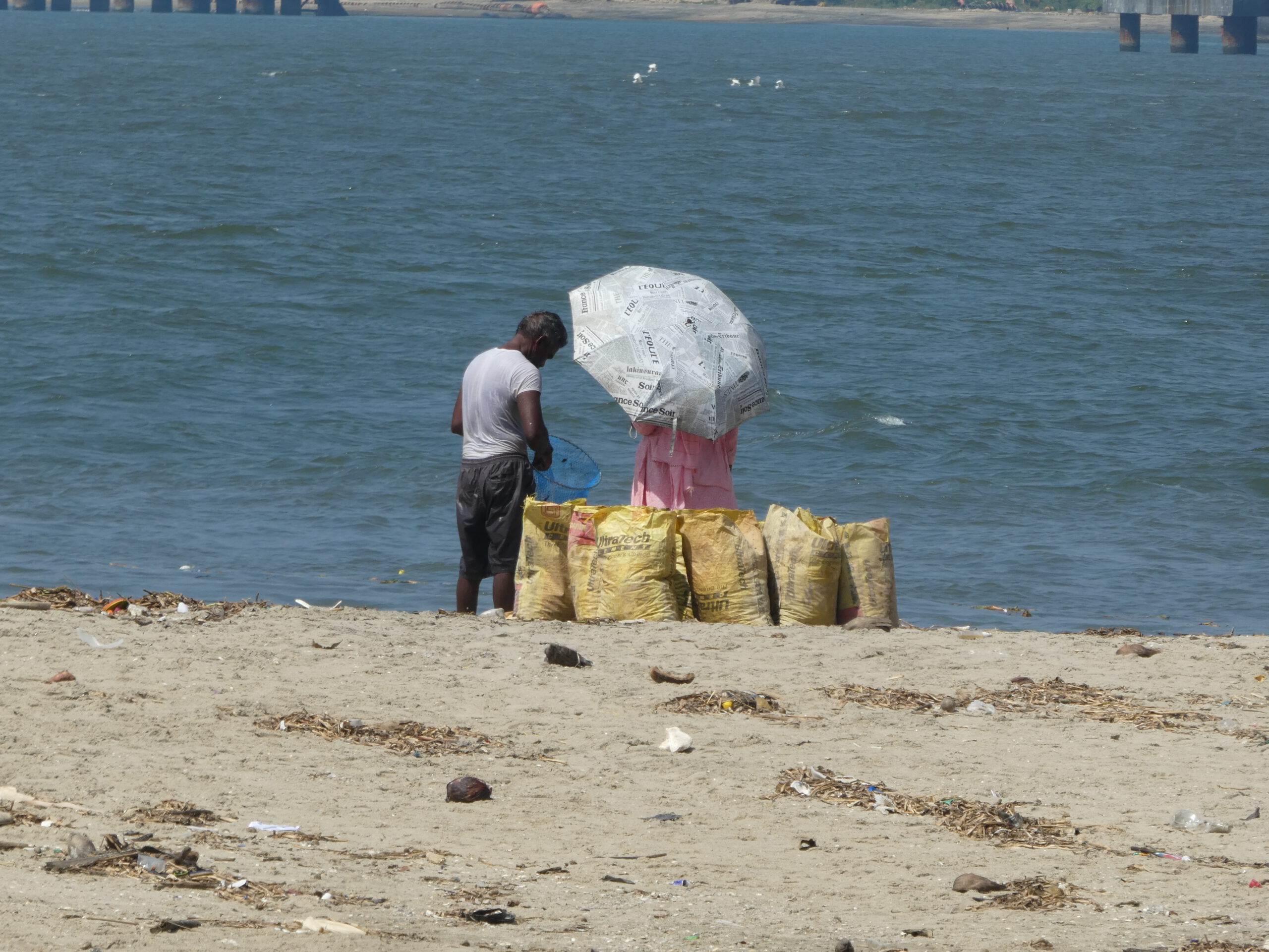 „Amballa ok,“ sagt Habib eifrig am nächsten Morgen. Kurzes rätseln, ach er meint, dass er den Umbrella (Sonnenschirm) am Strand für uns aufgespannt hat. Jetzt können wir dort bequem vom Sessel aus die Rückkehr der Fischer beobachten. Ein Schwarm Krähen kreist über den Booten, und über ihnen beobachtet ein etwas kleinerer Schwarm Brahminenweihen (eine Habichtart) das Geschehen. Mit vereinten Kräften ziehen die Fischer die ca. 8 Meter langen Holzboote an den Strand und dann beginnt noch eine zeitraubende Arbeit für die Besatzung. Das Netz wird Stück für Stück kontrolliert, entwirrt und falls nötig repariert. Dann ordentlich zusammengelegt und wegen der zersetzenden UV-Strahlung sofort mit einer Plane abgedeckt. Danach wird der Fang geteilt, jeder bekommt eine Plastiktüte mit vielleicht 2 – 3 kg der sardinengroßen Fische. So wenig Ertrag für diese anstrengende Arbeit. Zum Schluss kommt eine weitere Plane über das ganze Schiff, dann verlassen die Fischer den Strand. Darauf haben die streunenden Hunde gewartet, im Schatten der Boote haben sie bis zum Abend einen angenehmen Ruheplatz. Nie sind sie Menschen gegenüber aggressiv, nur nachts hört man sie ihre Kämpfe untereinander austragen.