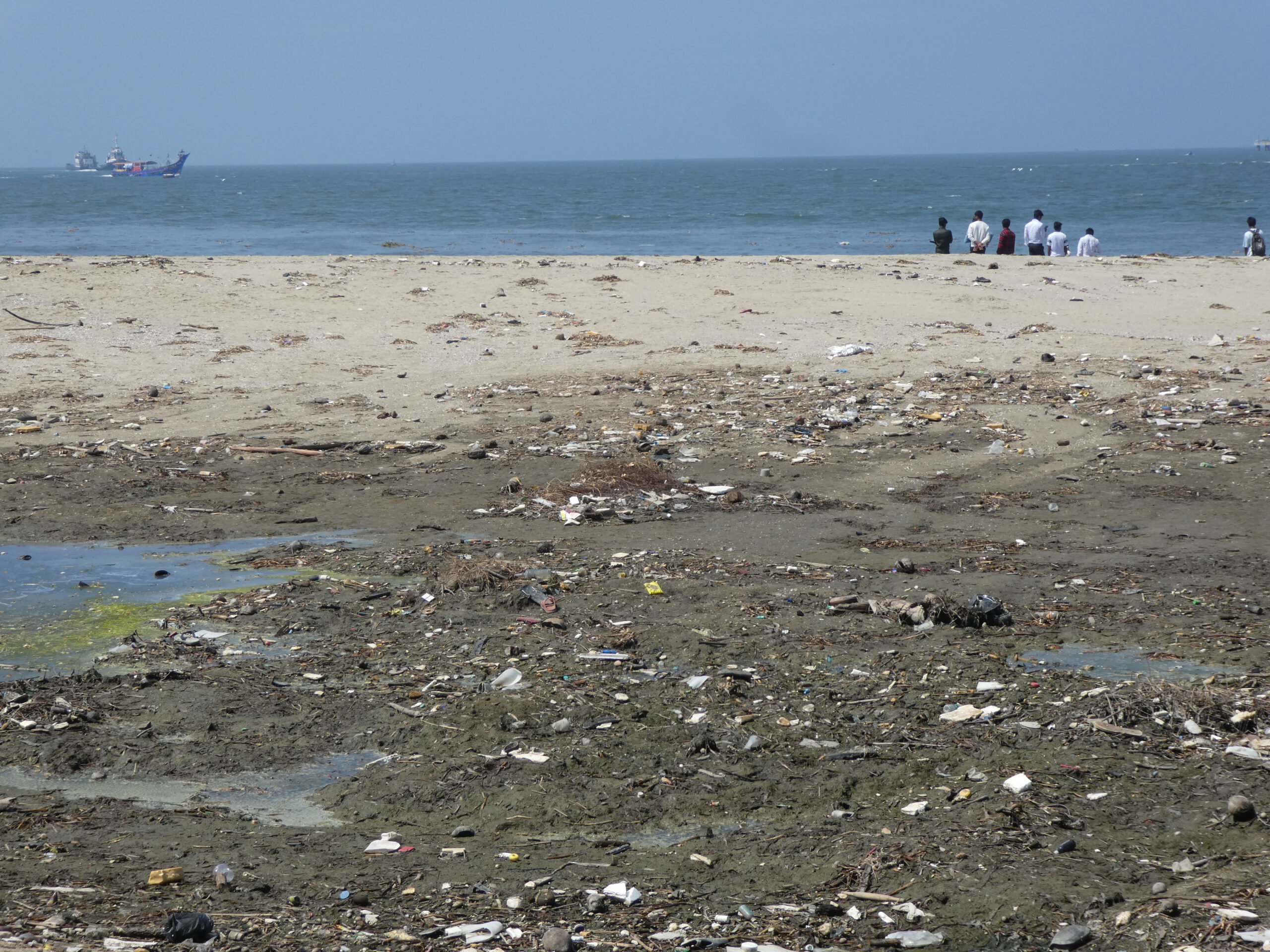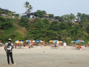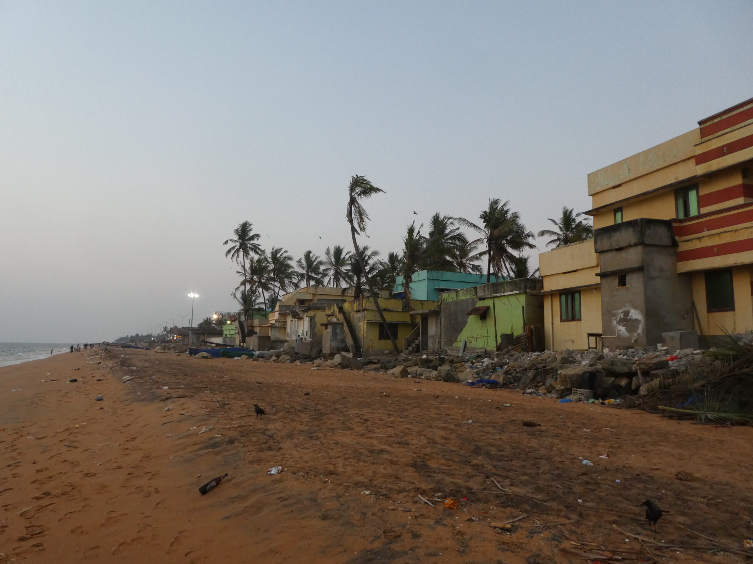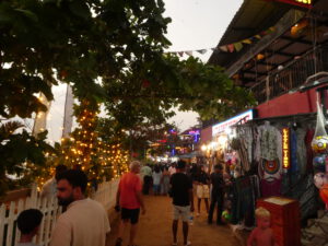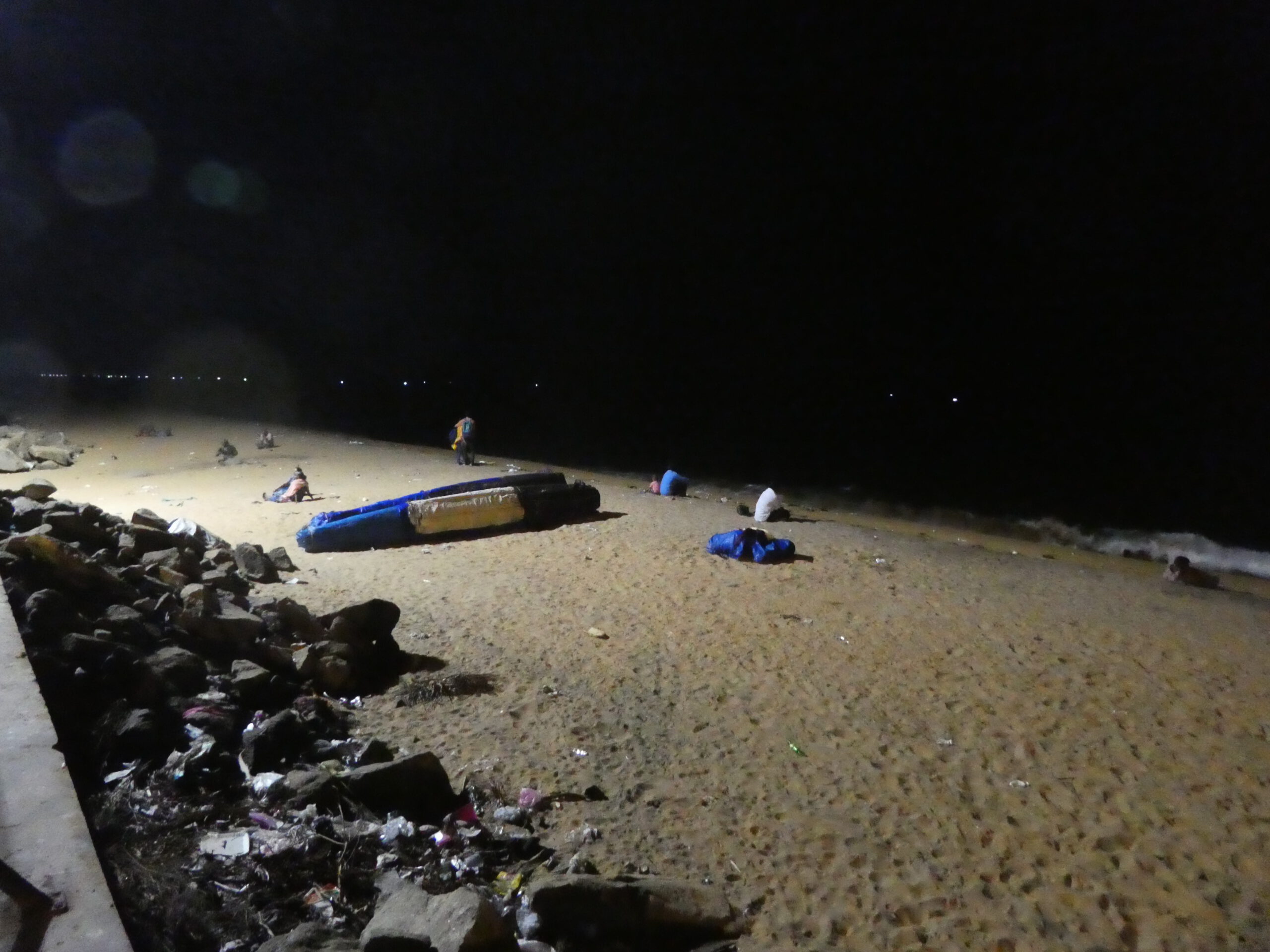 Zum Essen müssen wir ausgehen, der kürzeste Weg zu den Restaurants führt am Strand entlang. Hier sieht es einfach schrecklich aus, etliche Häuser sind so beschädigt, dass sie unbewohnbar geworden sind – und doch haben einige Menschen hier Unterschlupf gefunden. Der ganze Strand ist voller Müll, doch das kümmert niemanden. Als wir vom Essen zurückkommen, laufen wir in der Dunkelheit an Menschen vorbei, die im Sand sitzen oder liegen und der langen Lichterkette der Fischerboote zusehen, richtig romantisch.