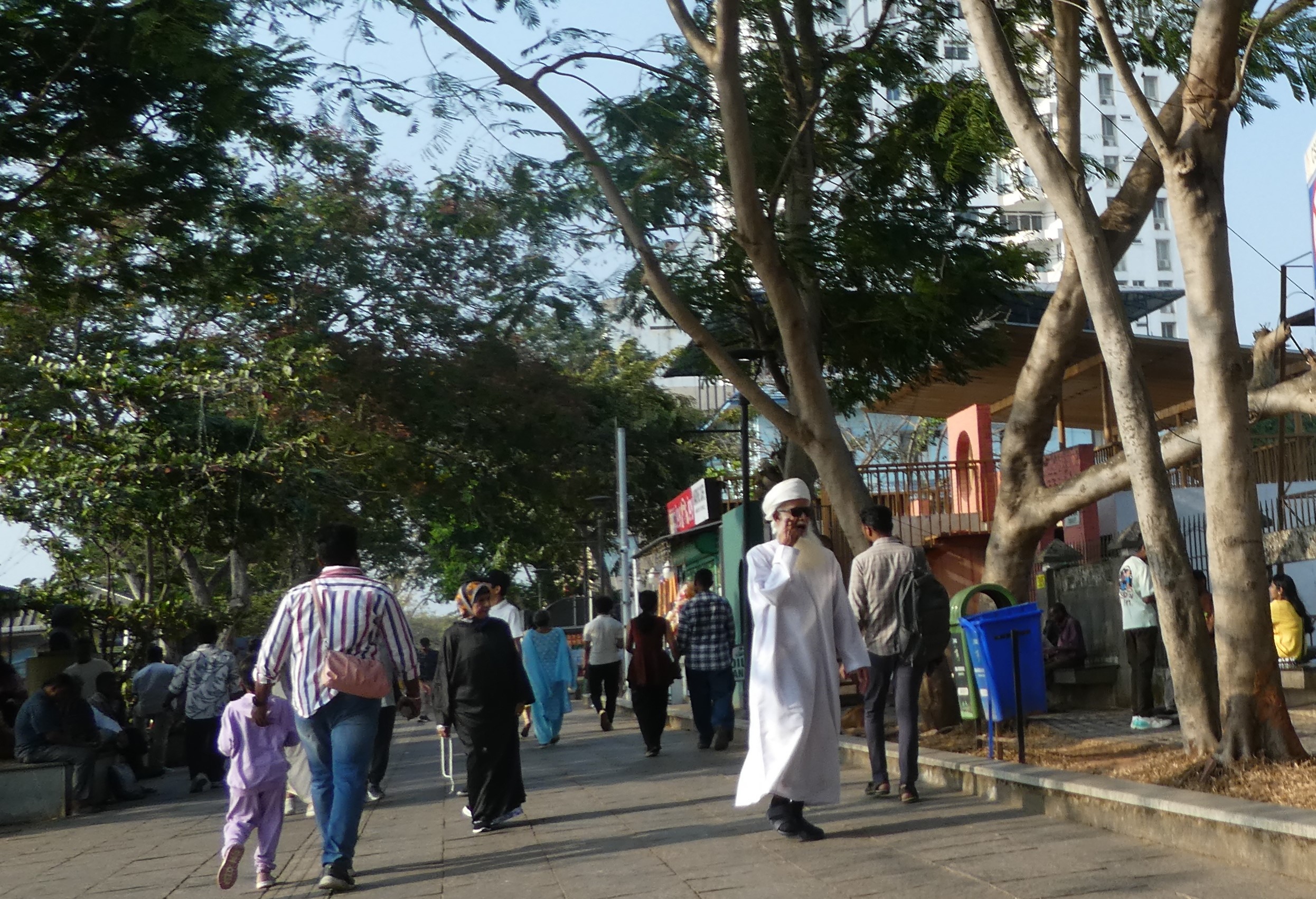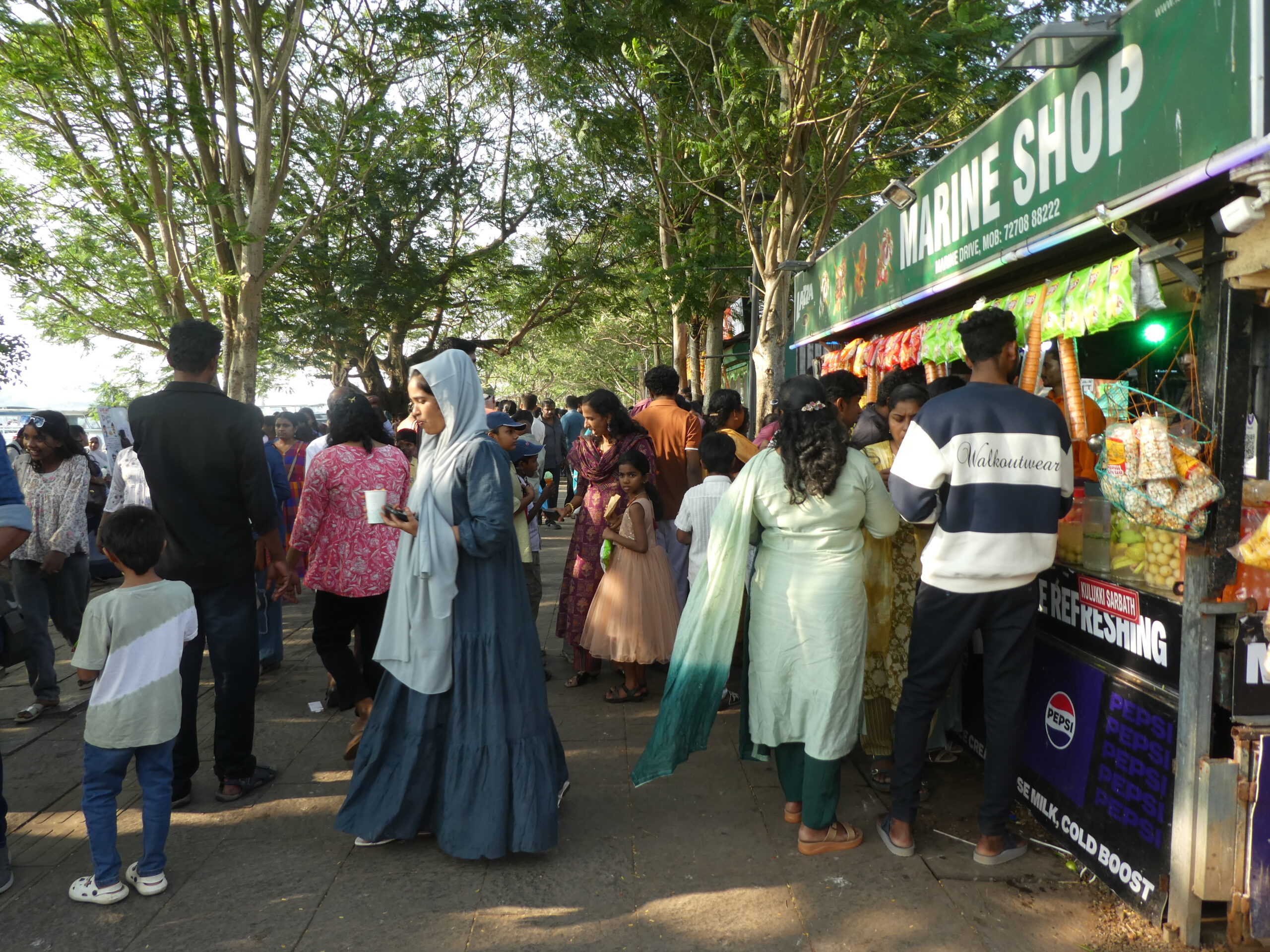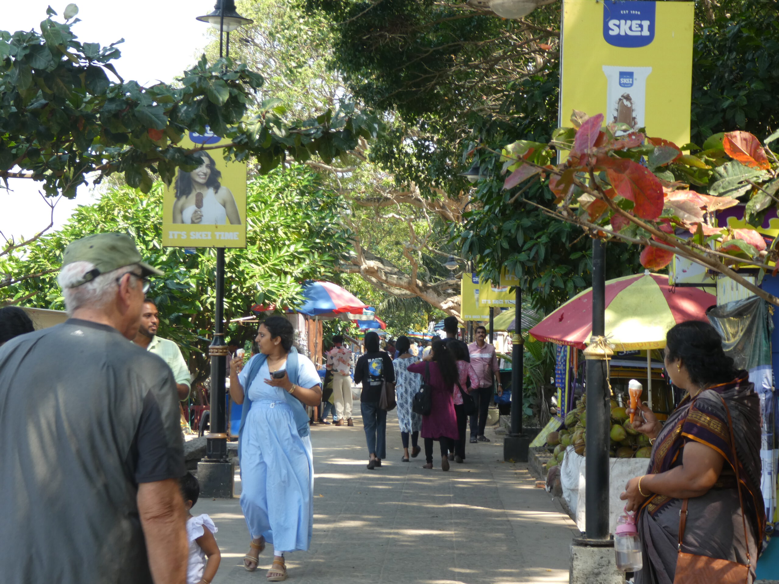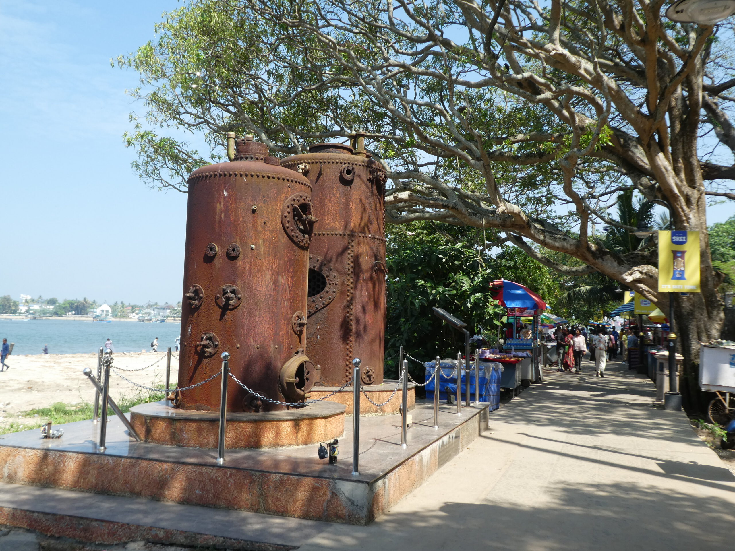 Kurze Zeit später sind wir an der Promenade. Dicht an dicht stehen hier Verkaufsstände und alle bieten Eis an. Die Promenade – gesäumt von Verkaufsständen – erstreckt sich im weitem Bogen nach Osten. Hier herrscht ein unglaublicher Betrieb in beide Richtungen, aber man wird nicht belästigt. Zwei rostige Dampfkessel, die früher für die Hafenkräne gebraucht wurden, sind heute ein beliebtes Fotomotiv. Die Inder sind äußerst rücksichtsvoll, sobald jemand fotografiert, bleiben sie stehen und warten oder laufen um den Menschen mit Kamera herum.