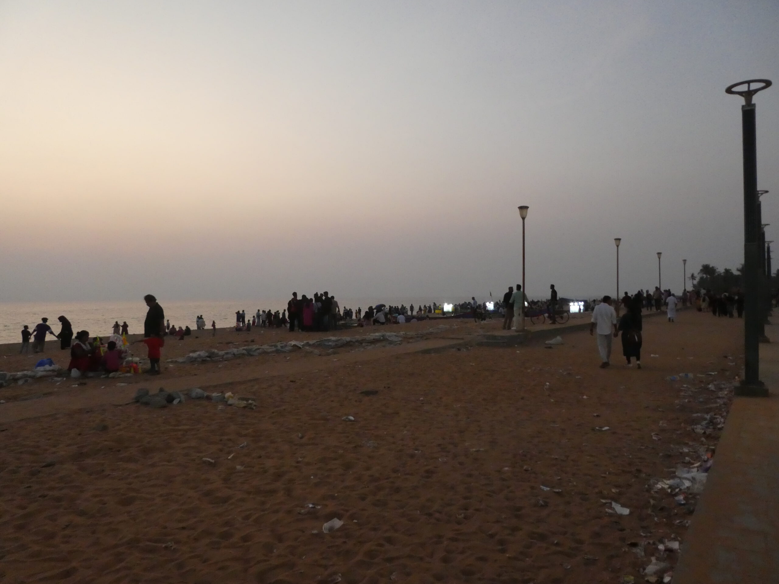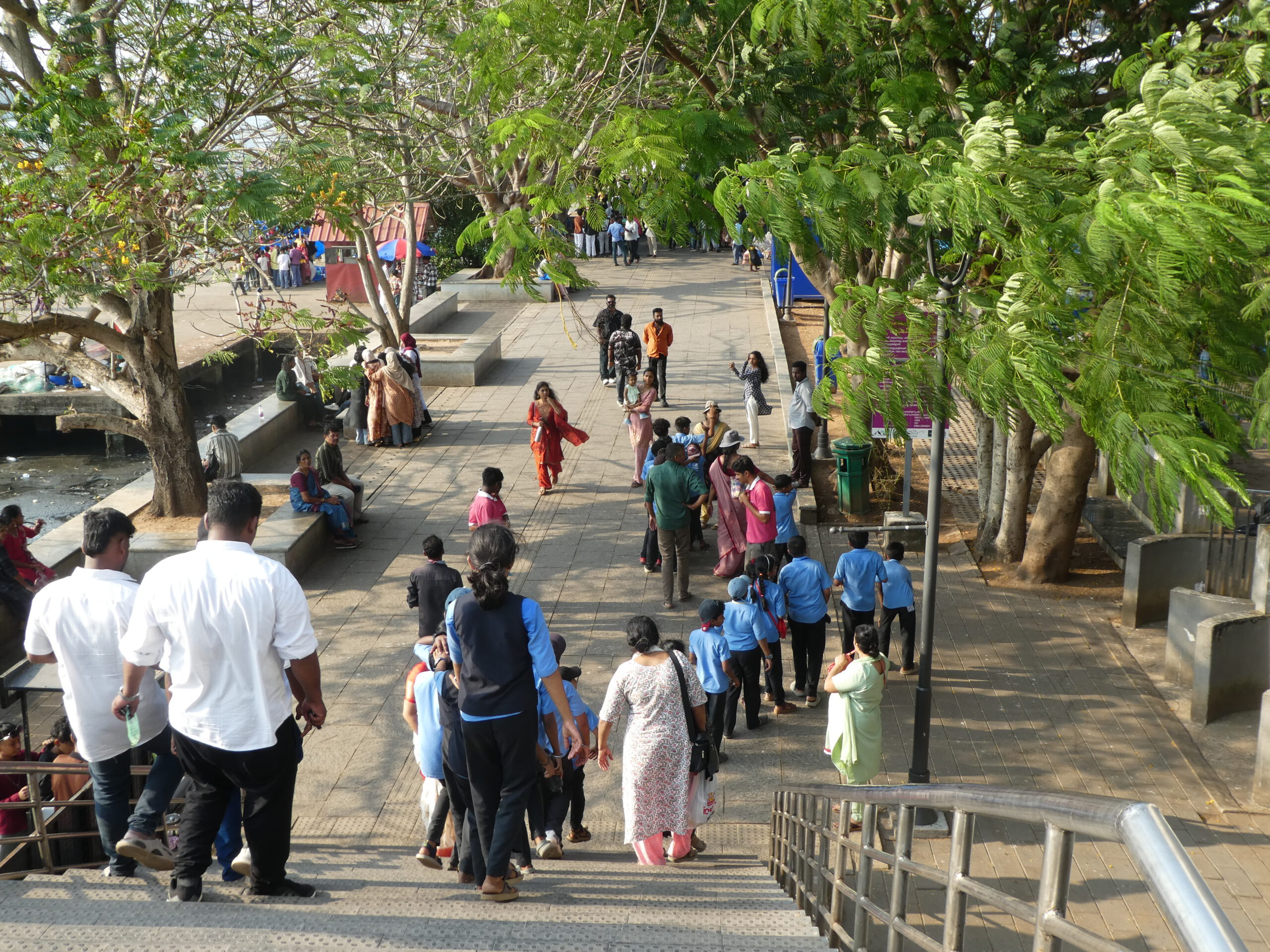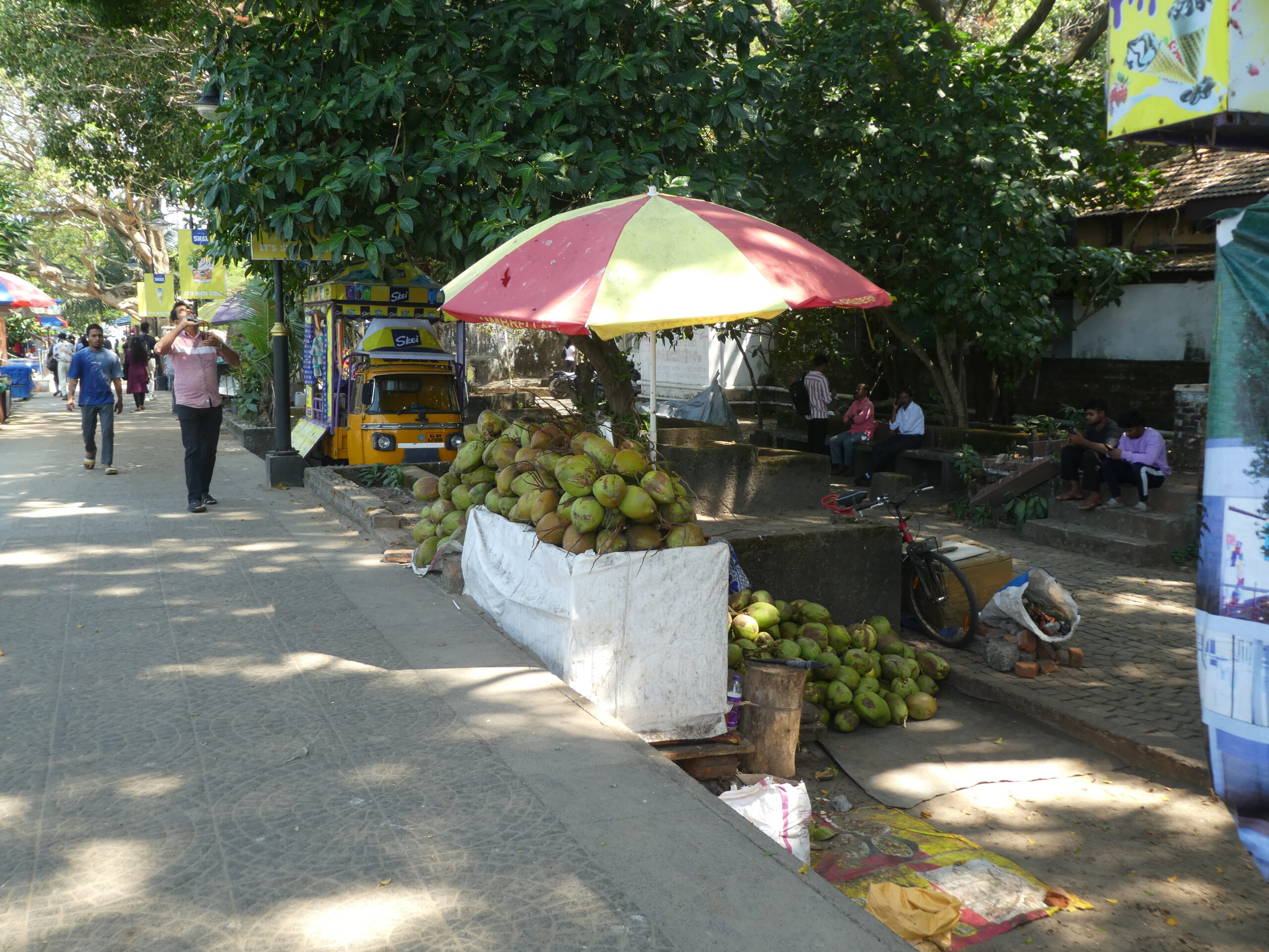 Kurze Zeit später sind wir an der Promenade. Dicht an dicht stehen hier Verkaufsstände und alle bieten Eis an. Die Promenade – gesäumt von Verkaufsständen – erstreckt sich im weitem Bogen nach Osten. Hier herrscht ein unglaublicher Betrieb in beide Richtungen, aber man wird nicht belästigt. Zwei rostige Dampfkessel, die früher für die Hafenkräne gebraucht wurden, sind heute ein beliebtes Fotomotiv. Die Inder sind äußerst rücksichtsvoll, sobald jemand fotografiert, bleiben sie stehen und warten oder laufen um den Menschen mit Kamera herum.