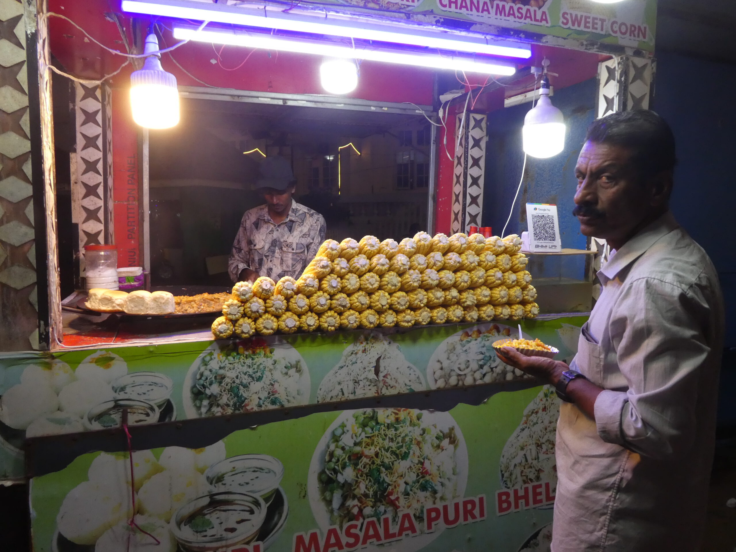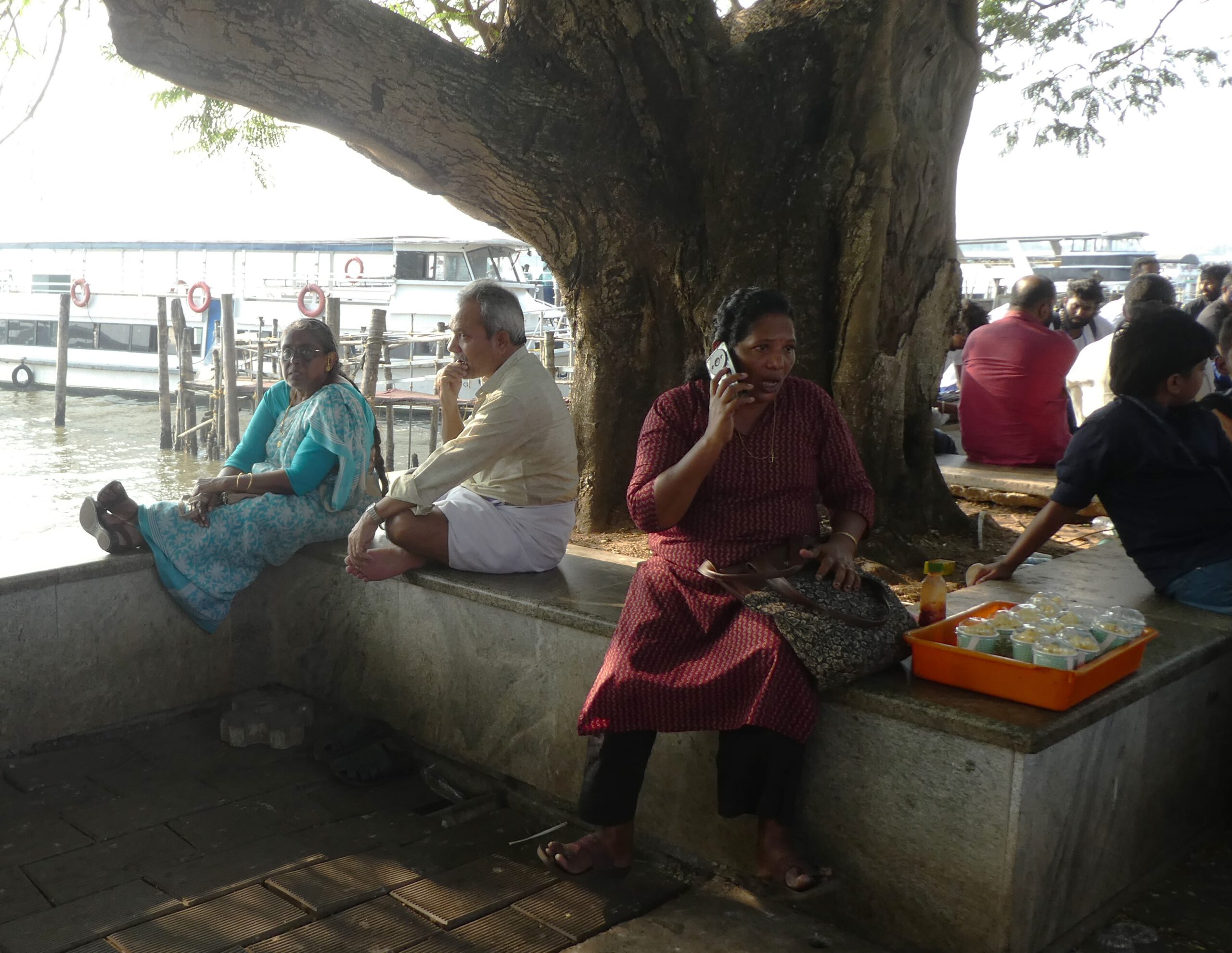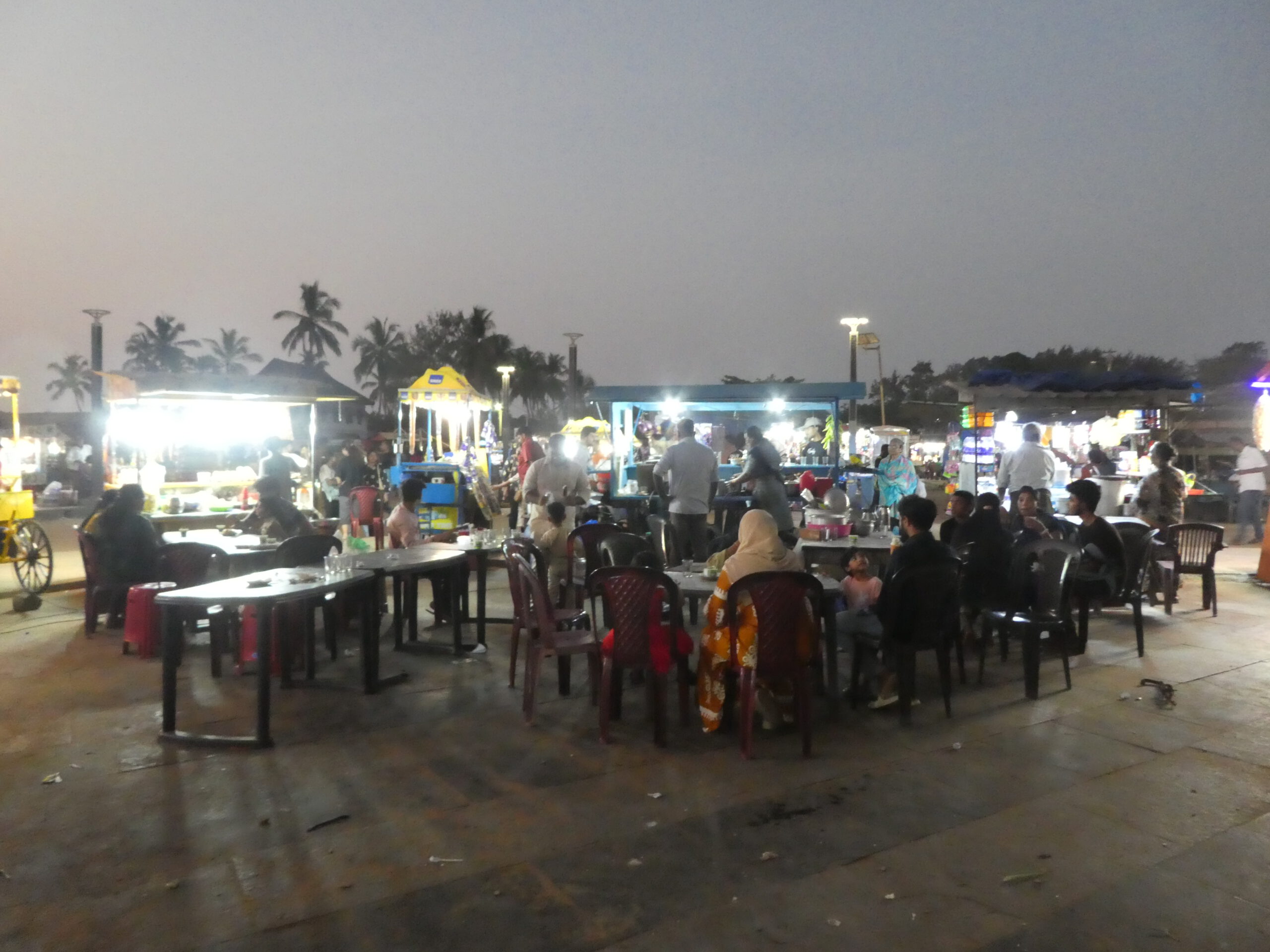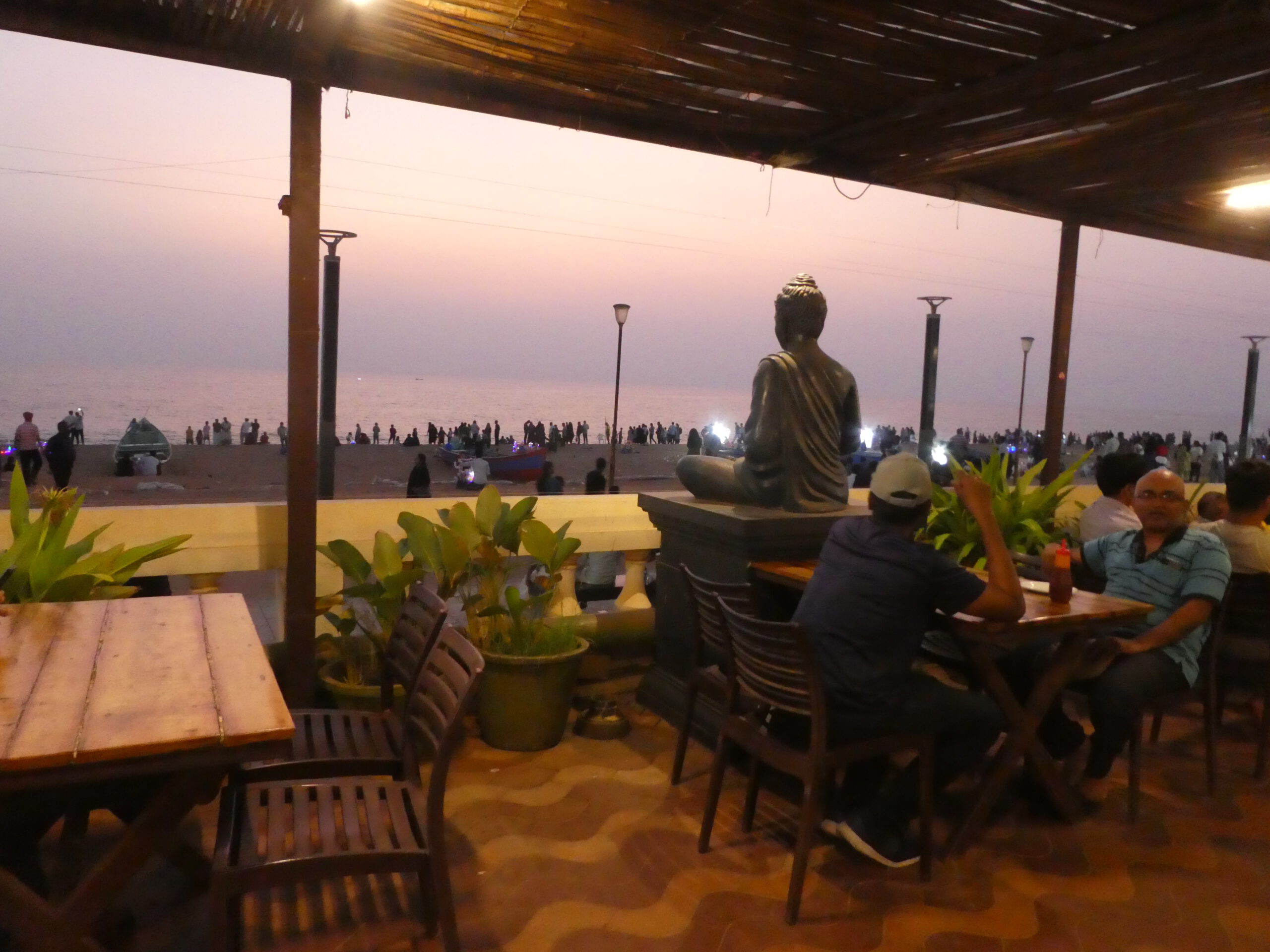 Kurze Zeit später sind wir an der Promenade. Dicht an dicht stehen hier Verkaufsstände und alle bieten Eis an. Die Promenade – gesäumt von Verkaufsständen – erstreckt sich im weitem Bogen nach Osten. Hier herrscht ein unglaublicher Betrieb in beide Richtungen, aber man wird nicht belästigt. Zwei rostige Dampfkessel, die früher für die Hafenkräne gebraucht wurden, sind heute ein beliebtes Fotomotiv. Die Inder sind äußerst rücksichtsvoll, sobald jemand fotografiert, bleiben sie stehen und warten oder laufen um den Menschen mit Kamera herum.