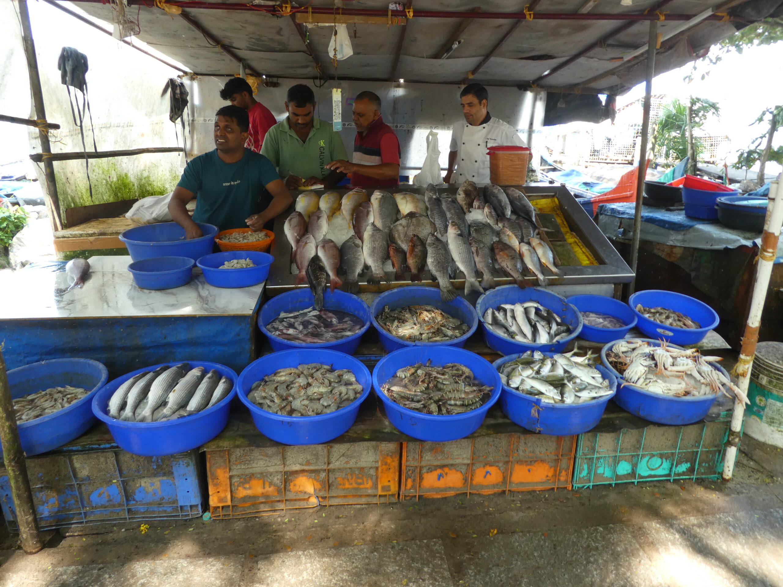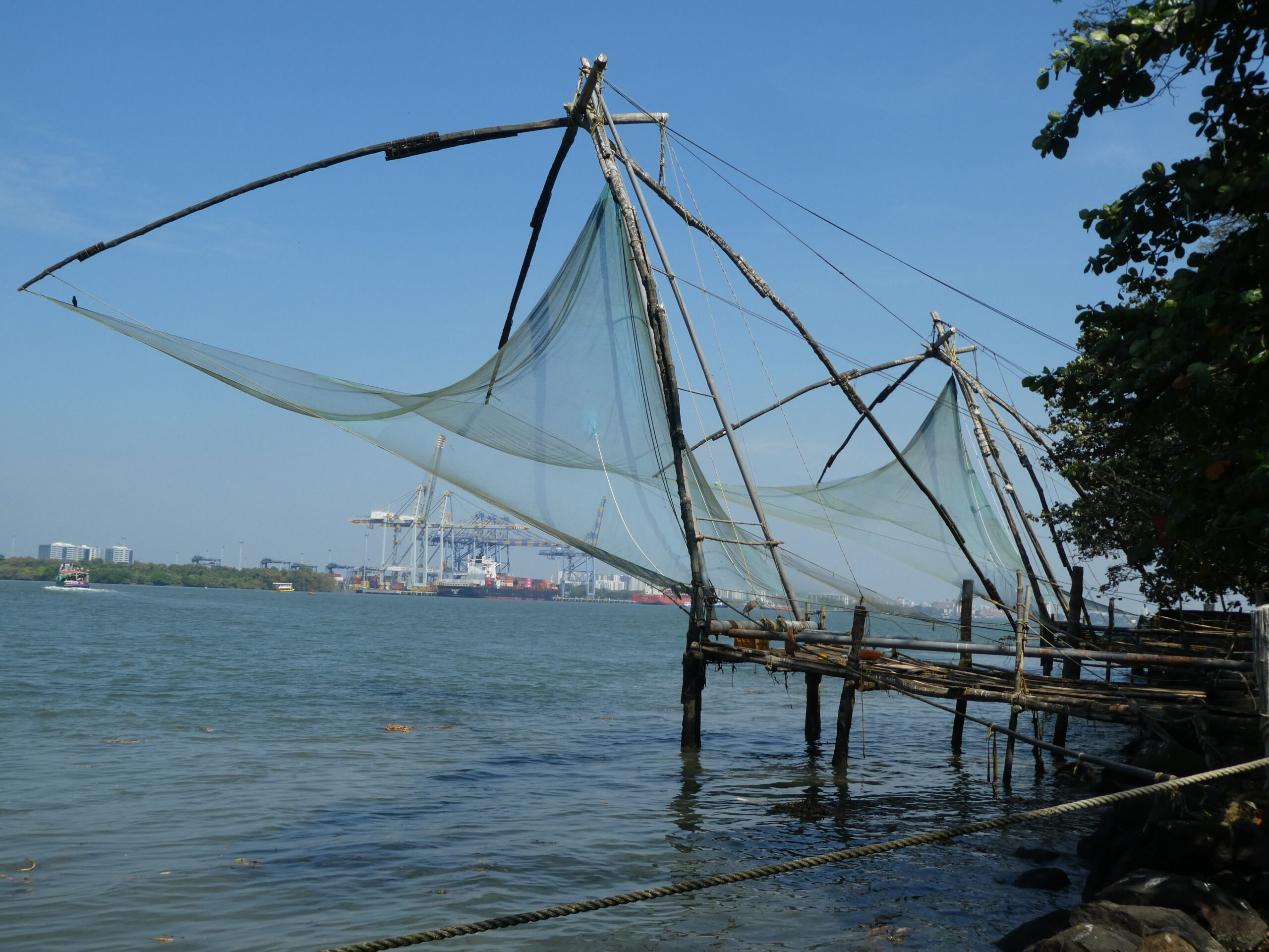Müllsammler sind am Strand unterwegs, die sind auch bitter nötig, der Strand ist unglaublich verschmutzt. Das hindert ein paar Fischer jedoch nicht daran, mit ihren Wurfnetzen ins Wasser zu gehen. Besser haben es diejenigen, die eins der rund ein Dutzend chinesischen Netze besitzen. Das ist eine massive Holzkonstruktion mit breiter Plattform, ein großes quadratisches Netz wird kurz ins Wasser gelassen und nach ein paar Minuten von drei bis sechs Männern wieder herausgezogen. Die darin gefangenen Fische und Krebse werden direkt am Steg oder an der Promenade verkauft. Damit kann man in ein nahe gelegenes Restaurant marschieren und sich den frischen Fisch nach Wunsch zubereiten lassen. Das Netz wird gleich wieder heruntergelassen, dank einer raffinierten Konstruktion mit großen Steinen genügt dazu ein einzelner Mann. Sobald das Netz wieder nach oben gezogen wird, stürzt sich eine Schar weißer Reiher auf den Fang. Solange es sich nur um kleine Fische handelt, lassen die Fischer sie gewähren.