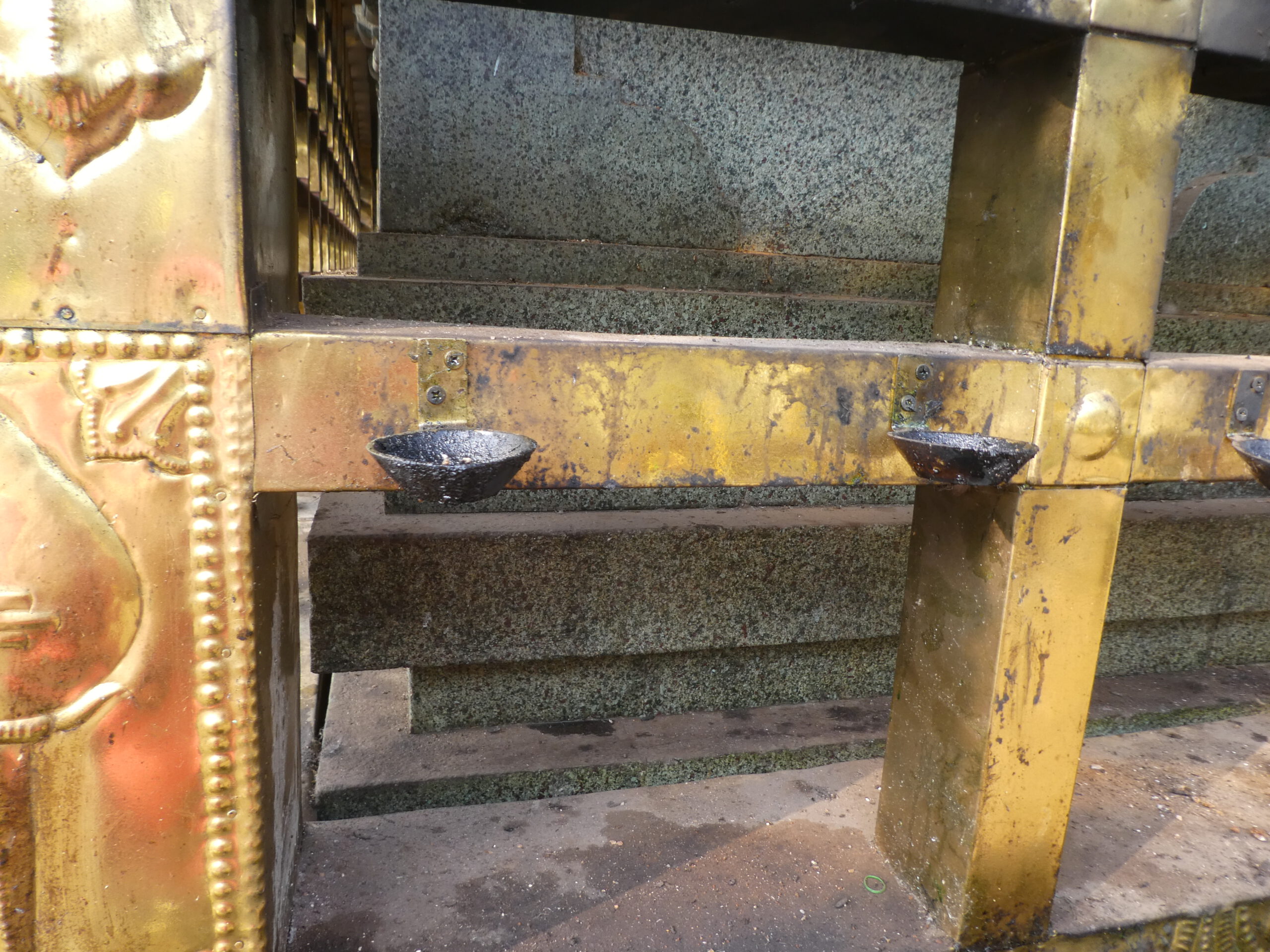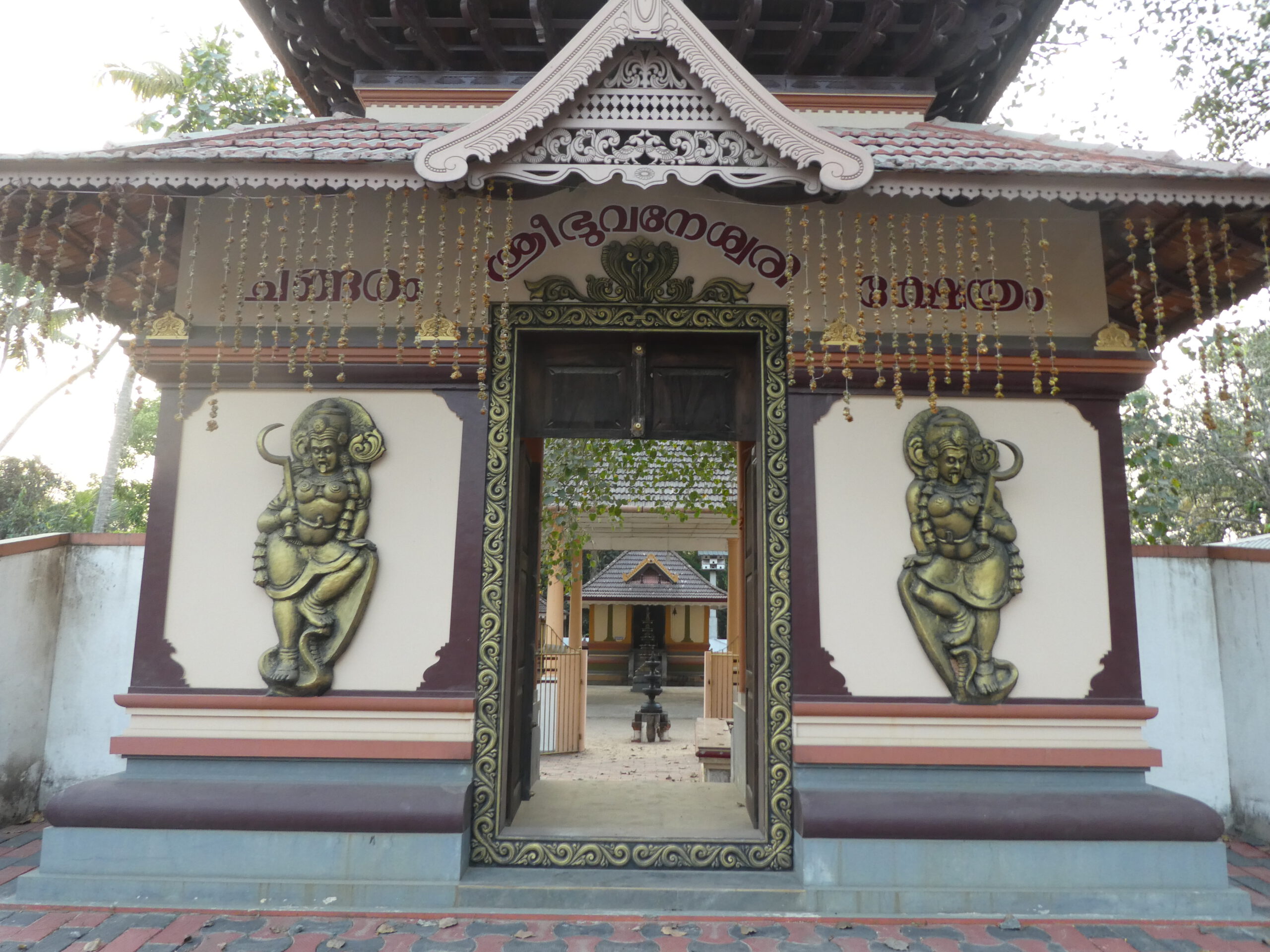 Nächster Halt ist am Thirumala Devaswom Tempel, ein sehr bedeutender und wichtiger Bau, der bereits 1599 vollendet worden ist. Nur Hindus der höheren Ordnung dürfen diesen Ort besuchen. Wenigstens ist das gegenüber im Tempelteich stehende Häuschen mit dem Kupferdach ein schönes Fotomotiv. Die beiden Tempel für die Gottheiten Kuh und Löwe in der Nähe sind dagegen für alle Hindus zugänglich. Direkt nach diesem Foto verweigert meine Kamera ihren Dienst, die Batterie ist schlagartig leer.