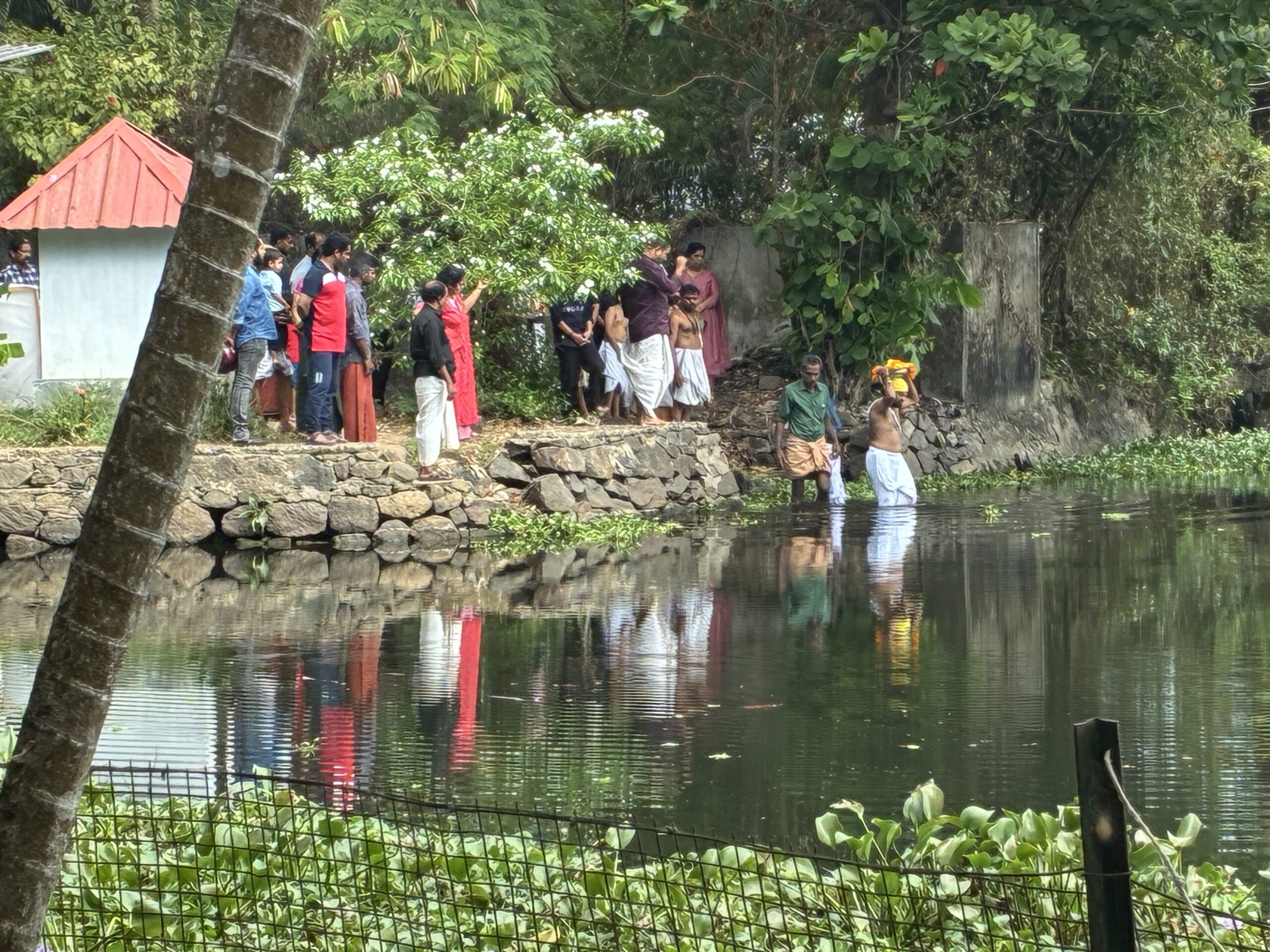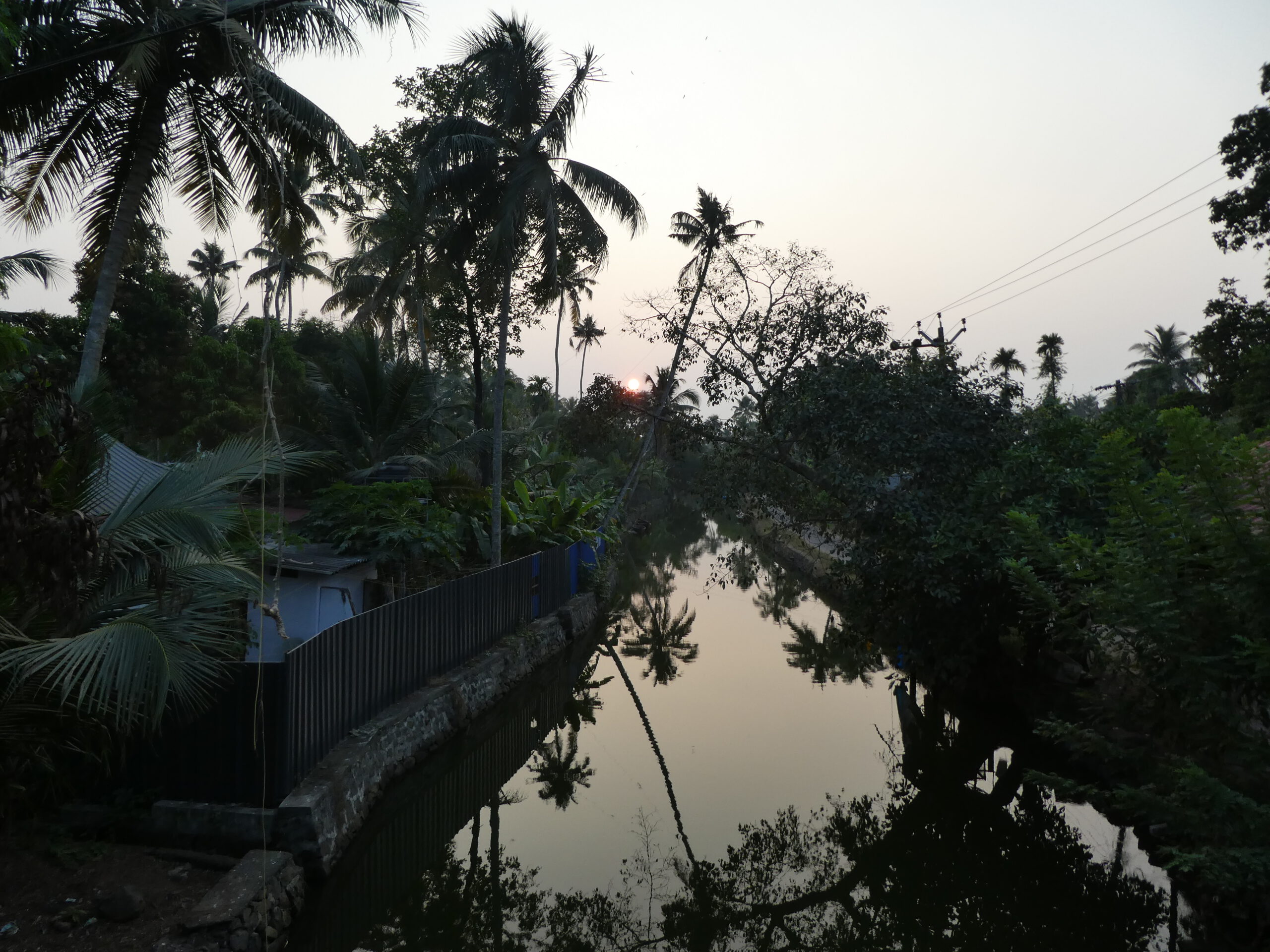 Nur eine schmale Stichstraße trennt das Grundstück vom Flußufer. Während eines Spazierganges schauen wir uns in der Umgebung um. Elegante Häuser, ein paar Homestays und winzige einstöckige Häuschen wechseln sich ab. Ein Stück weiter zweigt ein Kanal ab und noch ein paar hundert Meter weiter steht ein kleiner schmuckloser Devi-Tempel (Devi = universelle Muttergöttin im Hinduismus), die „Energiequelle“ des Ortes. Als wir auf dem Rückweg sind, kommen einige Frauen, um die Lampen anzuzünden, damit die Energie der Göttin lebendig gehalten wird.