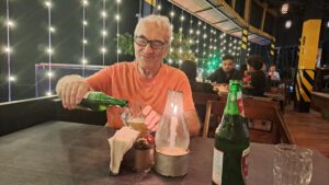 Auf die Frage nach Trinkgläsern geht unsere Wirtin zu einem Wasserbecken, greift sich zwei benutzte Gläser, schwenkt sie aus und stellt sie neben unsere Teller. So geht das also. Wir sind gespannt, es schmeckt wirklich gut, aber die ungewohnte Schärfe lässt die Augen und Nase laufen. Servietten gibt es nicht, aber auf der Spüle steht ein Kasten mit DINA5 großen, etwas steifen Papierblättern, die müssen reichen. Wir beschließen, uns auf dem Rückweg aus dem nahegelegenen Supermarkt ein Bier mitzunehmen. Aber hier gibt es auch kein Bier. So feiern wir unsere Ankunft später auf der Terrasse mit Mango-Trinkjoghurt und gehen früh schlafen.