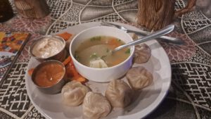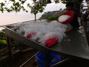 Varkala ist ein Besuchermagnet, selbst aus Tamil Nadu reisend die Menschen an. Wenn die bunt bemalten Busse irgendwo stehen wissen wir, die kommen aus dem benachbarten Bundesstaat. Der Besuch hier setzt respektvolles Verhalten und angemessene Kleidung voraus, doch das haben nicht alle Touristen mitbekommen. Eigentlich sind wir von solchen Orten nicht besonders angetan, aber es hat auch Vorteile. Hier sprechen fast alle Menschen englisch, es gibt Bier und die Auswahl an Restaurants ist überwältigend. In vielen wird frischer Fisch angeboten, sogar zwei große Schwertfische liegen auf Eis. An einem Abend gehen wir in ein tibetanisches Restaurant und sind total begeistert. Klaus isst Datchi, ein Rindfleischgericht, das mit fermentierter Milch zubereitet wird und nach Gorgonzola schmeckt. Ich habe mich für Momos entschieden, mit Kartoffeln und Käse gefüllte Teigtaschen, die mit einer Schale Brühe und zwei Soßen serviert werden. Wir sind überaus zufrieden. Bei der Frühstücksauswahl fallen wir in westliche Gewohnheiten zurück. So lecker die Currys sind, hier wählen wir Toast, Eier und auch mal Bananenpfannkuchen.