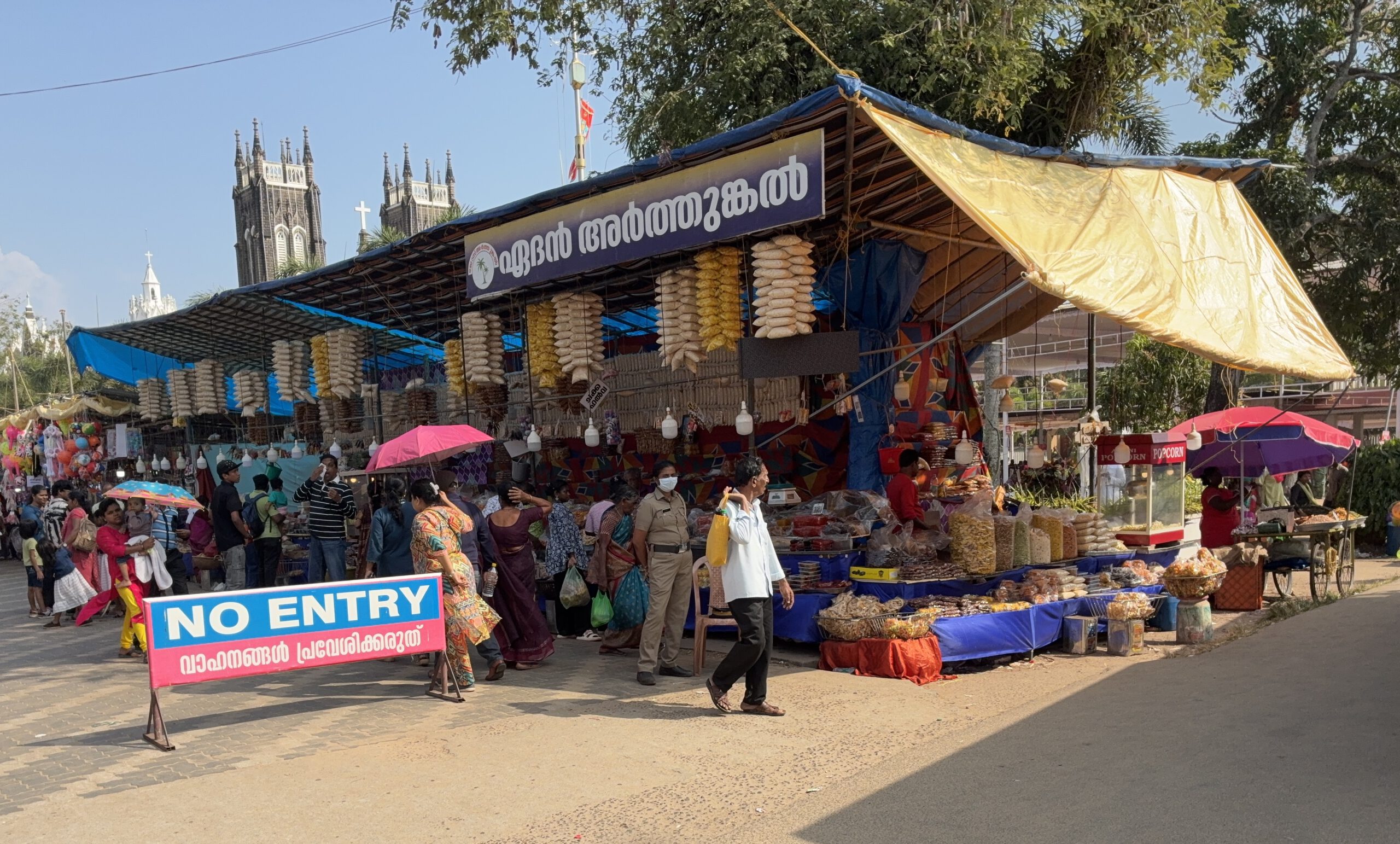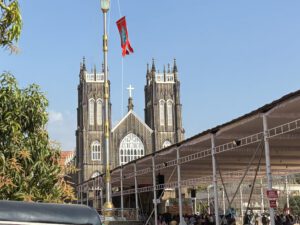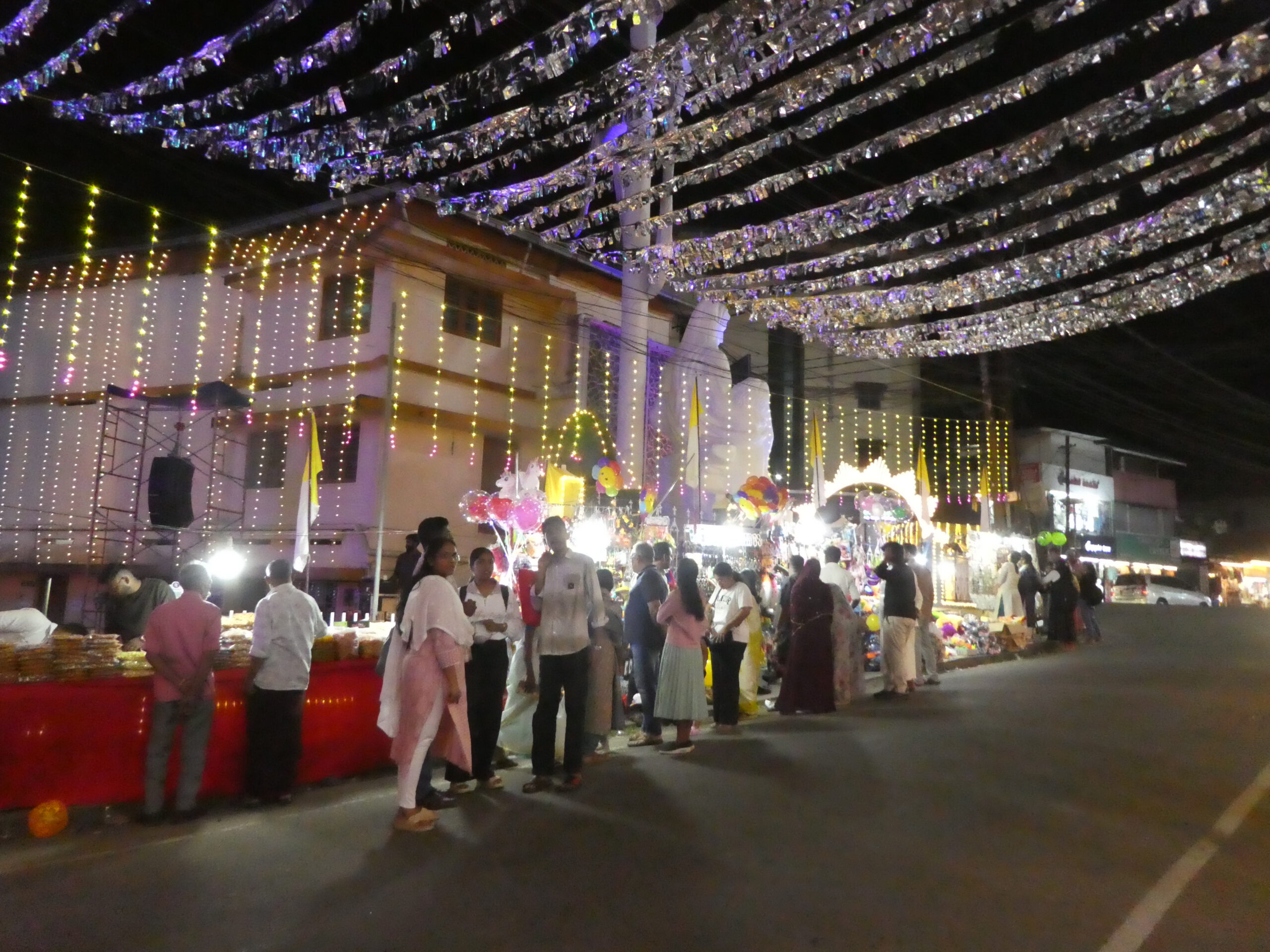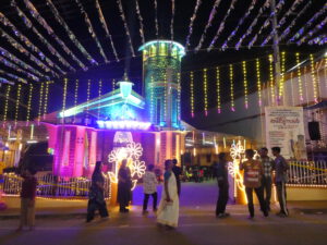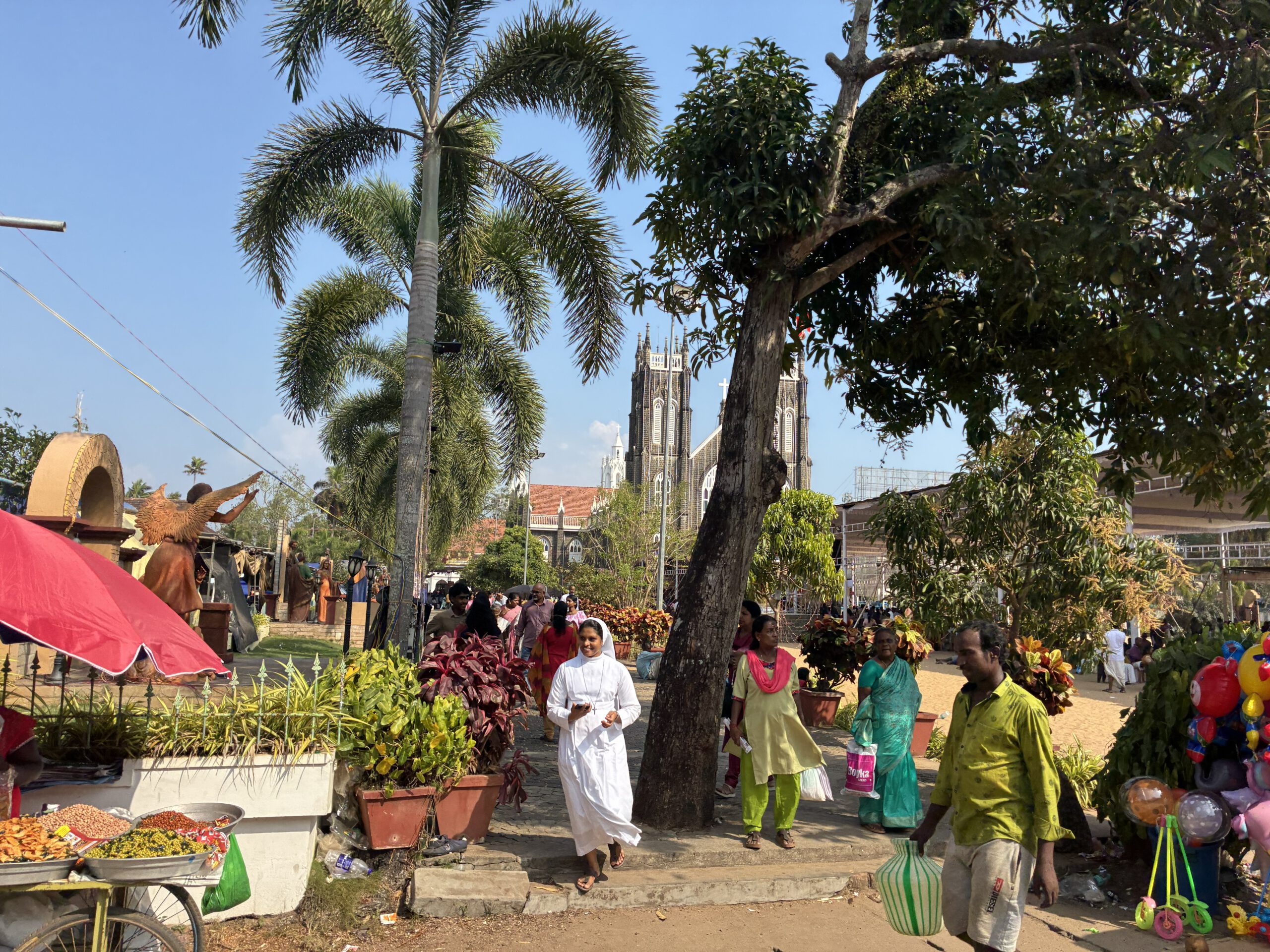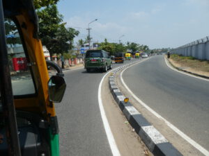 In der Umgebung der Klinik befindet sich kein einziges Uber-Fahrzeug, während wir noch beratschlagen, hält eine Rikscha (Tuk Tuk) vor dem Eingang. Das Fahrzeug hat sogar einen Kofferraum, in dem unser Gepäck Platz findet. Tuckernd schlängelt sich der Fahrer durch den Verkehr und wir bedauern nur, dass auf dem Tischchen vor unserer Bank jetzt kein nettes Getränk steht. Bisher sind wir nirgends durch unbewohnte Gegenden gekommen, aber die 1,4 Mrd. Menschen in Indien brauchen schließlich Platz. Auf der linken Straßenseite großes Remmi-Demmi, hier sehen wir mal ein christliches Fest. Vor der großen Kirche sind dicht an dicht Buden aufgebaut, wo man all das kaufen kann, was es bei uns auch auf einer Kirmes gibt, nur dem hiesigen Geschmack angepasst.