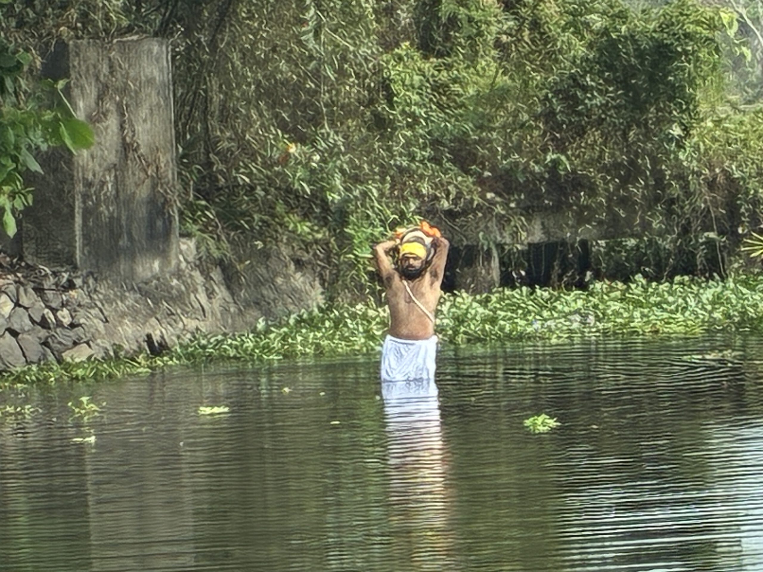 Es ist Sonntag, da wird nicht gefischt. Die Boote transportieren heute nur Menschen, die zu dem Tempel wollen , der unserem Homestay gegenüber steht. Drei Männer steigen nacheinander in den Kanal und begießen ihre Köpfe mit dem Wasser. Es dient der spirituellen Reinigung oder dem Abwaschen von Sünden. Ich bin skeptisch, ob das mit diesem dreckigen Wasser funktioniert.