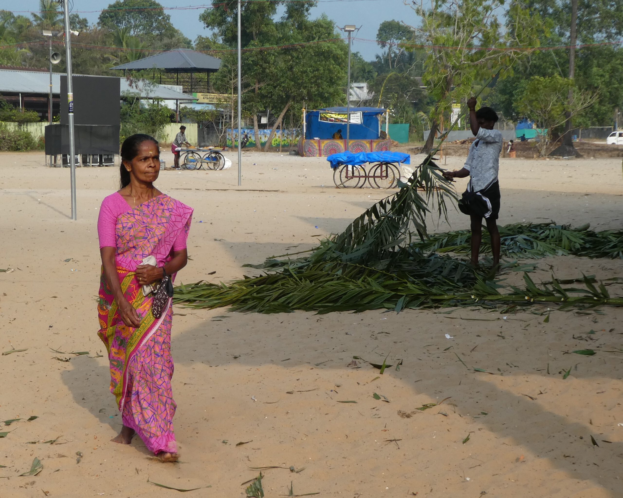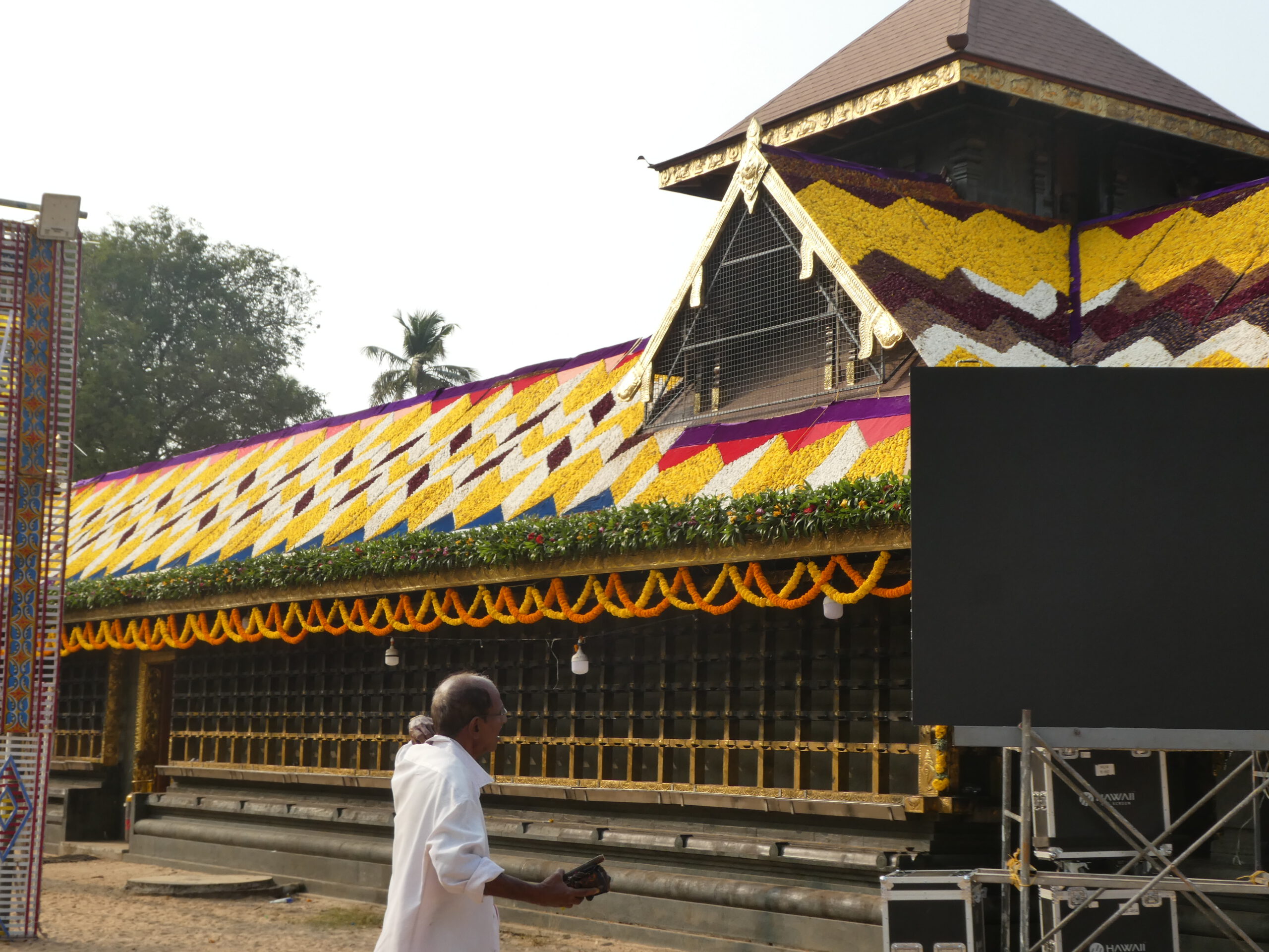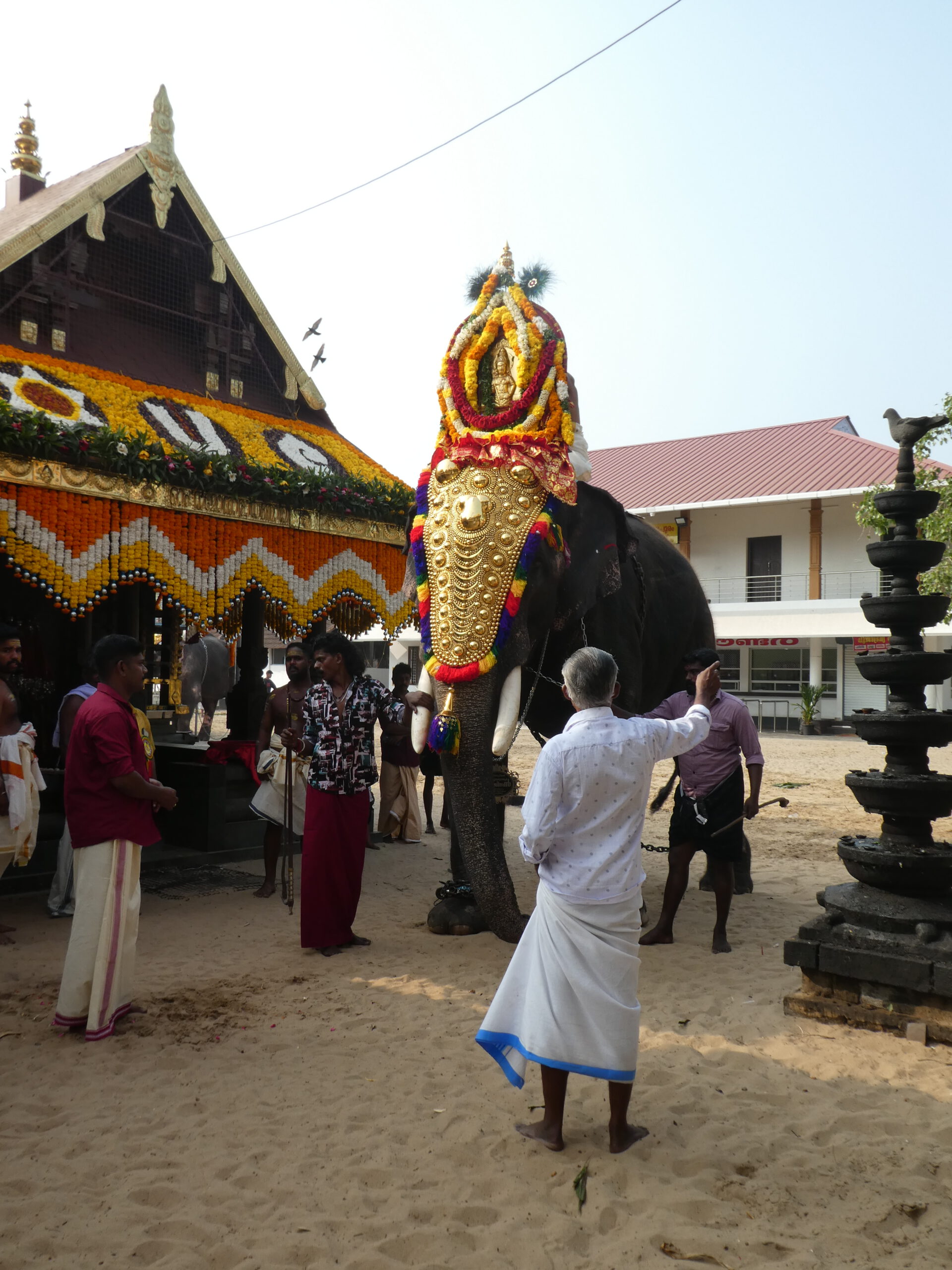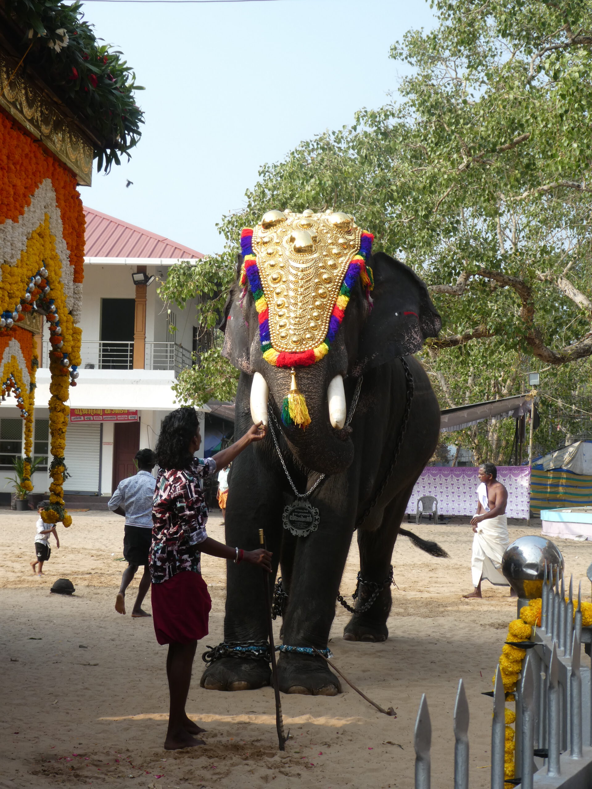 Am Samstag verkündet Anshad, unser Gastgeber, dass heute Tempelfest sei, und wir uns das unbedingt ansehen müssen. Jedes Tempelfest wird einmal im Jahr an dem Tag gefeiert, an dem der Bau geweiht worden ist. Wir sind immer noch unsicher, was Nichtgläubige im Hinduismus dürfen und was nicht. Doch die strikte Ausgrenzung scheint nur für die Tempel der höchsten Kategorie zu gelten. Um 16.00 Uhr holt uns ein Fahrer mit einer „Magic Iris“, einem putzigen kleinen Auto von Tata ab, nur um kurz darauf wieder umzukehren und noch zwei Gäste aus unserem Homestay mitzunehmen. Ein paar Kilometer weiter steht der Tempel und andere Gebäude auf einem großen sandigen Platz. Ein mit goldenem Nettipattam (Stirnschmuck) geschmückter Elefant in Ketten wartet vor dem blumengeschmückten Tempel darauf, dass ein Priester oder Würdenträger aufsteigt und das blumengeschmückte Schild übernimmt.