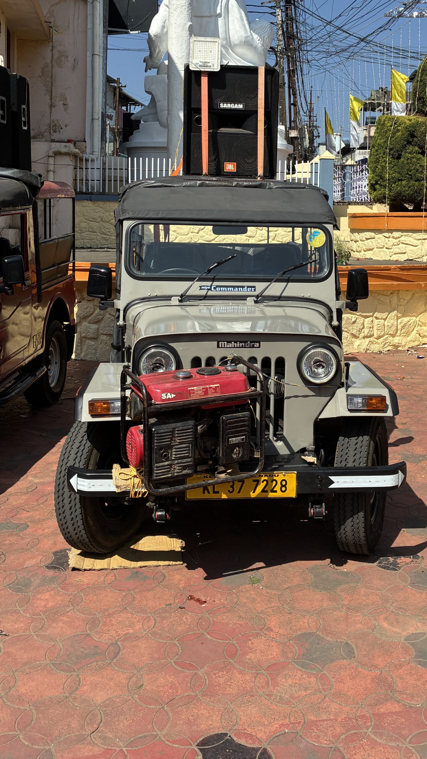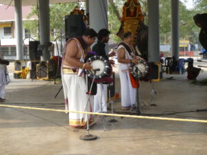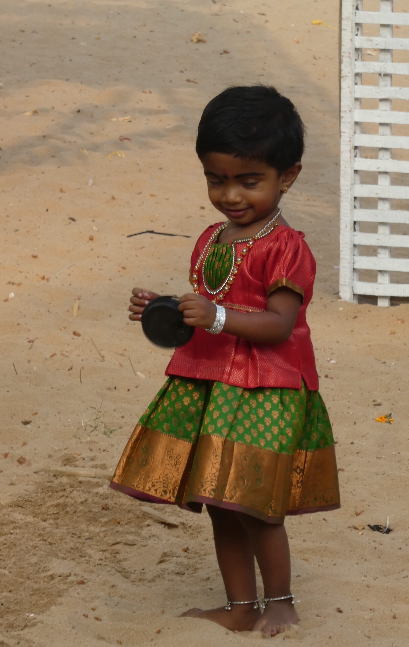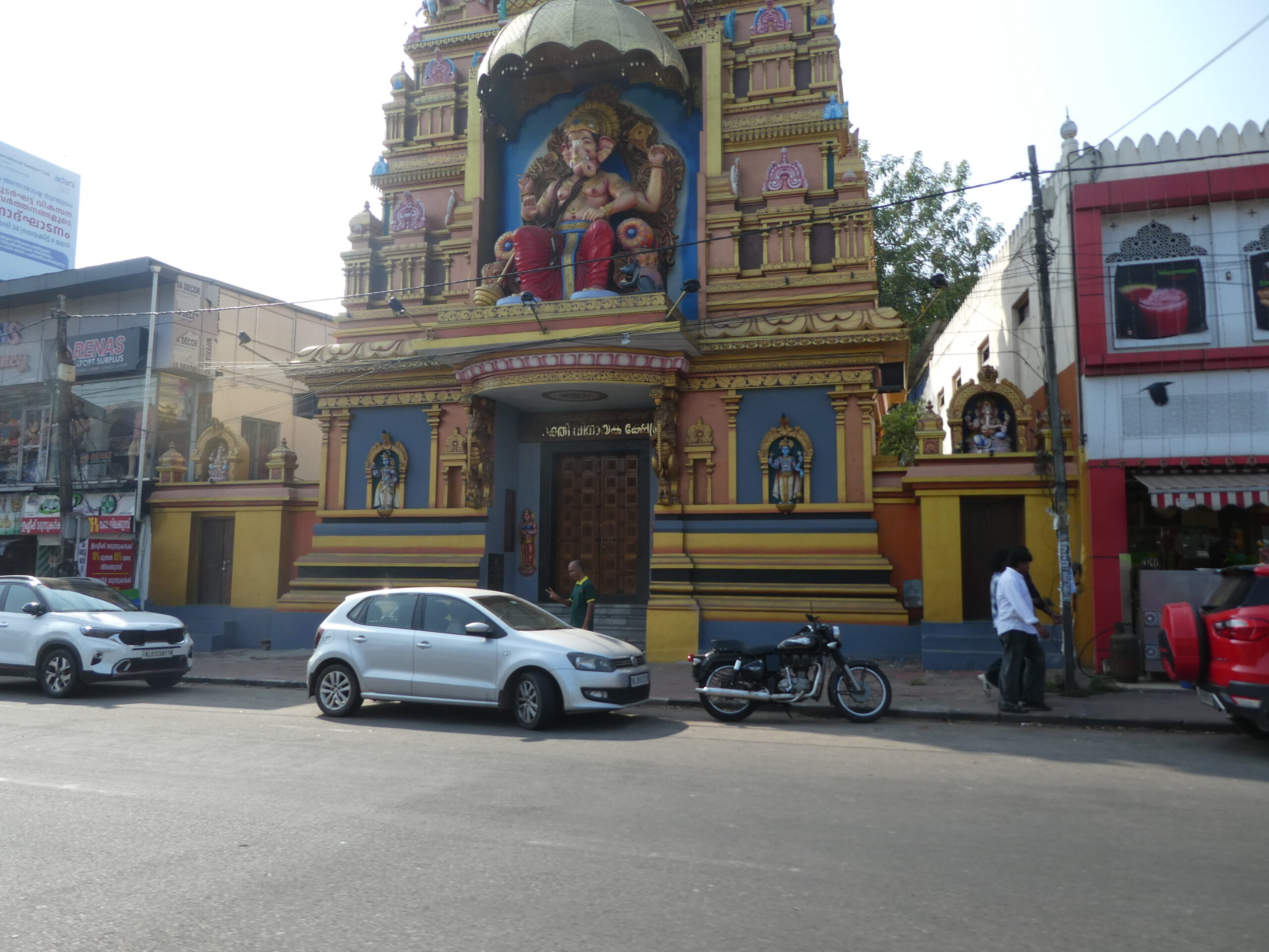 Am Samstag verkündet Anshad, unser Gastgeber, dass heute Tempelfest sei, und wir uns das unbedingt ansehen müssen. Jedes Tempelfest wird einmal im Jahr an dem Tag gefeiert, an dem der Bau geweiht worden ist. Wir sind immer noch unsicher, was Nichtgläubige im Hinduismus dürfen und was nicht. Doch die strikte Ausgrenzung scheint nur für die Tempel der höchsten Kategorie zu gelten. Um 16.00 Uhr holt uns ein Fahrer mit einer „Magic Iris“, einem putzigen kleinen Auto von Tata ab, nur um kurz darauf wieder umzukehren und noch zwei Gäste aus unserem Homestay mitzunehmen. Ein paar Kilometer weiter steht der Tempel und andere Gebäude auf einem großen sandigen Platz. Ein mit goldenem Nettipattam (Stirnschmuck) geschmückter Elefant in Ketten wartet vor dem blumengeschmückten Tempel darauf, dass ein Priester oder Würdenträger aufsteigt und das blumengeschmückte Schild übernimmt.