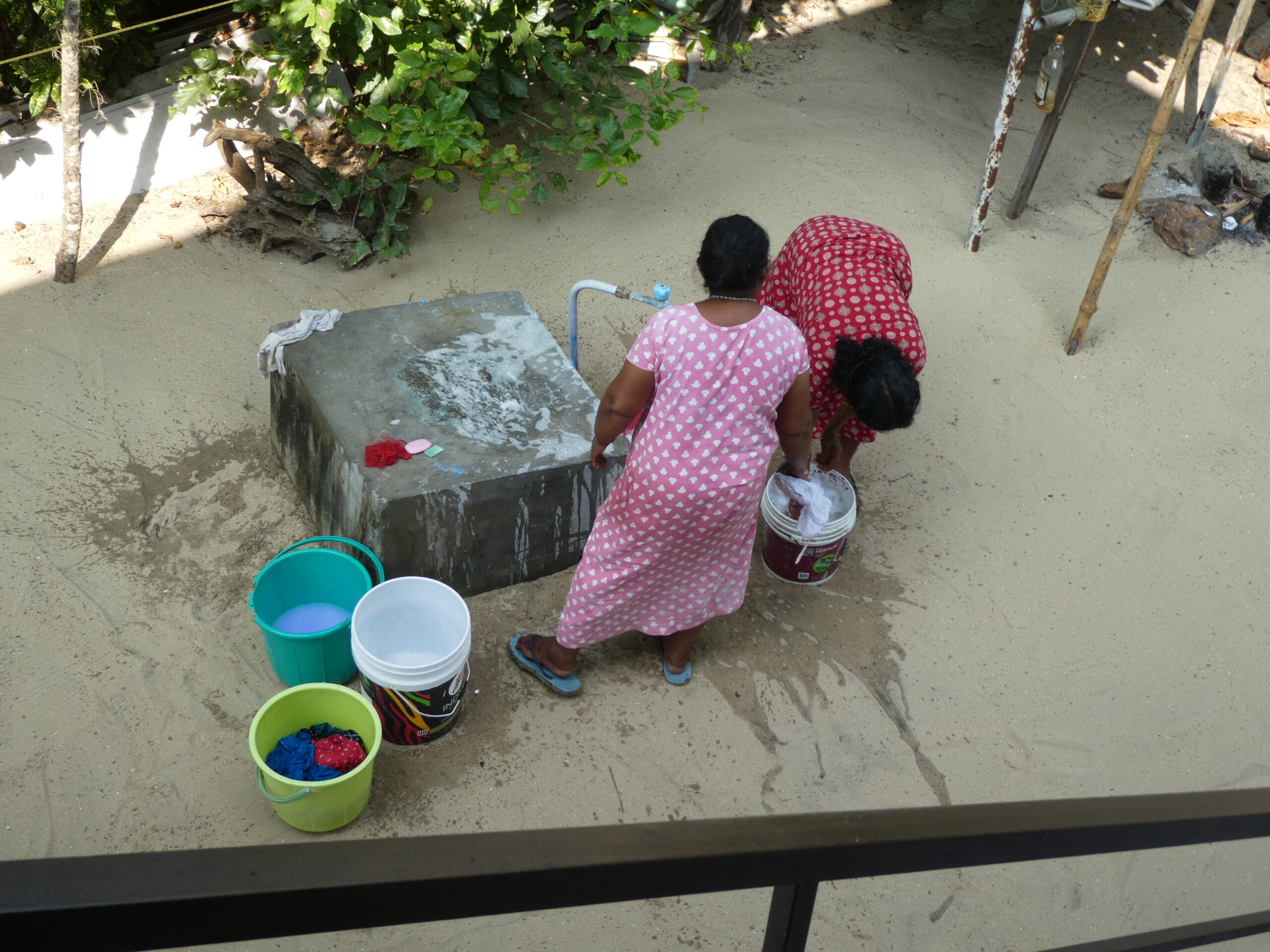 Als wir zurück zu unserer Unterkunft kommen, zeigt uns Mery, die Mutter der Besitzer, die Außendusche und spült mit einem Eimer Wasser unsere Füße ab. So schleppen wir wenigstens nicht den ganzen Sand ins Zimmer, doch beim Duschen fällt immer noch genug aus der Badekleidung.