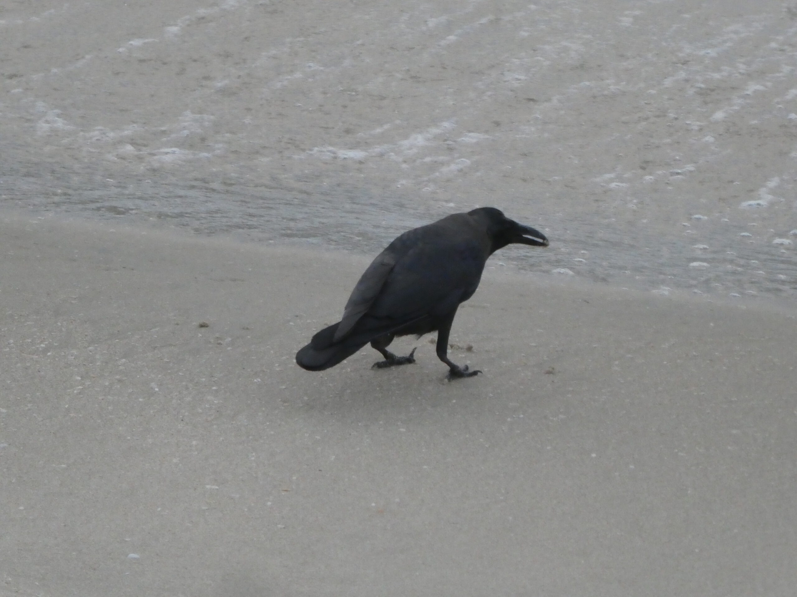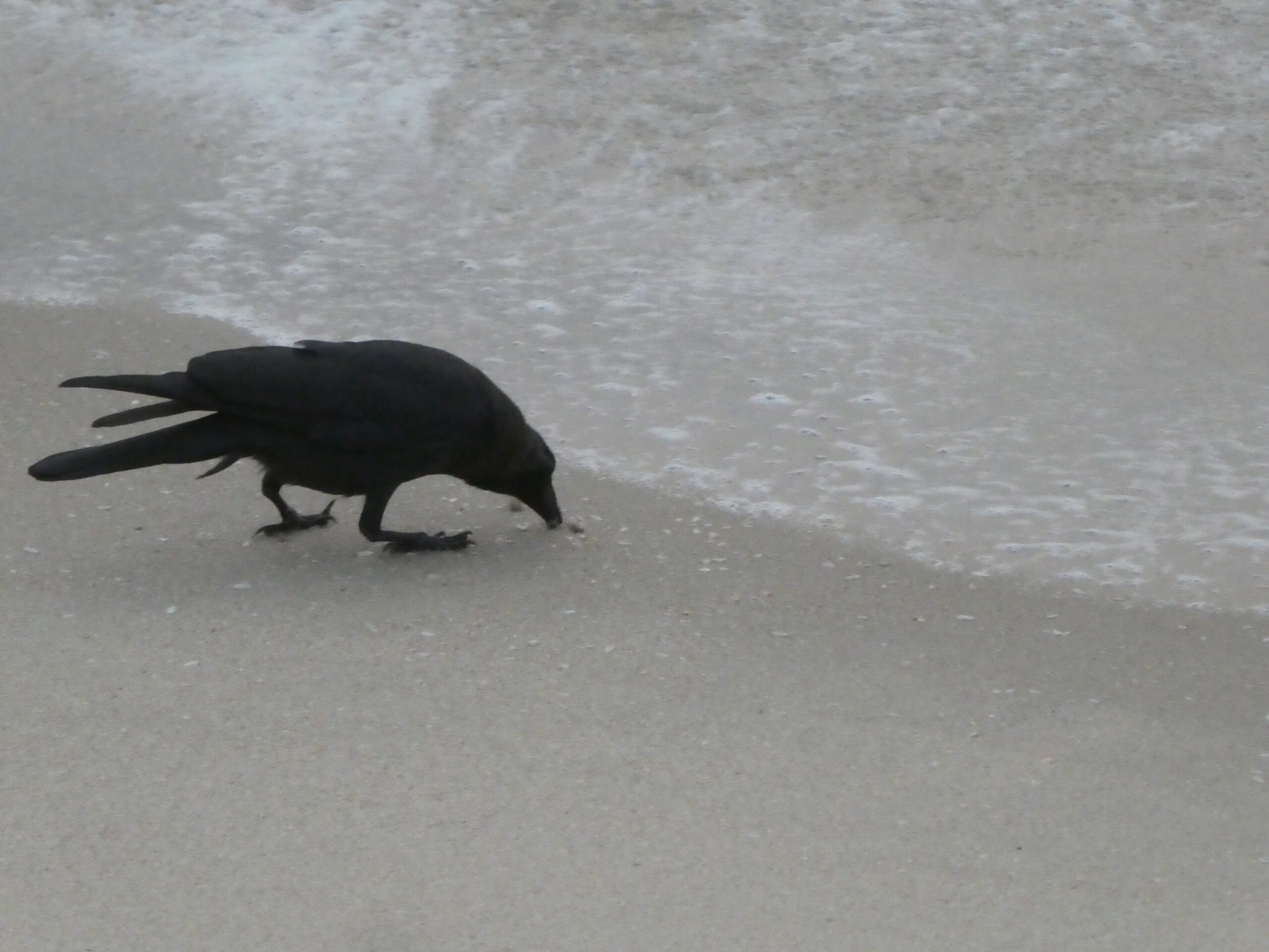 Morgens werden wir wach, weil anscheinend jemand auf dem Dach herumturnt, doch es sind nur die Glanzkrähen, die es hier in großen Schwärmen gibt. Sie rennen auf dem Blechdach über dem Balkon herum und schauen immer wieder nach, ob es schon Frühstück gibt. Man kann einen gedeckten Tisch keine Sekunde verlassen, die cleveren Vögel nutzen jede sich bietende Gelegenheit, etwas zu stehlen. Ob sie auch die Möwen von hier vertrieben haben? Wir sehen keine einzige. Stattdessen können wir am Strand beobachten, wie die Krähen am Spülsaum des Meeres nach Muscheln stochern und es gelingt ihnen immer wieder, sich eine zu schnappen. Vermutlich orientieren sie sich an den aufsteigenden Luftblasen, wenn das Wasser zurückgeht.