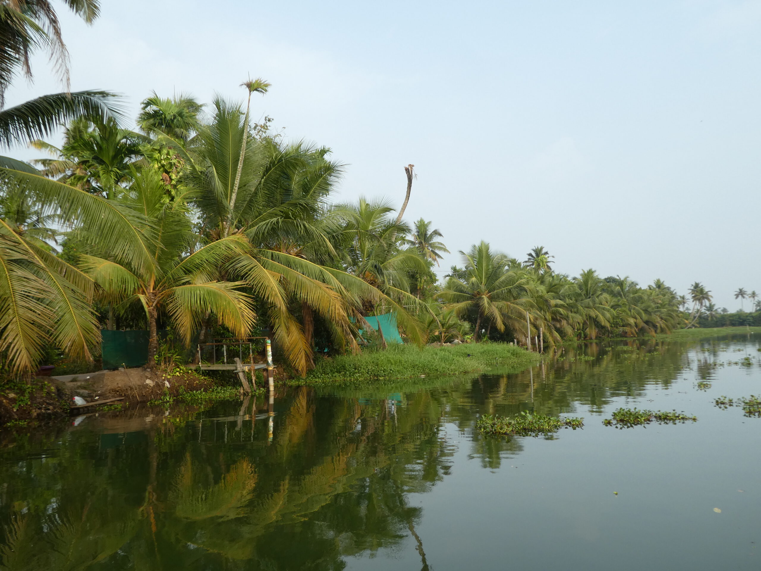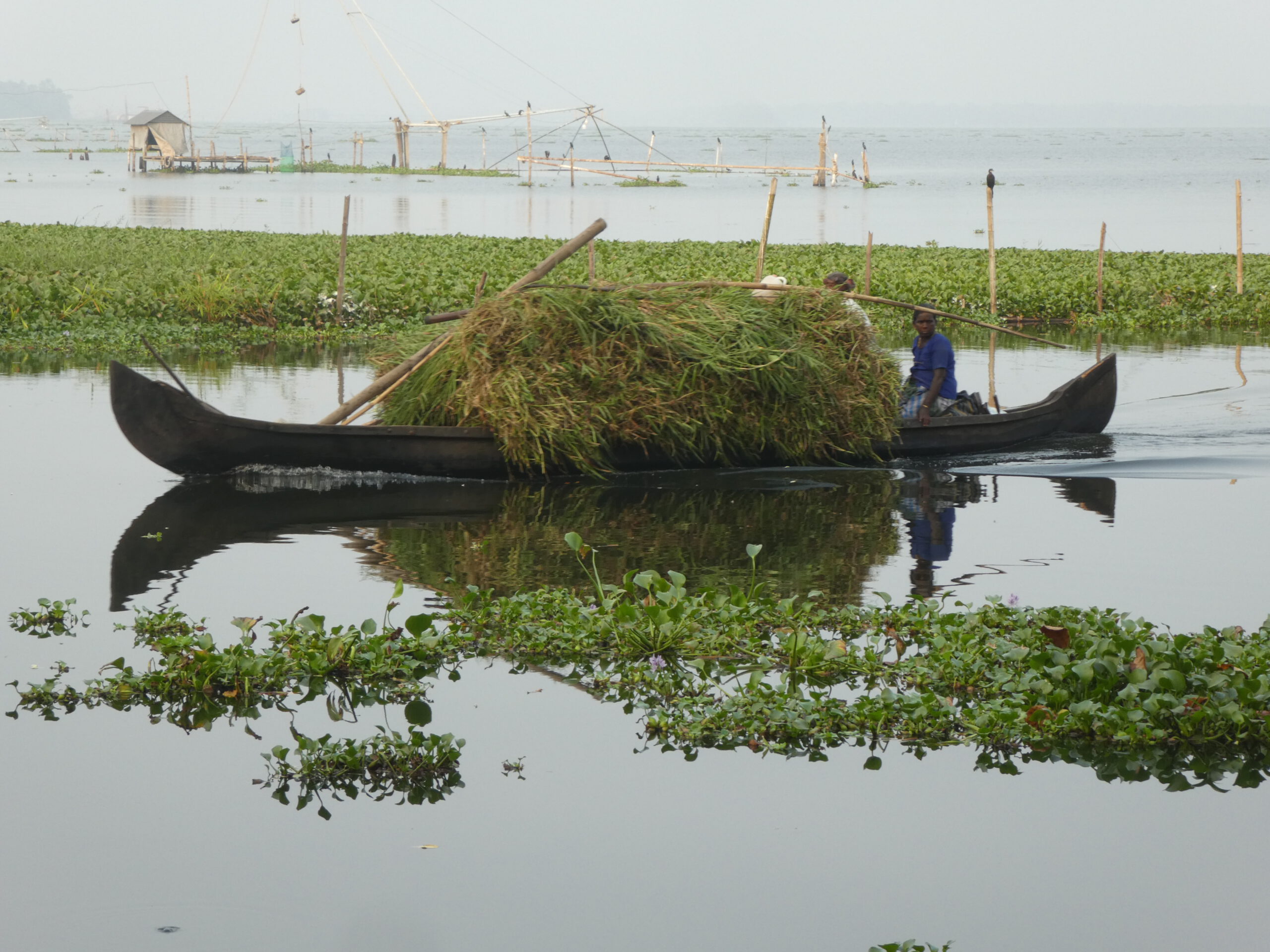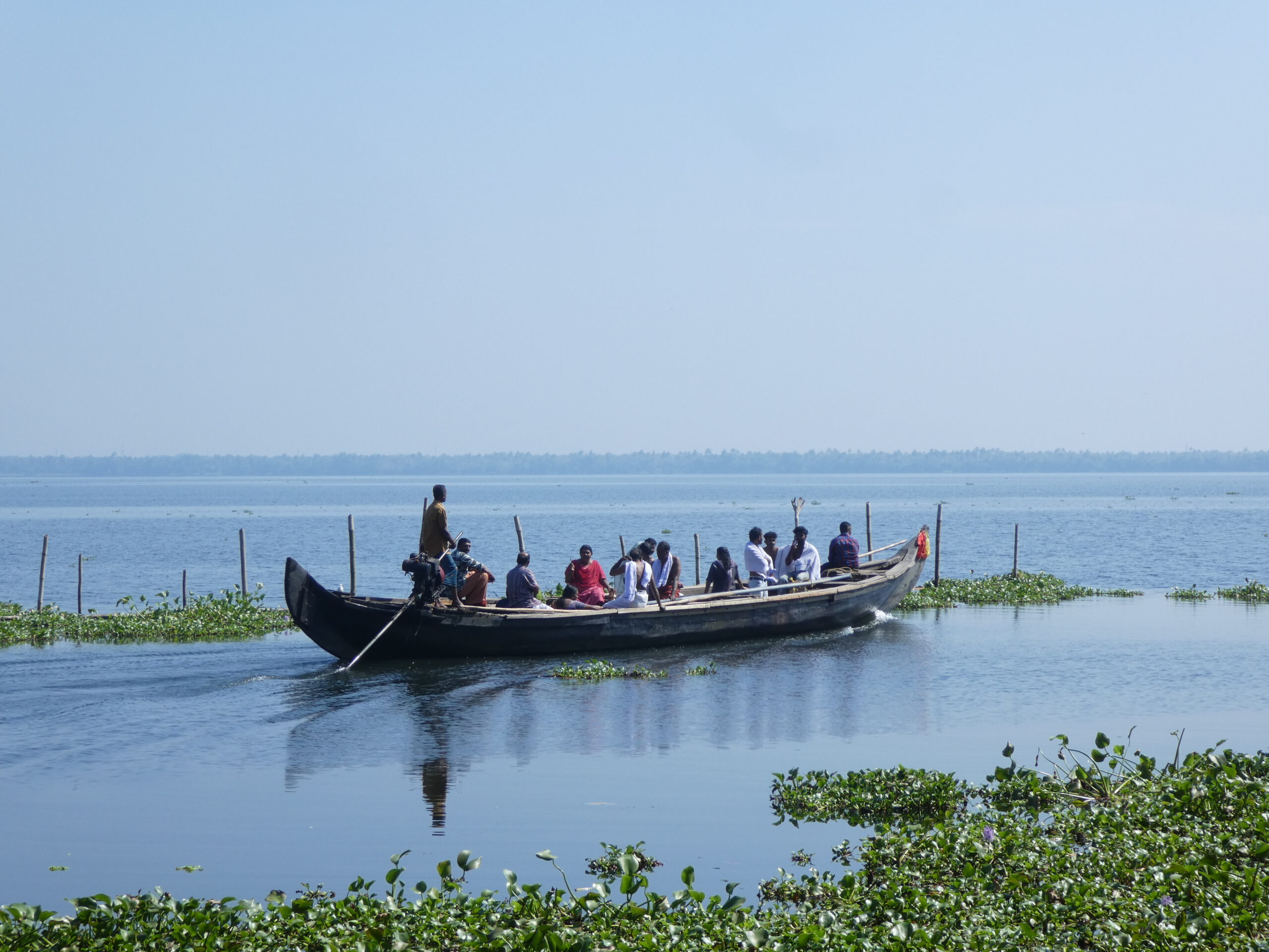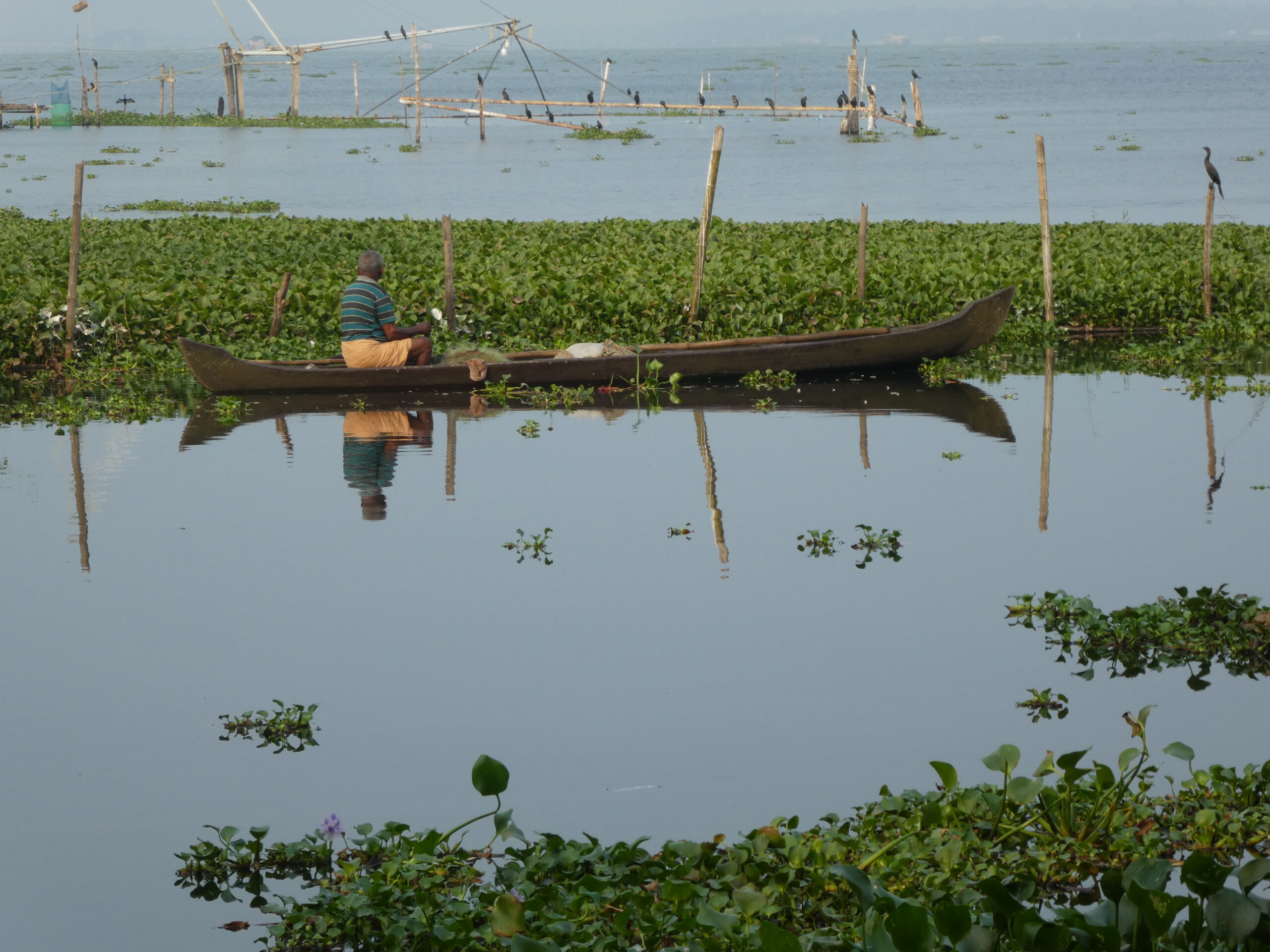 Nach vier Tagen in diesem Homestay, wo wir richtig verwöhnt worden sind und dem gelegentlichem Baden im Meer, reisen wir weiter. Schon nach einer halben Stunde erreichen wir die nächste Unterkunft, idyllisch gelegen am Vembanad Lake, mit 96,5 km der längste See Indiens, und einem Kanal der den einprägsamen Namen Puthanangadi South Pulikkalchira River trägt. See und Kanal gehören zu den Backwaters, einer Wasserlandschaft aus 900 km miteinander verbundenen Flüssen, Seen und Kanälen parallel zur Küste am Arabischen Meer. Die Backwaters sind Wasserstraßen, Fischgründe, Vogelparadies und eine Attraktion für Touristen. Fähren und Hausboote befahren den See und die breiteren Kanäle. Die schlanken Fischerboote sind überall unterwegs, und mit einem Kajak kommt man bis in die letzten Winkel. Vom überdachten Essplatz aus können wir beobachten, wie die kleinen Fischerboote durch den dichten Teppich der Wasserhyazinthen zum See und zurück in den Kanal fahren.