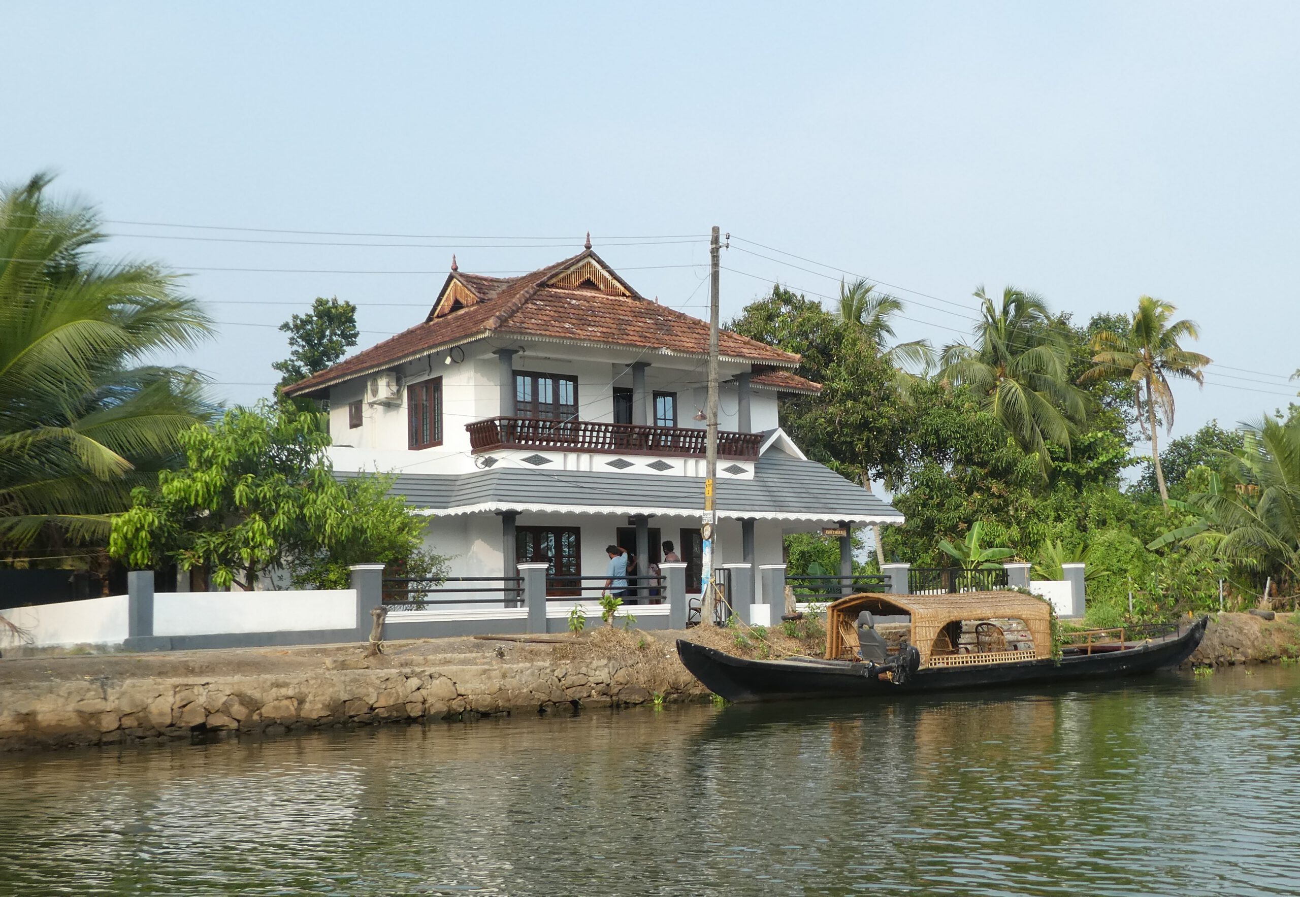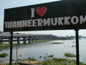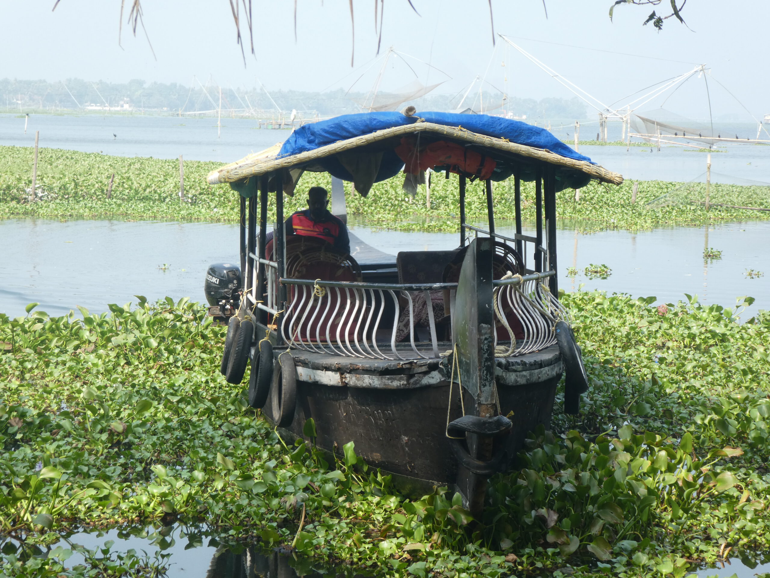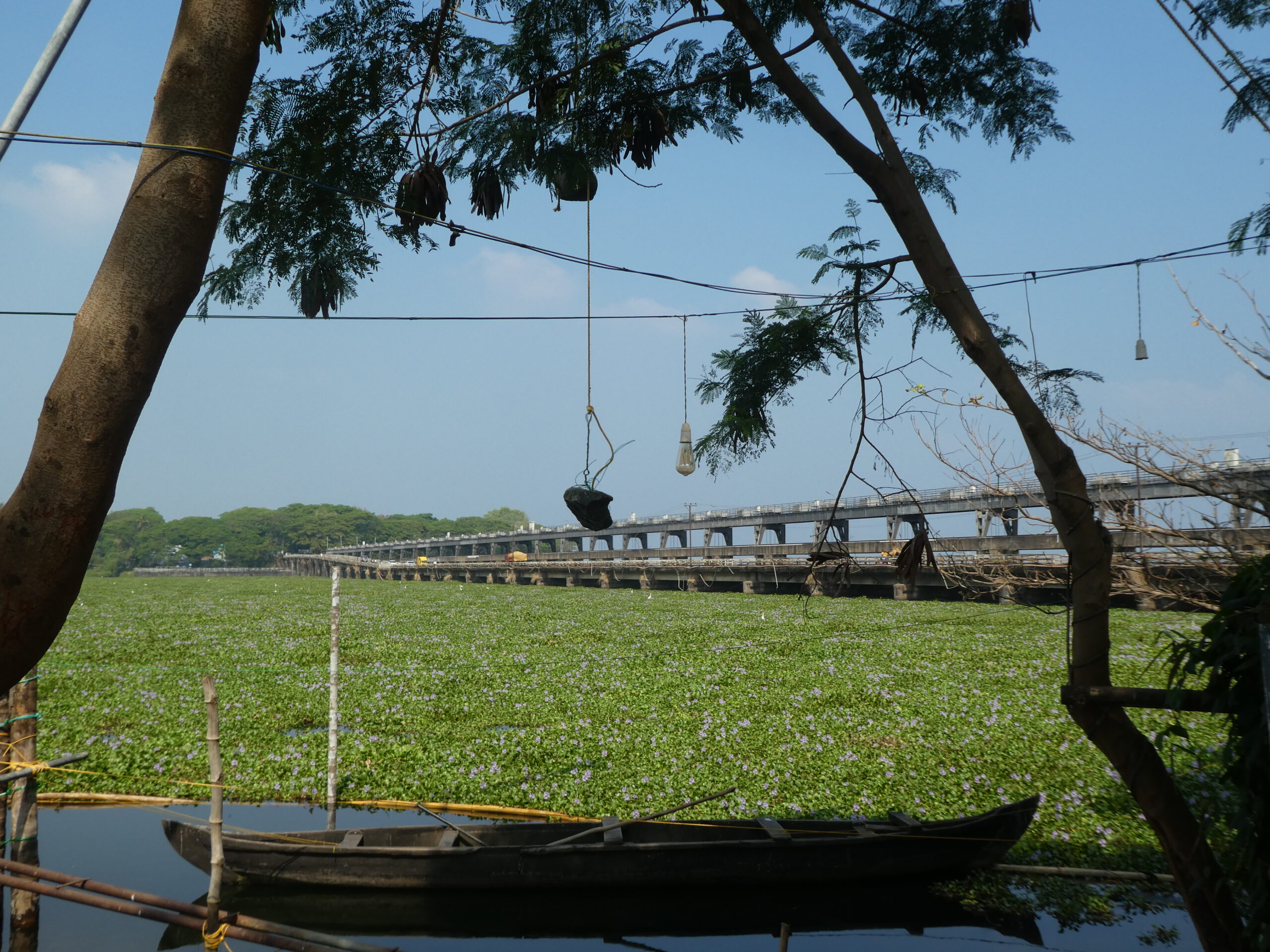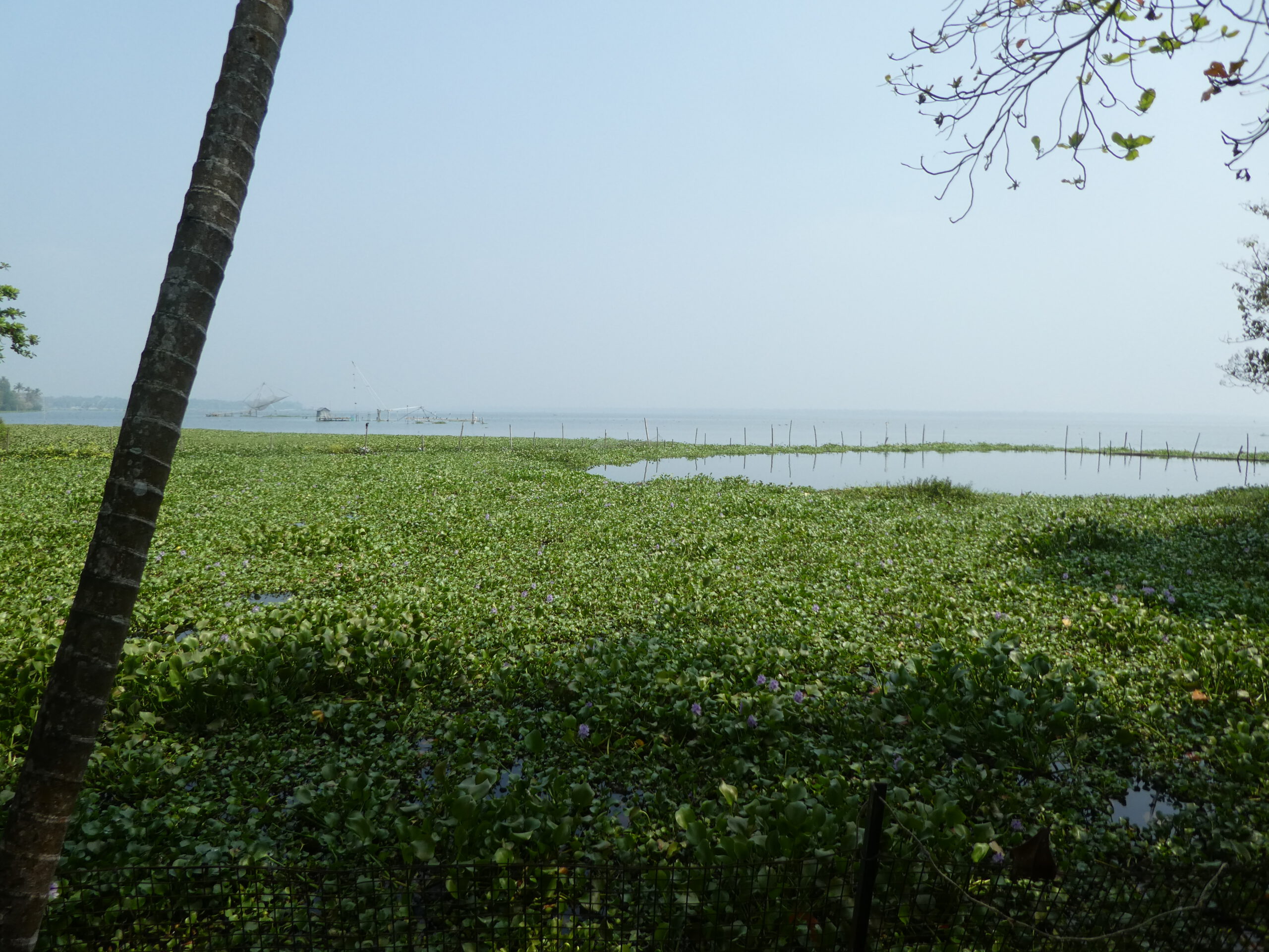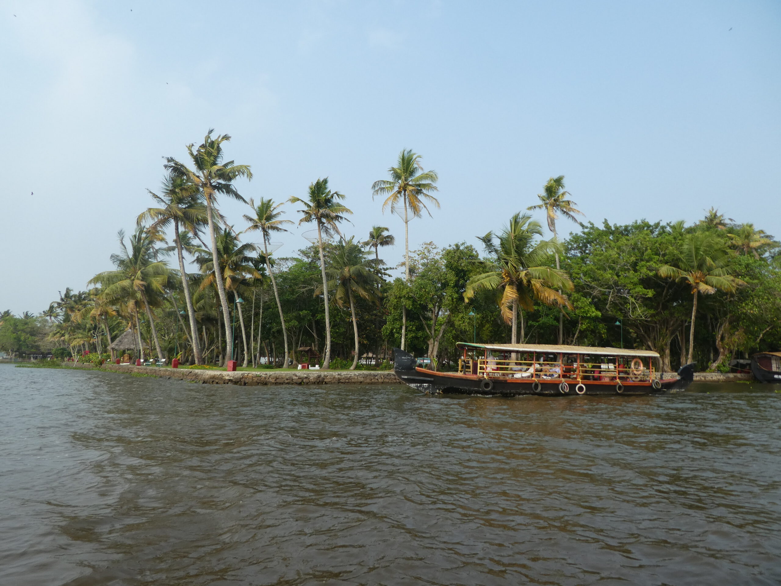 Nach vier Tagen in diesem Homestay, wo wir richtig verwöhnt worden sind und dem gelegentlichem Baden im Meer, reisen wir weiter. Schon nach einer halben Stunde erreichen wir die nächste Unterkunft, idyllisch gelegen am Vembanad Lake, mit 96,5 km der längste See Indiens, und einem Kanal der den einprägsamen Namen Puthanangadi South Pulikkalchira River trägt. See und Kanal gehören zu den Backwaters, einer Wasserlandschaft aus 900 km miteinander verbundenen Flüssen, Seen und Kanälen parallel zur Küste am Arabischen Meer. Die Backwaters sind Wasserstraßen, Fischgründe, Vogelparadies und eine Attraktion für Touristen. Fähren und Hausboote befahren den See und die breiteren Kanäle. Die schlanken Fischerboote sind überall unterwegs, und mit einem Kajak kommt man bis in die letzten Winkel. Vom überdachten Essplatz aus können wir beobachten, wie die kleinen Fischerboote durch den dichten Teppich der Wasserhyazinthen zum See und zurück in den Kanal fahren.