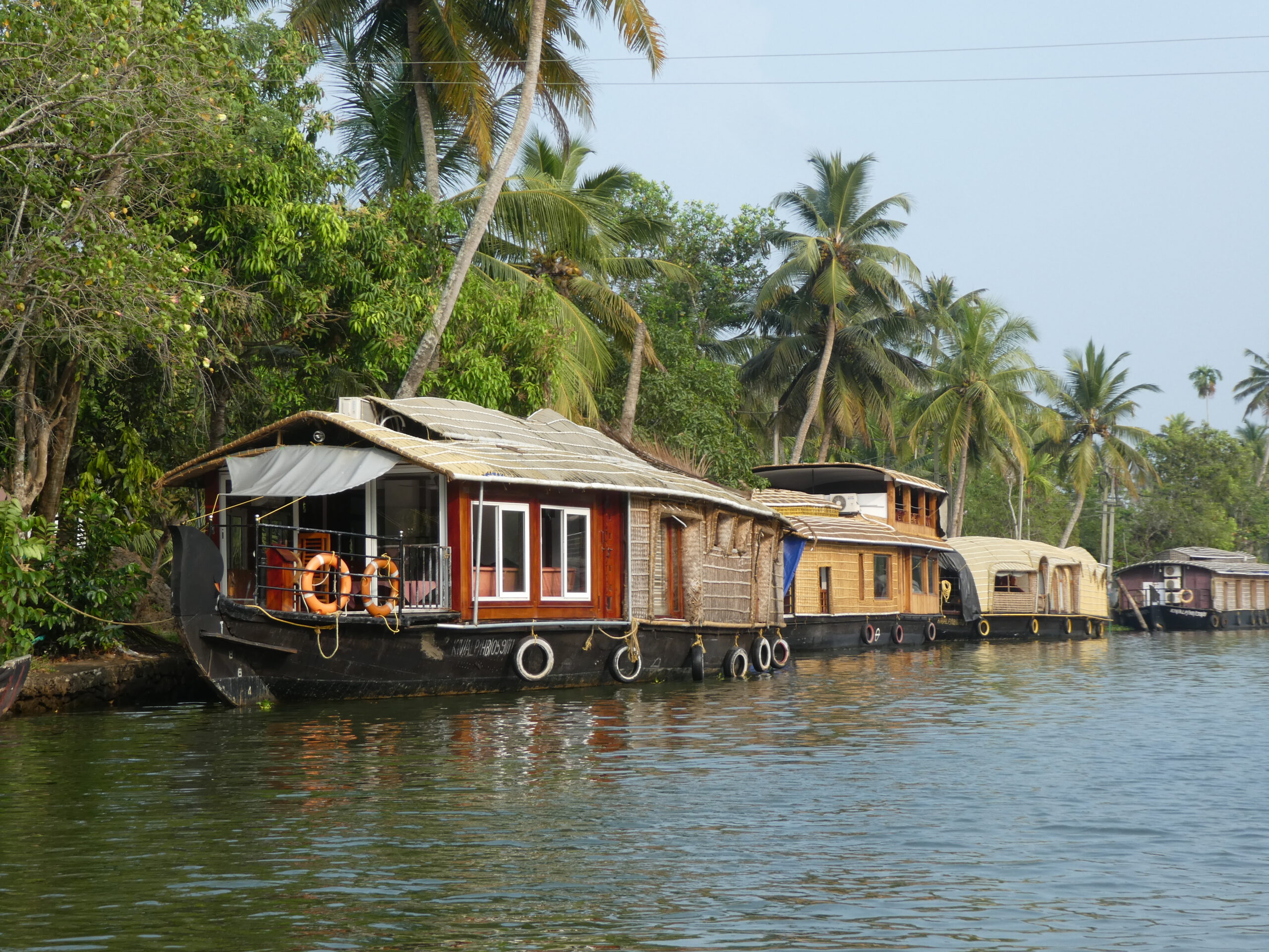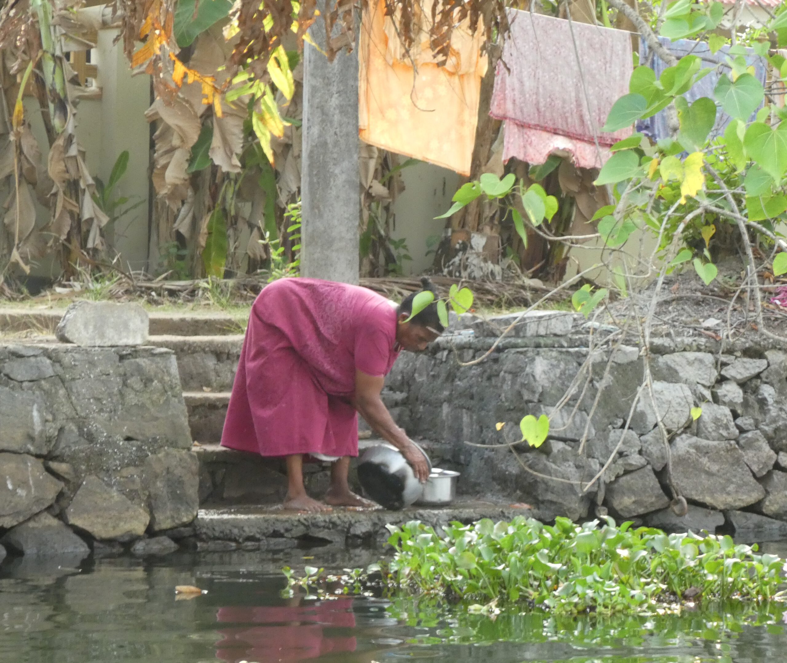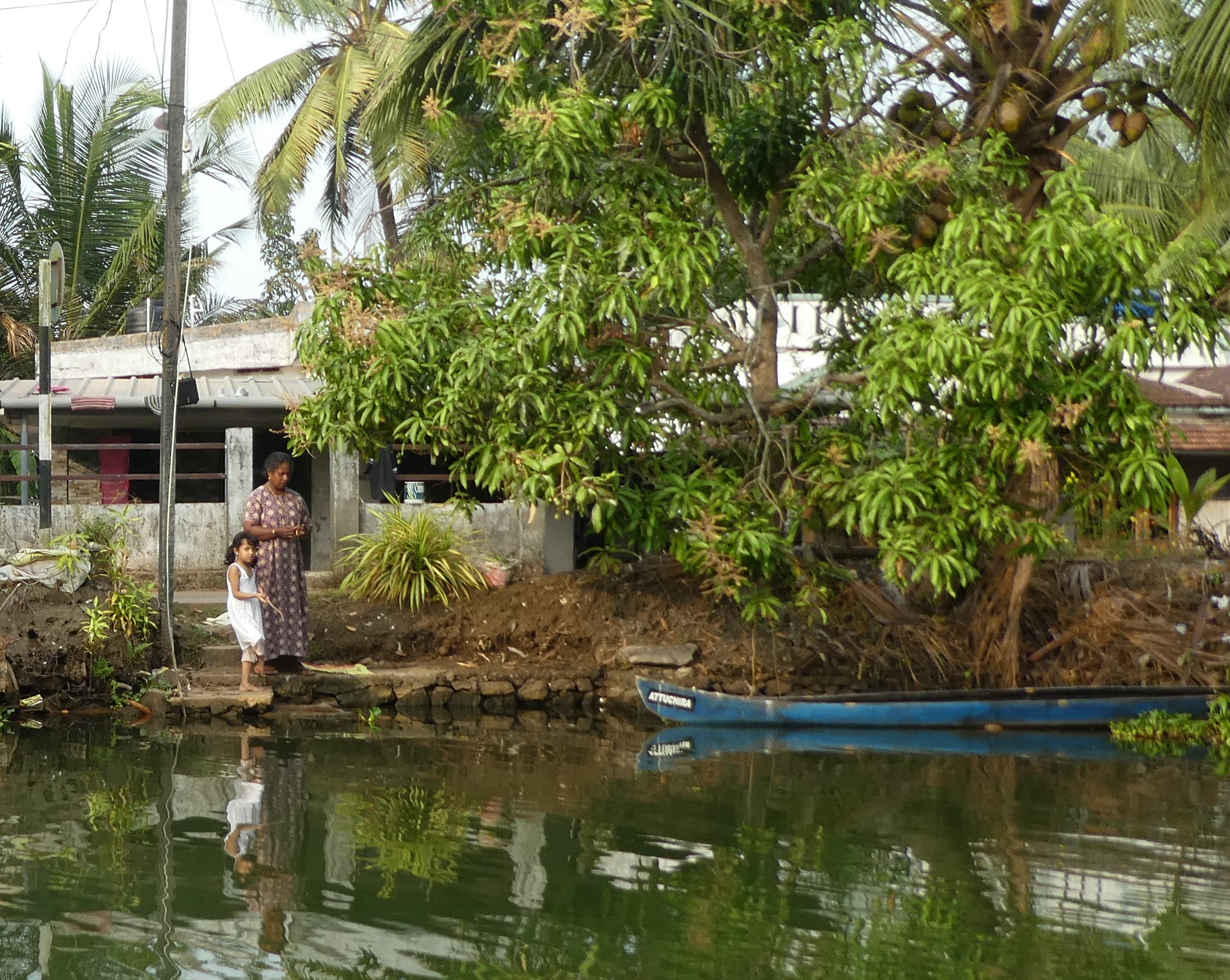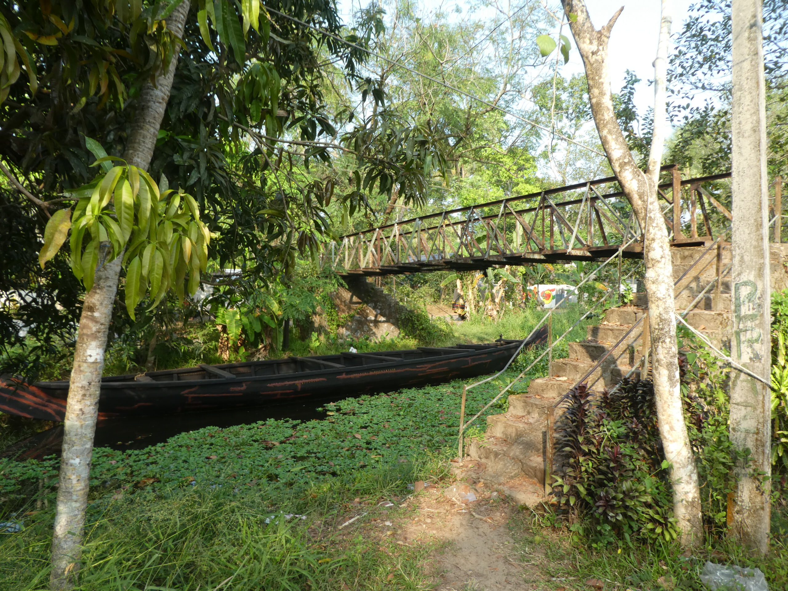 Nach vier Tagen in diesem Homestay, wo wir richtig verwöhnt worden sind und dem gelegentlichem Baden im Meer, reisen wir weiter. Schon nach einer halben Stunde erreichen wir die nächste Unterkunft, idyllisch gelegen am Vembanad Lake, mit 96,5 km der längste See Indiens, und einem Kanal der den einprägsamen Namen Puthanangadi South Pulikkalchira River trägt. See und Kanal gehören zu den Backwaters, einer Wasserlandschaft aus 900 km miteinander verbundenen Flüssen, Seen und Kanälen parallel zur Küste am Arabischen Meer. Die Backwaters sind Wasserstraßen, Fischgründe, Vogelparadies und eine Attraktion für Touristen. Fähren und Hausboote befahren den See und die breiteren Kanäle. Die schlanken Fischerboote sind überall unterwegs, und mit einem Kajak kommt man bis in die letzten Winkel. Vom überdachten Essplatz aus können wir beobachten, wie die kleinen Fischerboote durch den dichten Teppich der Wasserhyazinthen zum See und zurück in den Kanal fahren.