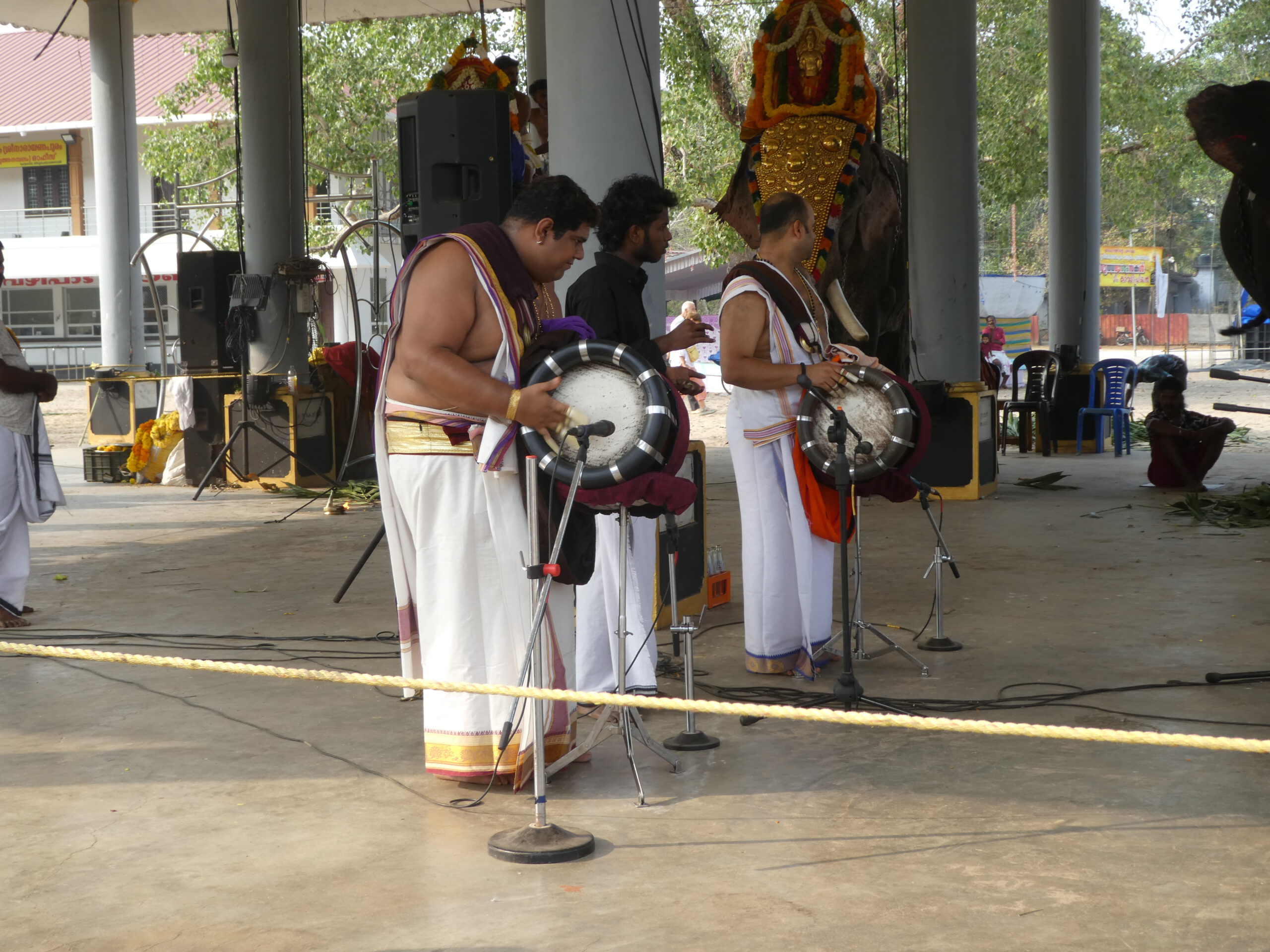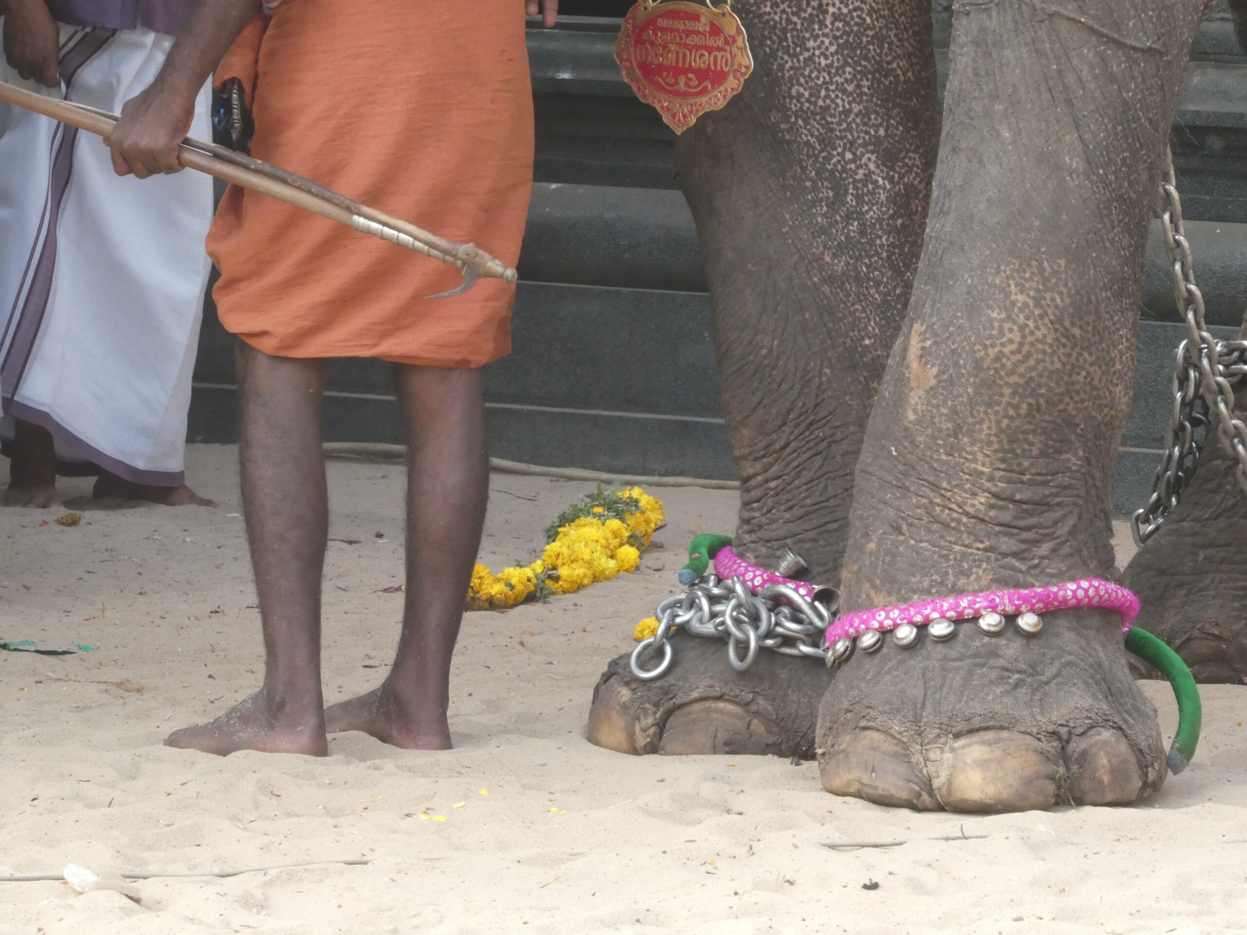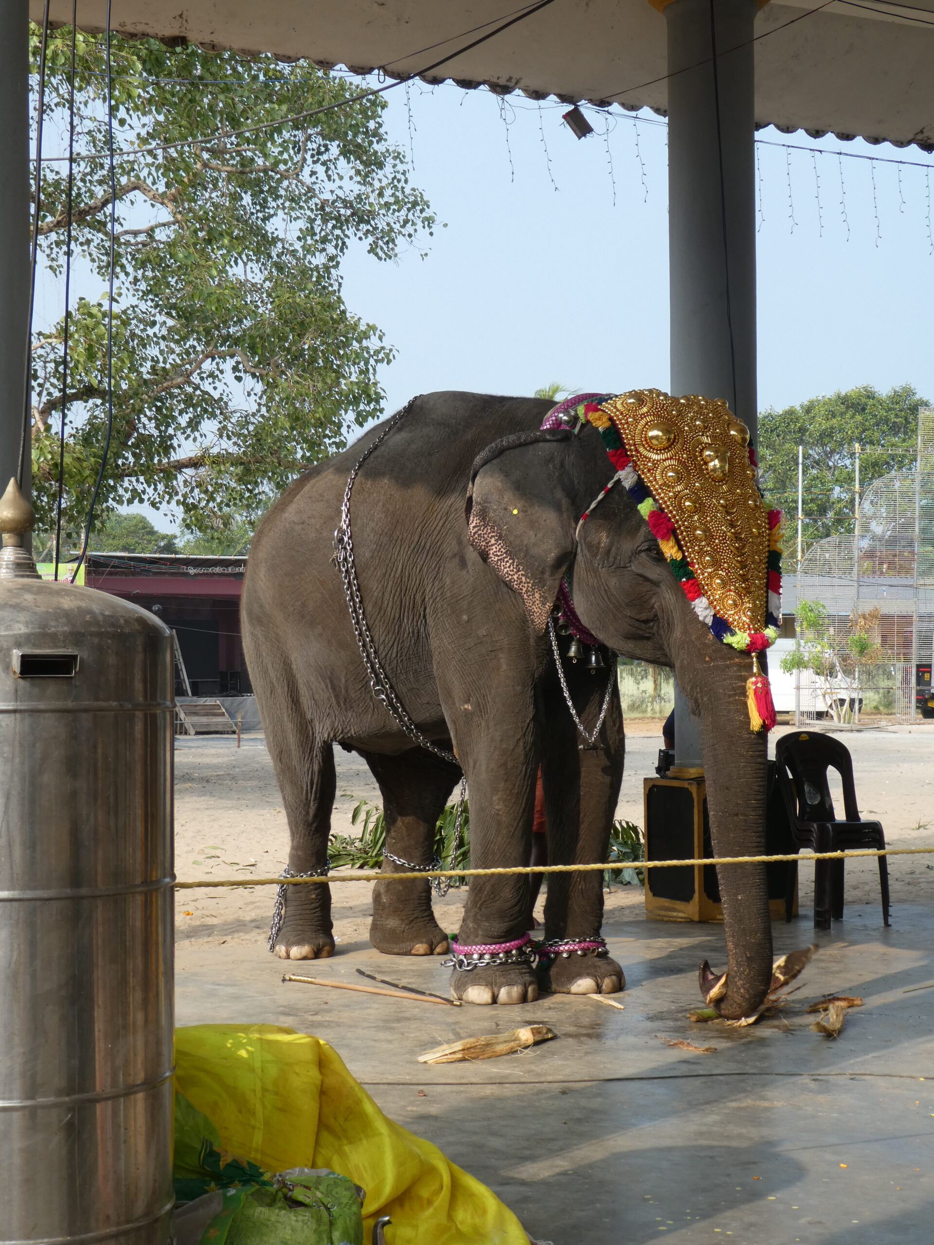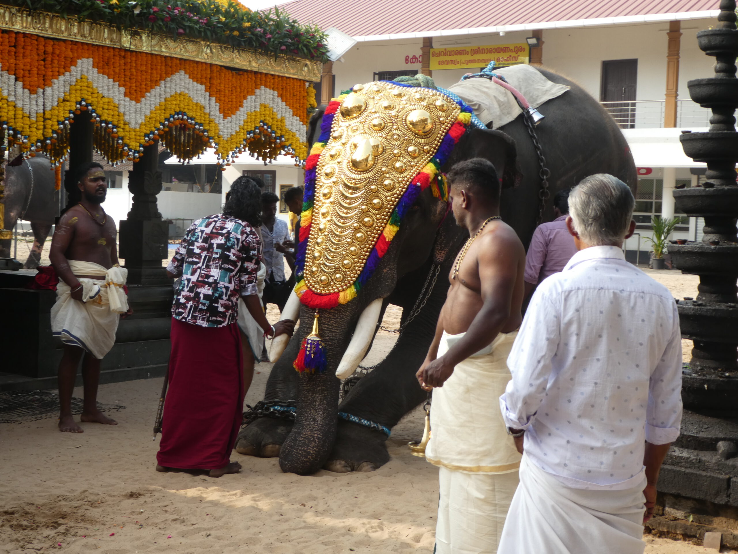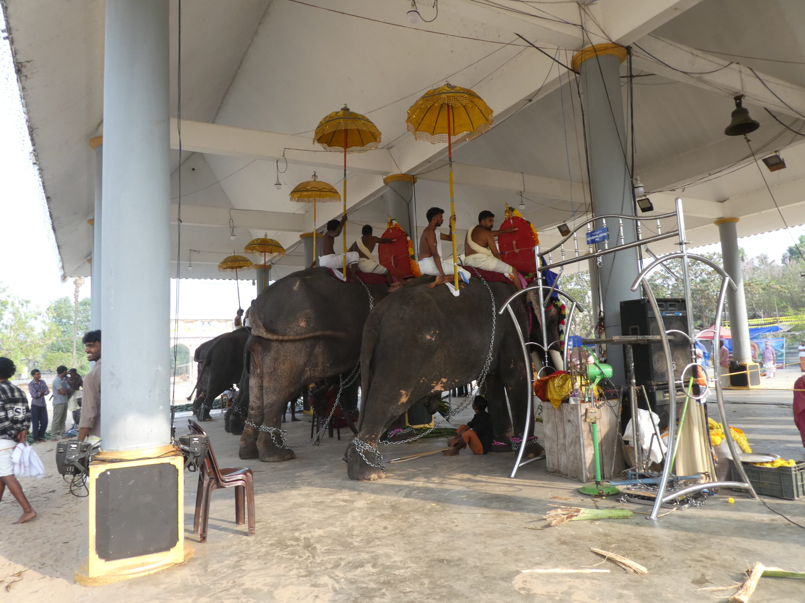 Danach wird er von seinem Mahut (Elefantenpfleger) an seinen Platz unter einem von Säulen getragenen Dach geführt. Im Sand vor der Säulenhalle sitzen die Gläubigen in festlicher Kleidung und verfolgen die Zeremonie. Und schon kommt der nächste Elefant und alles wiederholt sich. Der dritte Elefant vergreift sich blitzschnell am Blumenschmuck, aber genauso schnell hat sein Mahut die Blumenkette wieder aus seinem Maul geholt. Noch zwei weitere Tiere kommen dazu, dann stehen sie alle in einer Reihe und ihre Reiter tragen außer den Schilden noch goldene Schirme.