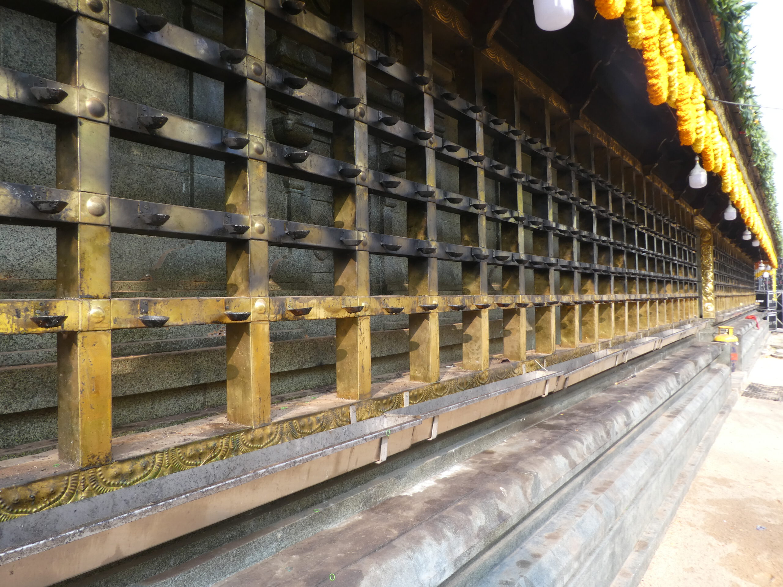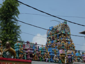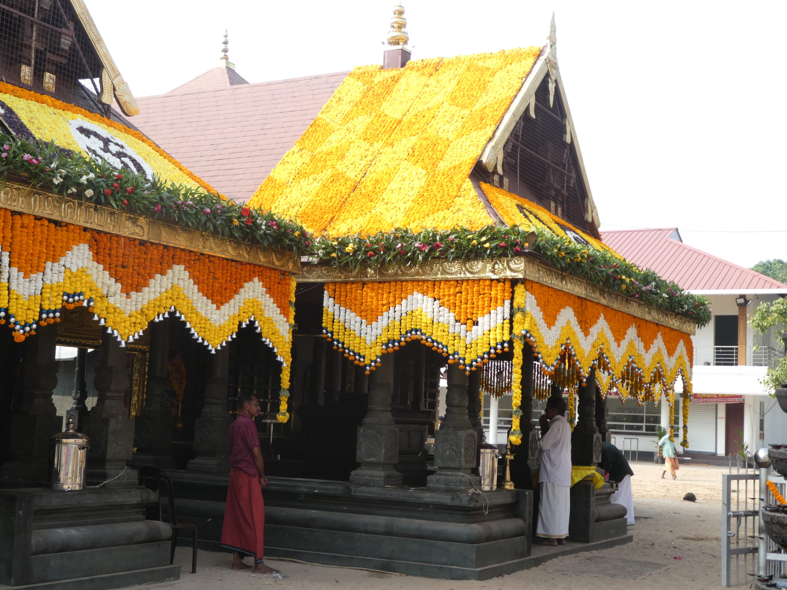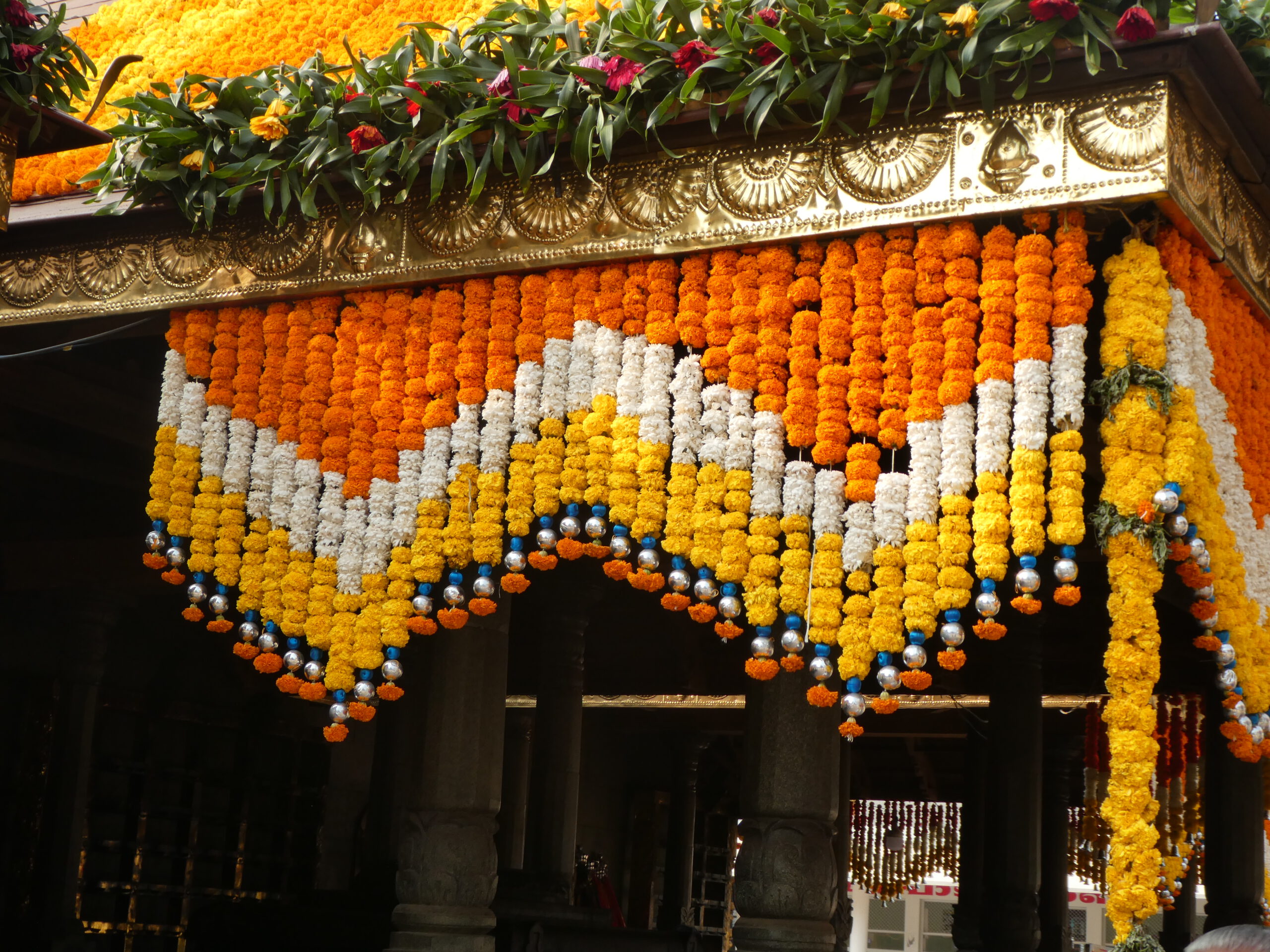 Der Tempel ist mit unzähligen Blumen geschmückt. Weiße, gelbe und orangefarbene Tagetes sind zu Ketten aufgefädelt worden, selbst das Dach ist dicht an dicht mit Blumen bedeckt. Wie viele Hände und Arbeitsstunden dafür wohl nötig waren? Interessant, dass es die gleichen Blumen sind wie im Buddhismus.