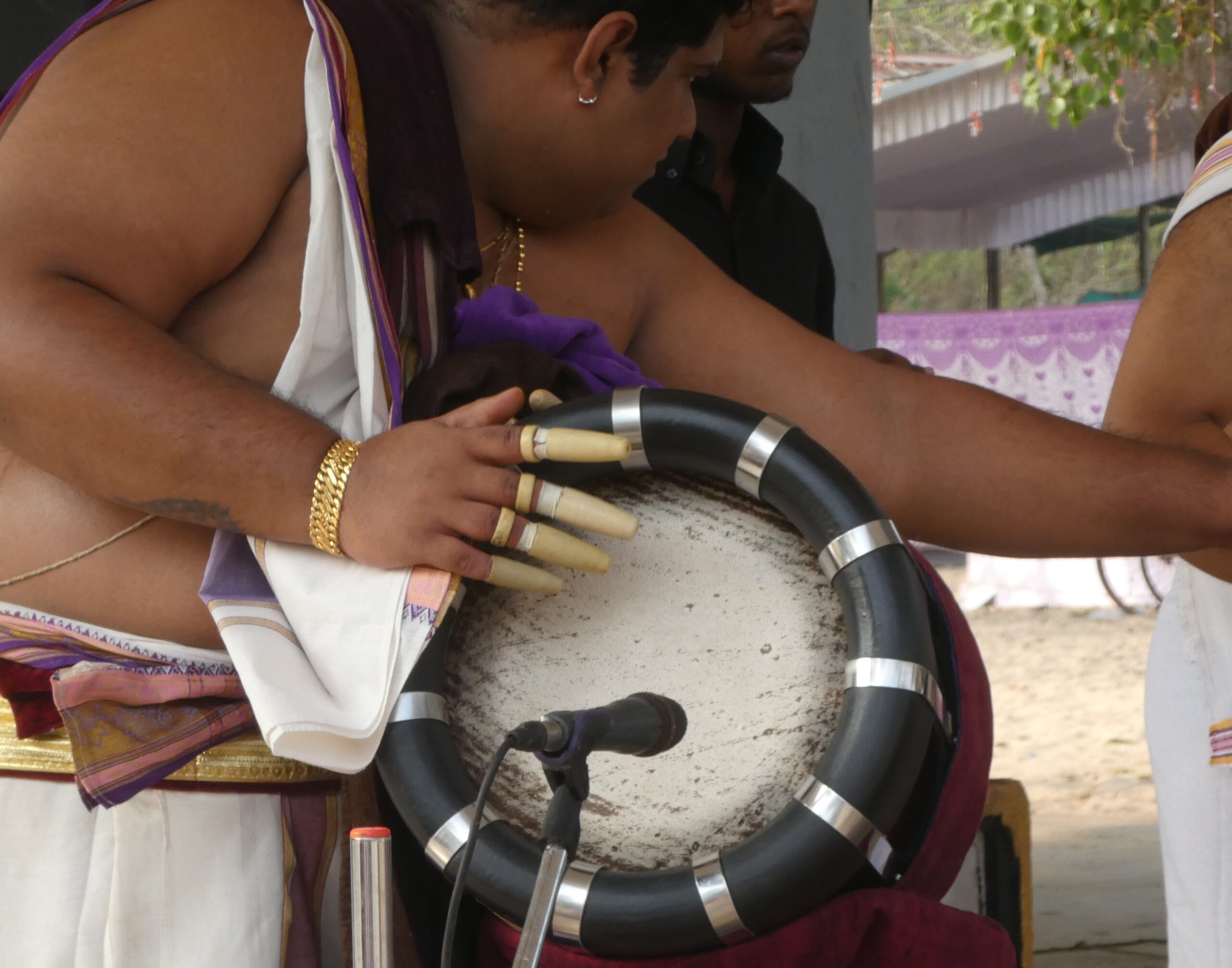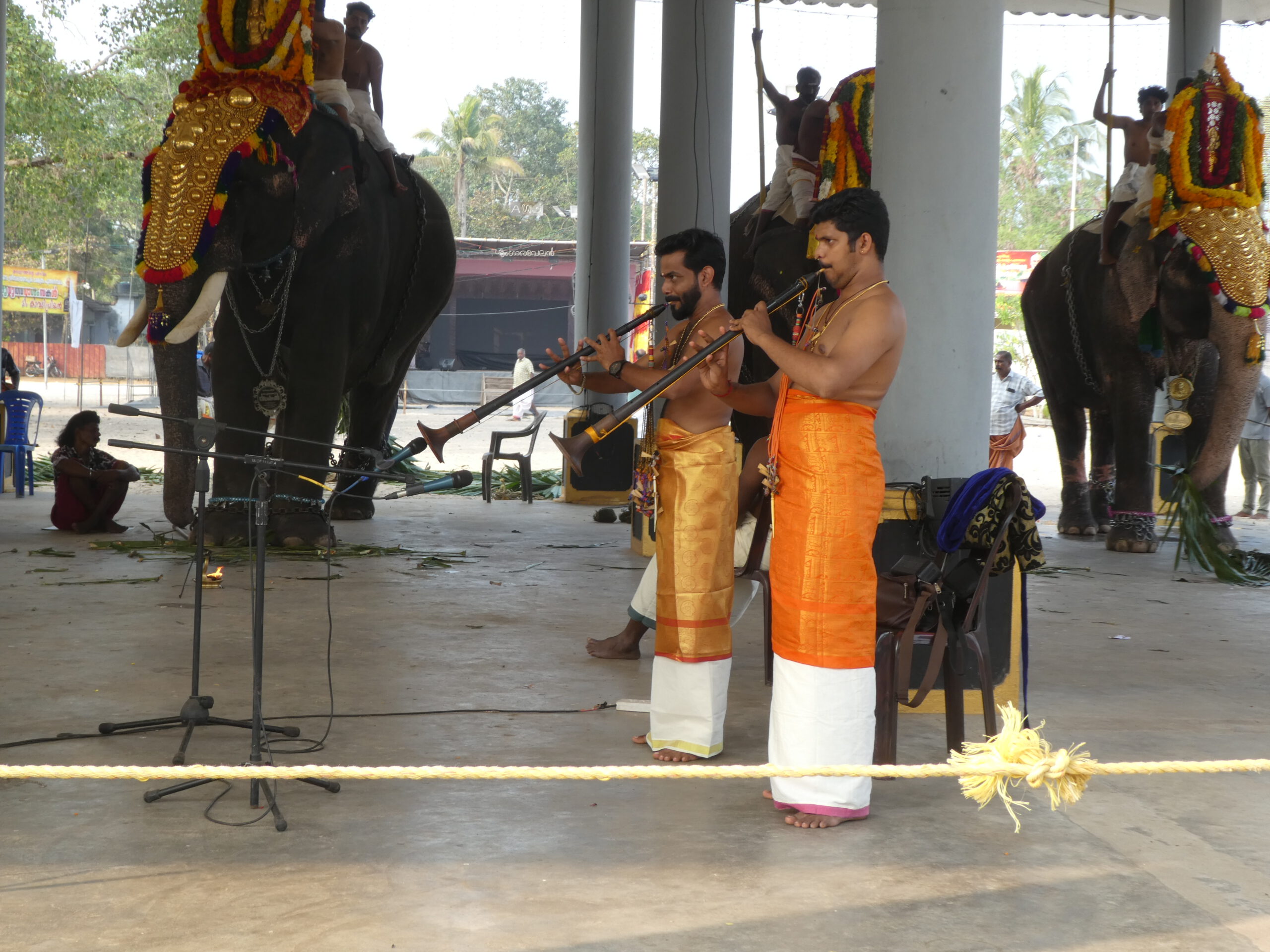 Während der ganzen Zeit spielen vier Musiker auf Chenda (Trommel) und Schalmeien, durch Verstärker um ein Vielfaches zu einem infernalischen Lärm gesteigert. Ich schwanke zwischen Abscheu und Faszination, mir tun die Elefanten unsagbar leid. Unentwegt wird ihnen Futter vor die Füße gelegt, um sie ruhig zu halten, ein Mann ist pausenlos damit beschäftigt, für sie die Blätter von langen Bambusstangen zu schneiden. Die Mahuts tragen lange Stangen mit Metallspitzen, um unruhige Tiere im Notfall unter Kontrolle zu bringen.