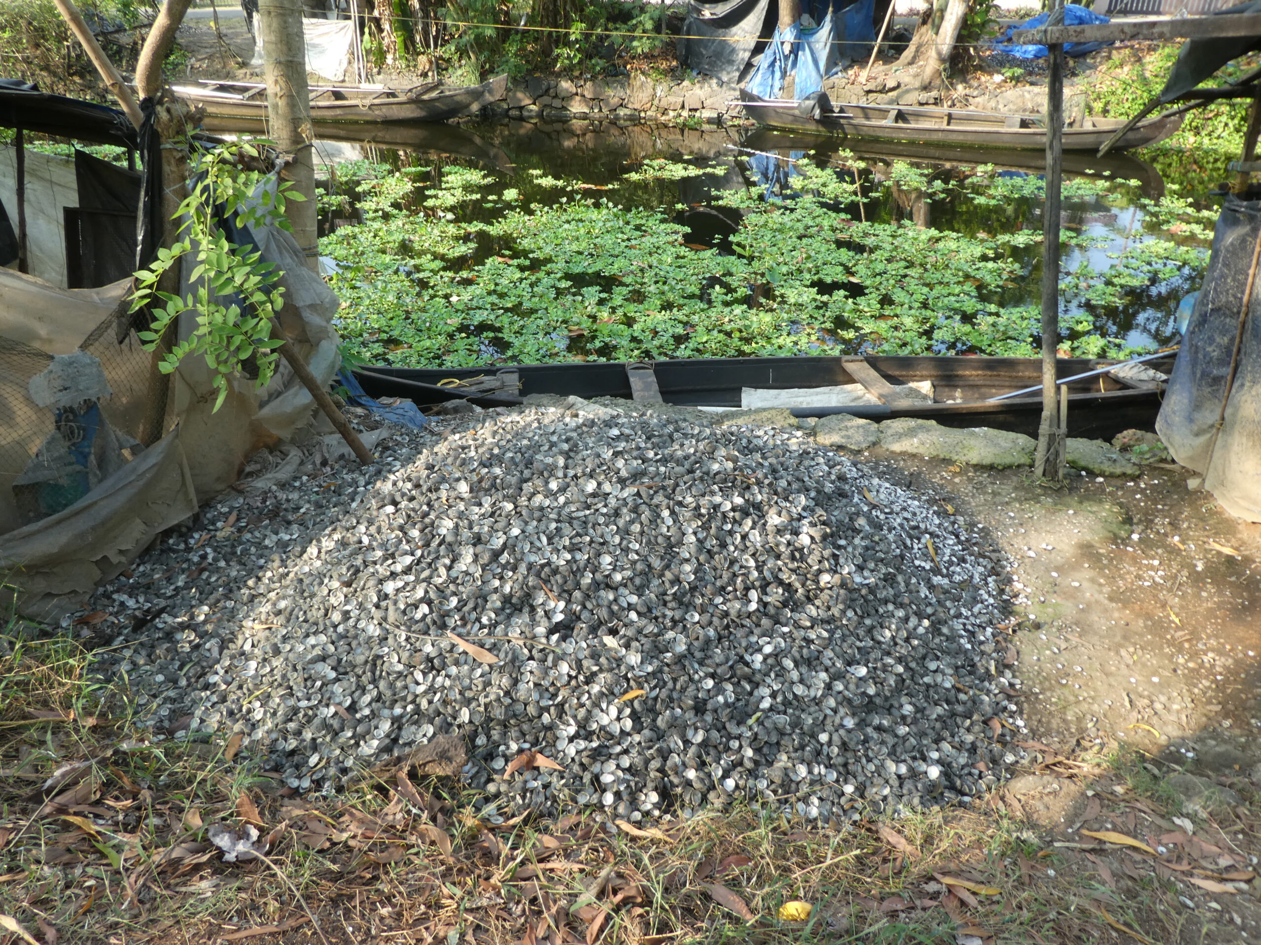 Wir beschließen nachmittags, am Kanal entlang in den Ort Puthanagadi zu laufen. Am Ufer liegen bergeweise Muschelschalen, die Muscheln werden aus dem See geerntet und gegessen. Etwas erstaunt stellen wir fest, dass die Geschäfte geschlossen sind, aber wir wollen nur Geld am Automaten holen. Ein Mann deutet die Hauptstraße hoch, das Navi sagt etwas anderes. Wir fragen einen anderen Mann, der gerade mit einer großen Tasche aus seinem Haus kommt. Er nickt, steigt auf sein Moped und bedeutet Klaus, sich hinter ihn zu setzen. Ich muss auf die Tasche aufpassen und schon sind beide um die Ecke verschwunden. Nach kurzer Zeit sind sie zurück, Klaus mit dicker Brieftasche (100 Rupien sind 0,91 €). Ein Trinkgeld lehnt der freundliche Mann ab.