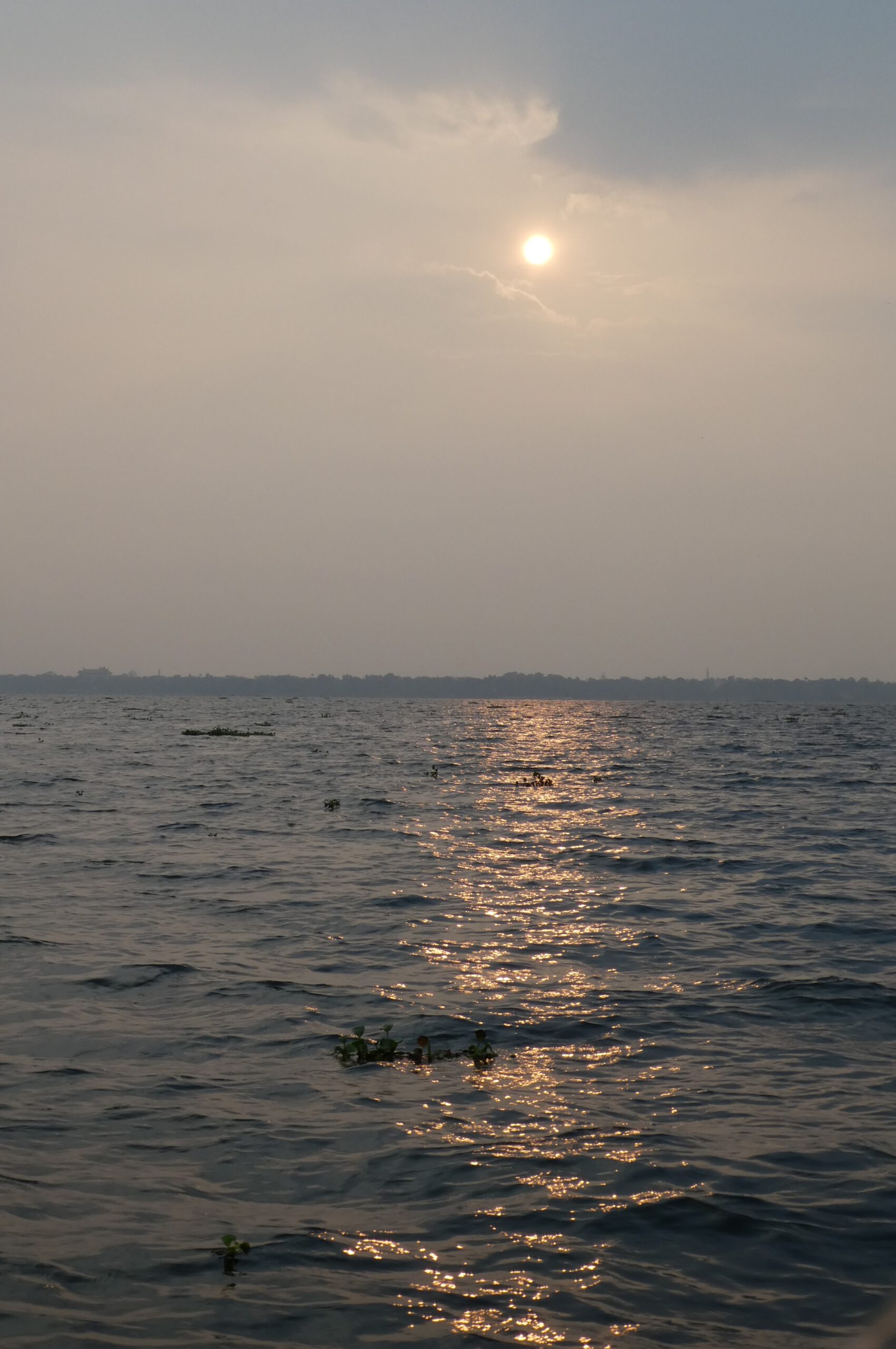 Heute steht ein Bootsausflug auf dem Programm. Um 15 Uhr werden wir von einem schlanken Holzboot, das mit bequemen Sesseln und einem Dach ausgestattet ist, abgeholt. An vielen chinesischen Fischernetzen geht es zunächst zu einer kleinen Insel, die als Vogelschutzgebiet ausgewiesen ist. Doch beim Spaziergang über die Insel sehen und hören wir keinen einzigen Vogel, da ist an unserer Unterkunft am Kanal wesentlich mehr zu sehen. Eisvögel, Kormorane, indische Teichreiher, Heckenkuckuck, Dschungelkrähe und Schwarzhaubenpirol haben wir schon bestimmen können. Wir laufen auf die andere Seite der Insel, hier gibt es einen vernachlässigten Kinderspielplatz und es wird an einer überdachten Bühne gebaut. Auf dem Rückweg huscht ein kleiner Waran vor uns über den Weg. Nachdem wir im Schatten noch zwei Kokosnüsse verzehrt haben, geht es zurück aufs Boot. Vorbei an schwimmenden Inseln aus Wasserhyazinthen erreichen wir das andere Ufer und neben einem luxuriösen Ressort biegt der Bootsführer in einen breiten Kanal ein. Am Ufer stehen hübsche Häuser, allerdings werden sie nach und nach ärmlicher, je weiter wir in den Kanal vordringen. Jetzt sehen wir Menschen, die am Ufer angeln, waschen oder Wasser holen. Erstaunlich ist die Menge an Haus- und Ausflugsbooten, die hier festgemacht haben. In den ganzen Backwaters muss es tausende solcher Boote geben. Als wir kurz vor unserer Unterkunft sind, malt die untergehende Sonne einen Streifen auf das Wasser des Sees.