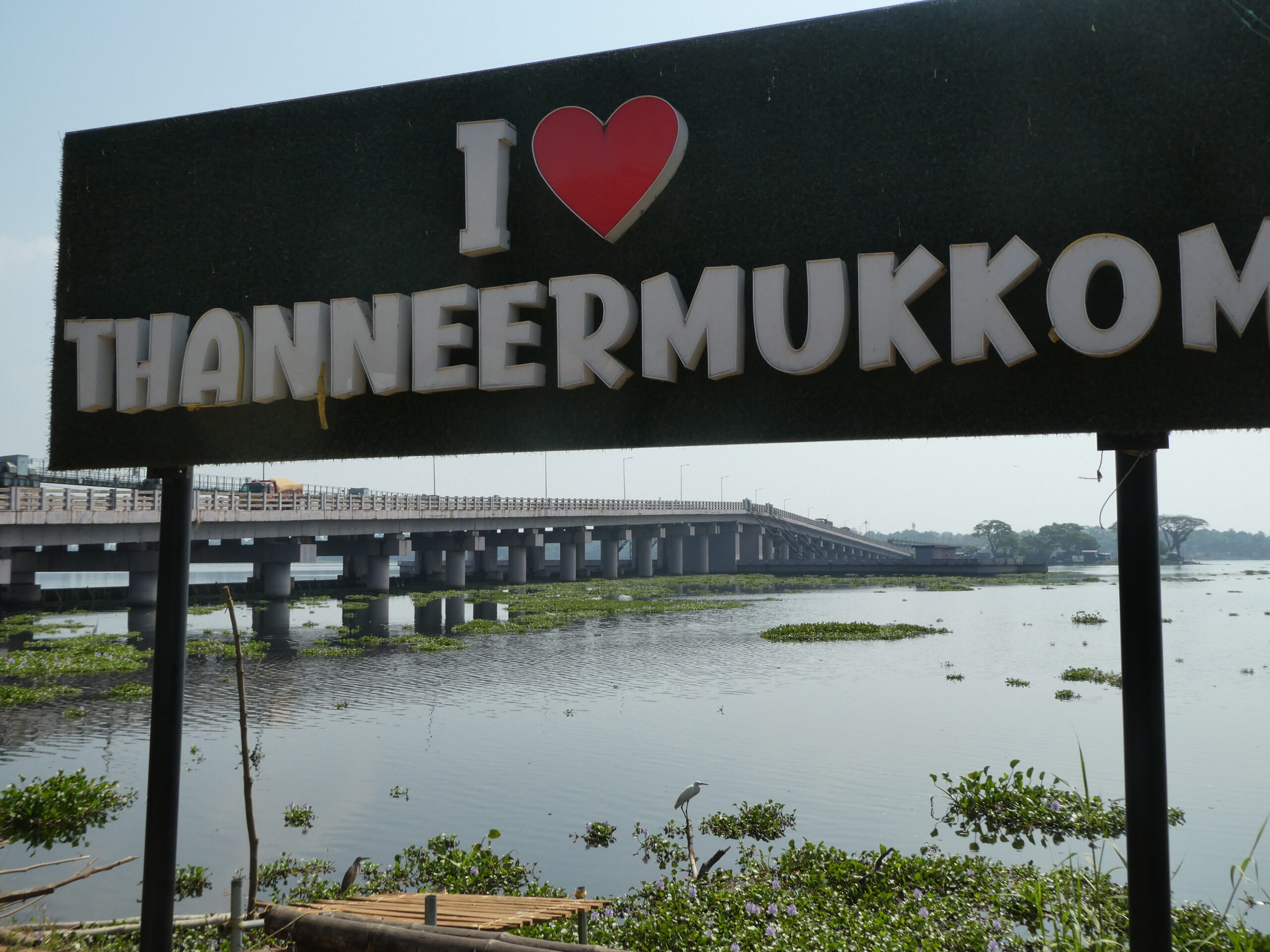 Bis in die Nacht hinein spielt die Musik und erleuchten Laserstrahlen den Himmel. Am nächsten Morgen ist alles ruhig und unser Taxifahrer pünktlich zur Stelle, um uns zum Thekkady Nationalpark zu fahren. Es gibt keine direkte Busverbindung, wir müssten etliche Male umsteigen, das dauert einen ganzen Tag. Mit Gepäck ist uns das viel zu anstrengend. Mit dem Taxi kommen wir auf direktem Weg nach vier Stunden an. Schnell erreichen wir die lange Brücke, die über den Vembanad Lake führt. Sie ist verbunden mit einem Salzwassersperrwerk, das mit 62 Schleusentoren das Wasser aus dem arabischen Meer daran hindert, die tiefer gelegenen Reisfelder zu erreichen. Der nördliche Teil des Sees enthält Brackwasser, der südliche Süßwasser.