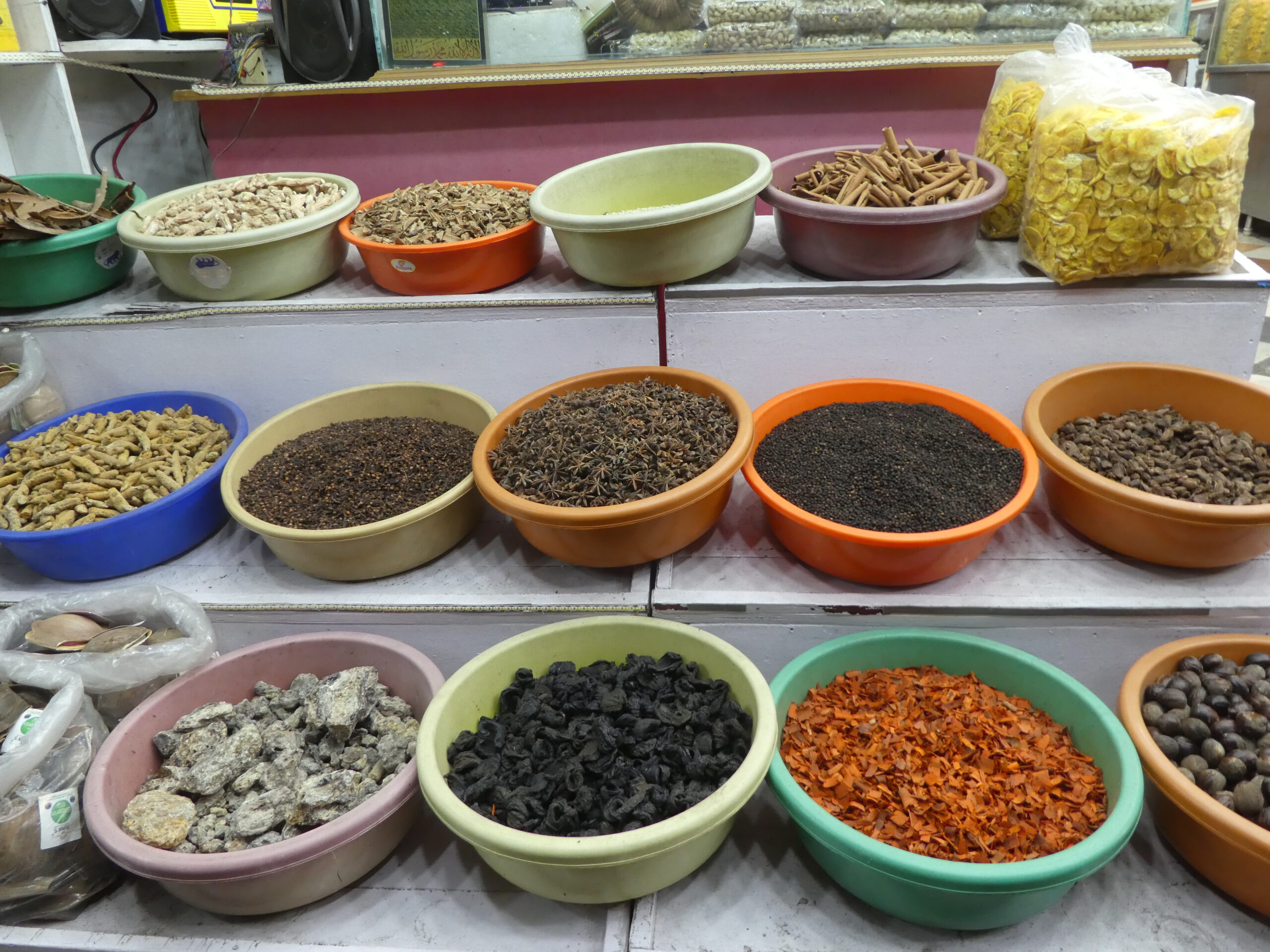 Interessant sind die Gewürzläden. Diese Vielfalt, die der Grund für die europäischen Eroberer war, einen Seeweg nach Indien zu finden, begeistert auch heutzutage noch. Wie das schon riecht, wenn man einen solchen Laden betritt. Zimt, Nelken, Pfeffer, Kardamom, Muskat und mehr, und dann gibt es Dinge, die wir bisher weder gesehen noch von ihnen gehört haben.
