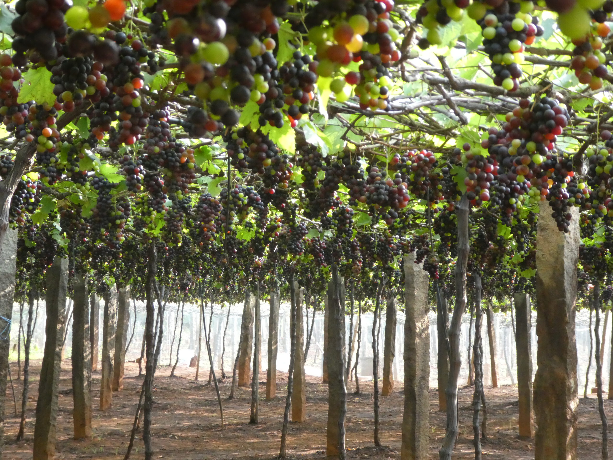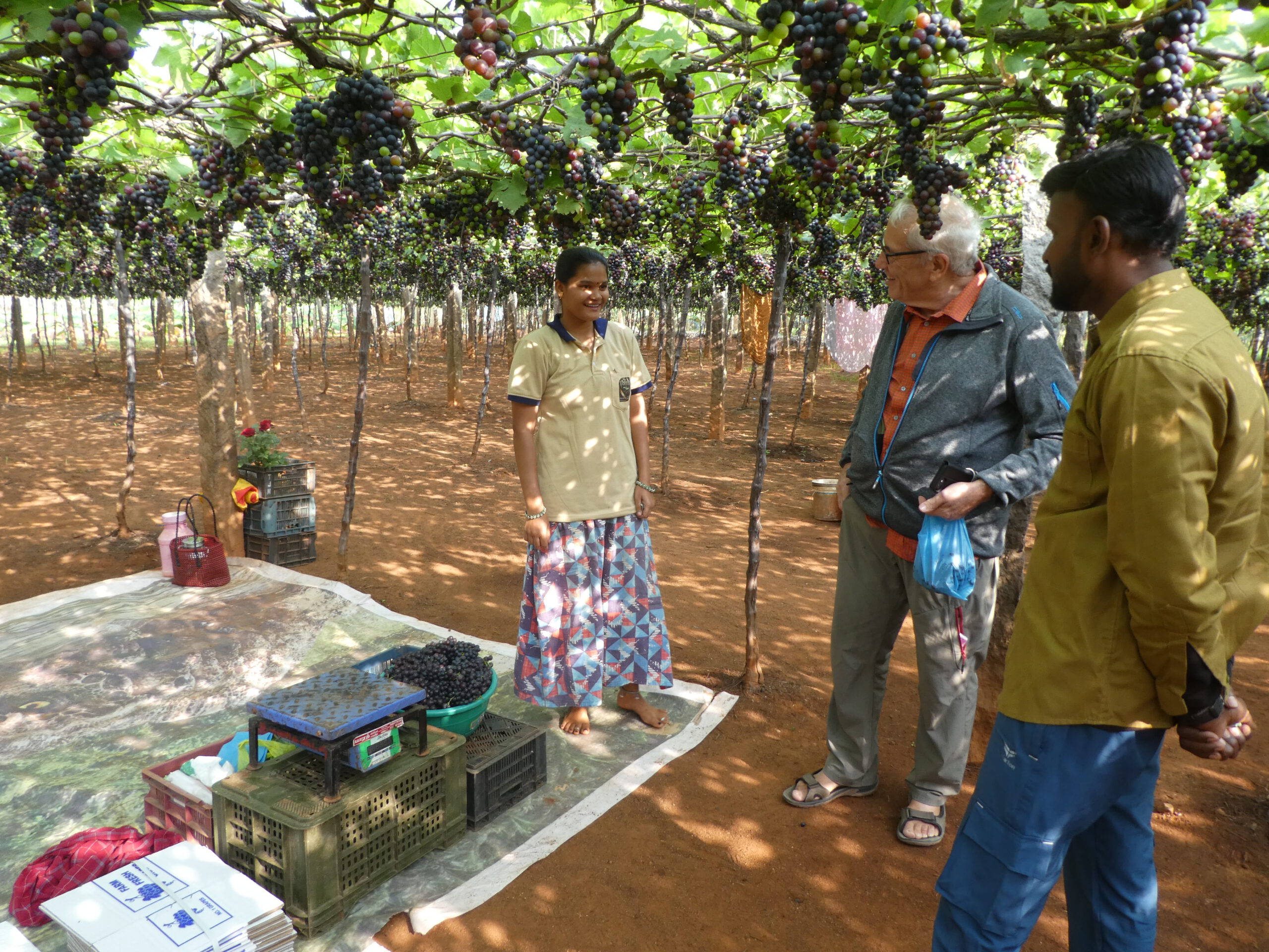 Für Weintrauben gibt es eine raffinierte Anbaumethode, die Stämme der Weinstöcke wachsen ca. 1,80 Meter hoch, ein Drahtgeflecht wird an Betonstempeln in derselben Höhe befestigt und die Ranken klammern sich daran fest. Die gerade reifen Trauben hängen alle nach unten, gut geschützt vor gefräßigen Vögeln, die von oben nur eine grüne Fläche sehen. Unter jedem Traubenacker hat es sich ein Wächter oder eine Wächterin gemütlich gemacht. Diese hat sogar eine elektrische Waage dabei und wir kaufen ihr ein paar Trauben ab, die an Ort und Stelle für uns gewaschen werden, bevor sie sie in eine kleine Plastiktüte packt. Wein wird aus diesen Trauben nicht gekeltert, sie werden gleich gegessen oder enden als Rosinen, die in der indischen Küche eine wichtige Rolle spielen.