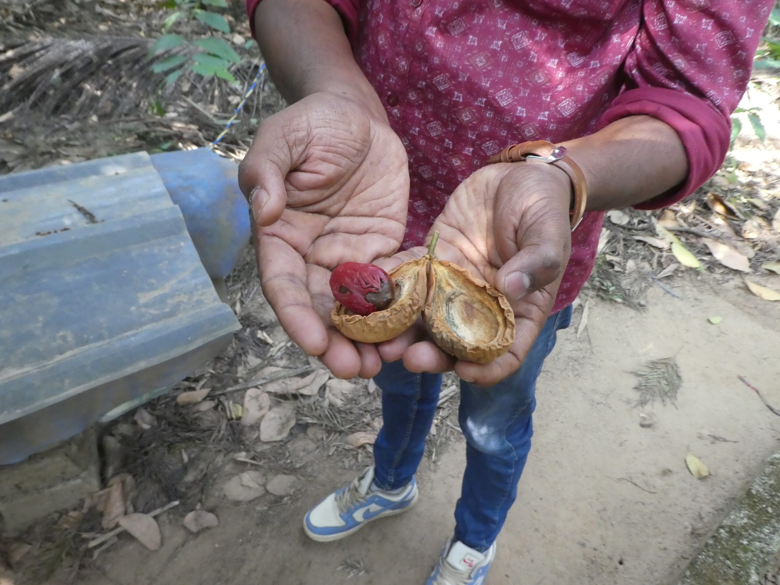 Besonders beeindruckend finde ich die Muskatnuss, bei der man sich durch verschiedene Hüllen arbeiten muss, um endlich an die Nuss zu kommen. Zuerst die birnenförmige weiche gelbe Frucht öffnen, dann den leuchtend roten Samenmantel (Macis) entfernen, die braune Schale aufknacken und da ist sie die Muskatnuss. Wir kaufen ein Massageöl und eins zum Inhalieren und später in der Stadt noch ein paar Gewürze.