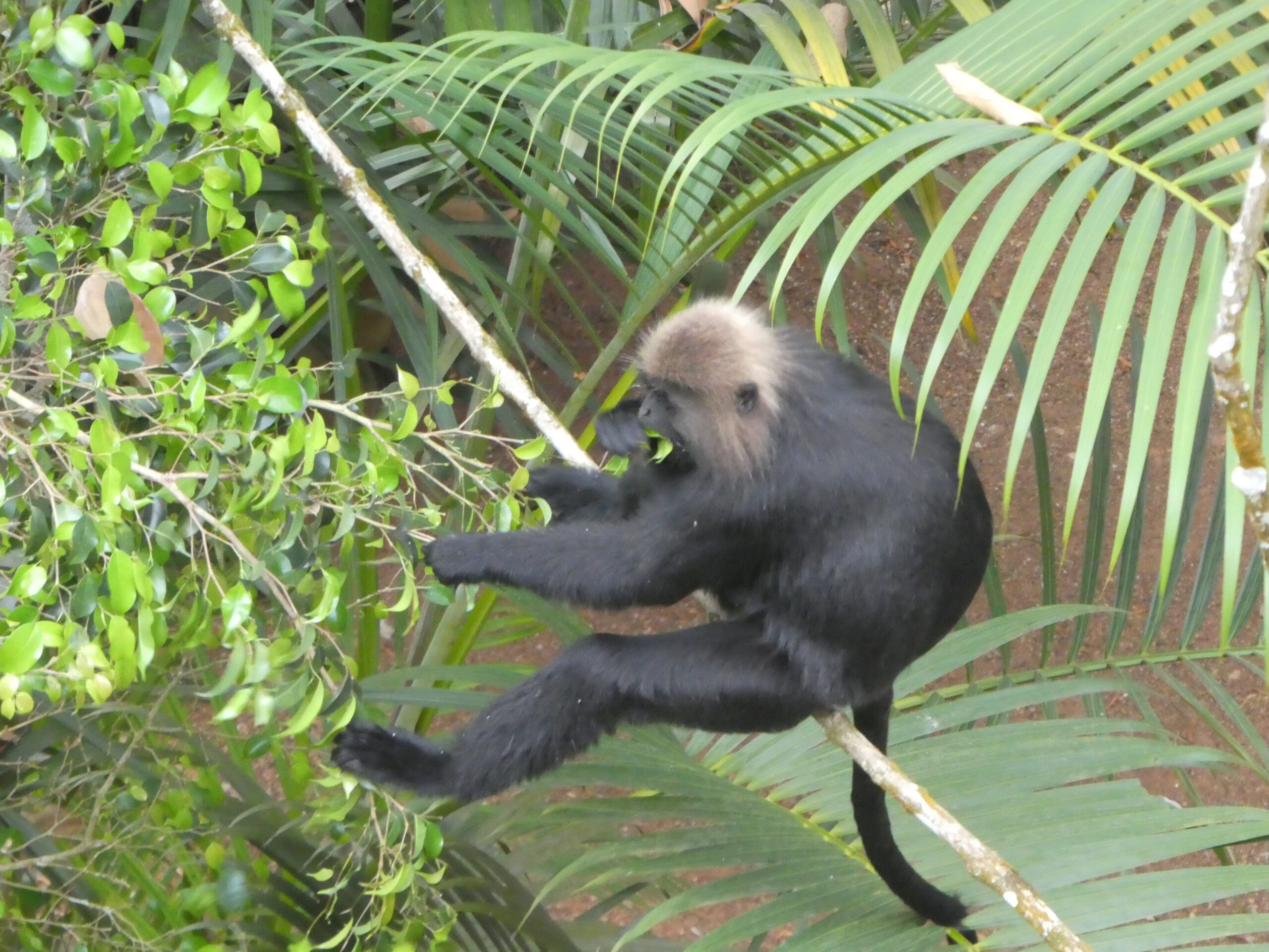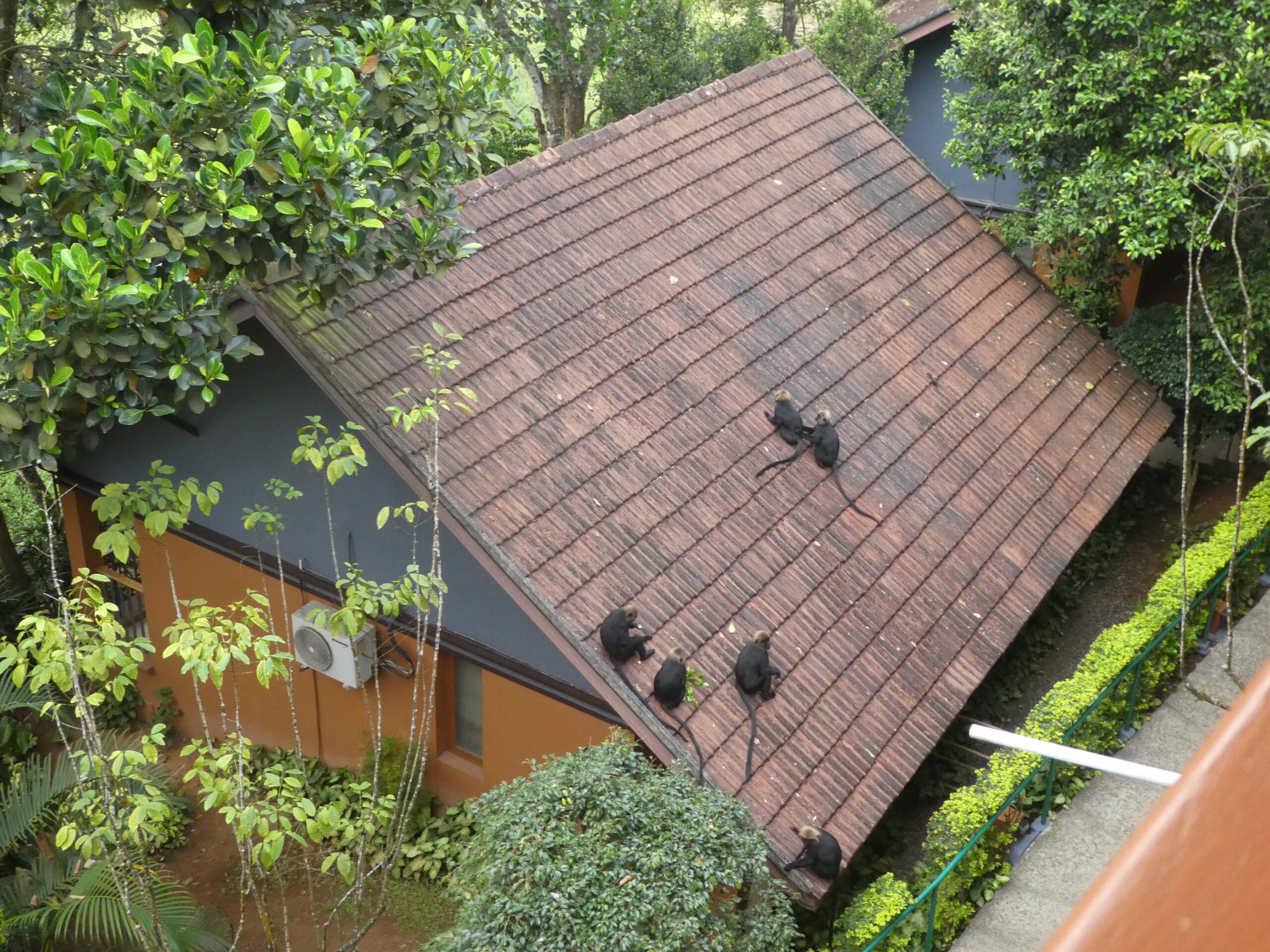 Am Nachmittag sind dann plötzlich die Affen da. Es sind so schöne Tiere mit glänzendem schwarzen Fell und heller Kopfbehaarung. Die seltenen und vom Aussterben bedrohten Nigiri-Languren fressen nur Blätter. Mit ihren langen Gliedmaßen springen sie geschickt von Baum zu Baum und balancieren an langen schwankenden Stämmen. Obwohl sie nicht in die Hotelzimmer eindringen oder den Touristen etwas vom Balkon stehlen, sind sie hier nicht gern gesehen, mit Platzpatronen und langen Stangen werden sie vom Hotelpersonal verscheucht. Leider verschwindet als erstes der Nigiri-Marder, der blitzschnell im Baum vor unserem Zimmer über die Äste flitzt. Die Affen kennen das alles schon und wissen, dass ihnen nichts passiert, nur unwillig verlassen sie den Garten.