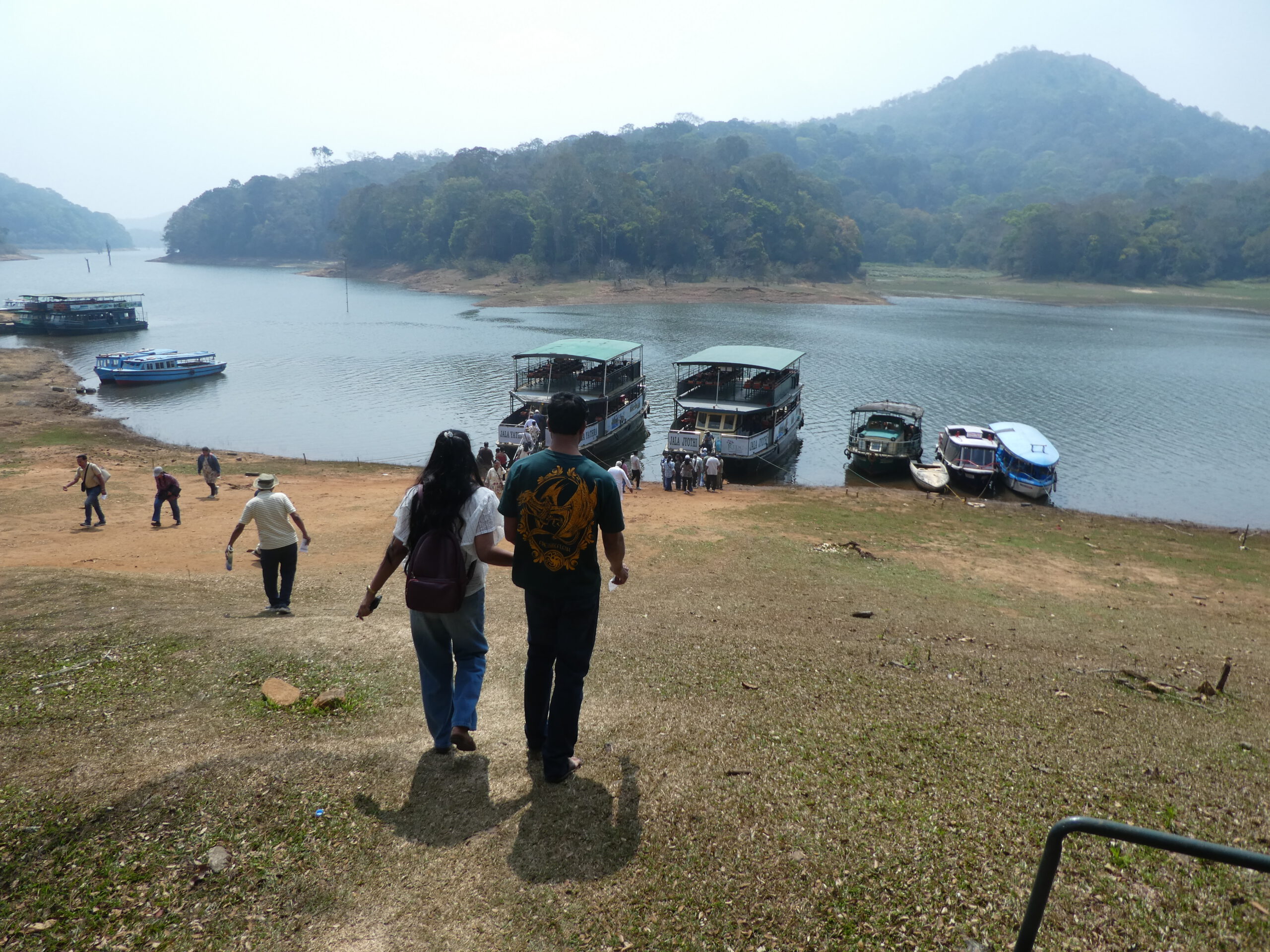 Von Kumily aus fahren spezielle Busse in den Thekkady oder Periyar Nationalpark. Im fast 1000 km² großen Schutzgebiet in den Kardamombergen leben Elefanten und Tiger. Mitten im Nationalpark liegt der große Periyar-Stausee. Besucher können Wanderungen oder Bootstouren im weitverzweigten Gewässer machen. Wir wollten schon am Sonntag Eintrittskarten kaufen, aber der Andrang war groß, so dass wir zwei Tage später einen neuen Versuch starten. Es sind zwar weniger Besuche vor Ort, aber erst im dritten Bus bekommen wir einen Platz. Mit dem Kauf der Fahrkarte für das Boot erfahren wir den Namen des Schiffs und unsere Platznummern, die leider in der Mitte zu finden sind. Auf jedem Sitzplatz liegt eine Rettungsweste, die jeder anziehen muss. Das Boot hat schon abgelegt, da kommt ein Mann von der Besatzung und verlangt noch einmal unsere Fahrkarten zu sehen. Er schüttelt den Kopf und winkt uns, ihm zu folgen. Auf dem Oberdeck bekommen wir direkt an der Außenseite die neuen Plätze zugewiesen. „Da unten sehen sie doch gar nichts,“ meint er. Das stimmt natürlich. Später lässt er sich immer wieder meine Kamera geben, um Tiere zu fotografieren, die ich noch gar nicht gesehen habe.