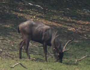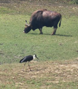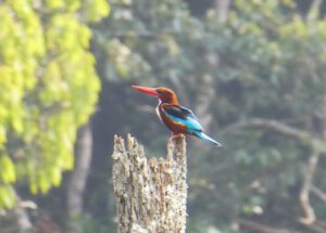Jetzt, zum Ende der Regenzeit, verlieren die Teakbäume ihre riesigen ledrigen Blätter. Die Mitarbeiter unseres Ressorts haben alle Hände voll zu tun, die Wege freizuhalten. Erst zu Beginn der nächsten Regenzeit in drei bis 5 Monaten schlagen sie wieder aus. Wir hören ständig Vogelstimmen, die wir dank einer App bestimmen können. Den Indischen Koel, einen Flaggendrongo, den Grünrücken-Nektarvogel und den Gelbbrauen-Laubsänger haben wir schon identifiziert. Leider lassen sich die Verursacher der Töne selten oder gar nicht blicken.