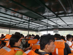 So auch, als wir ins Boot steigen. Wir müssen Rettungswesten anlegen, das Boot wird angelassen, es gibt einen Knall und dann nichts mehr. Ein anderes Schiff wird herbeigerufen, alle klettern von einem schwankenden Boot in das andere und mit Verspätung geht es los. Als wir nach einer halben Stunde den Hafen sehen, streikt auch dieses Boot.
