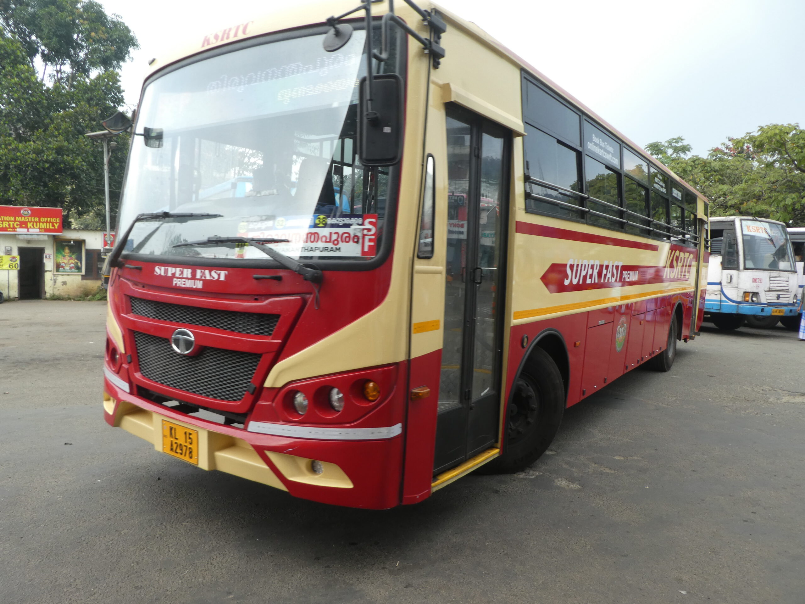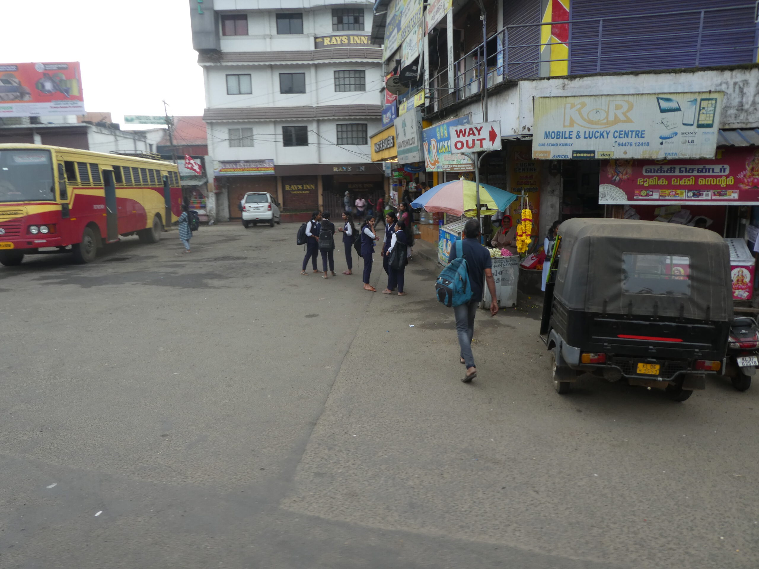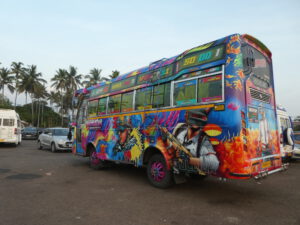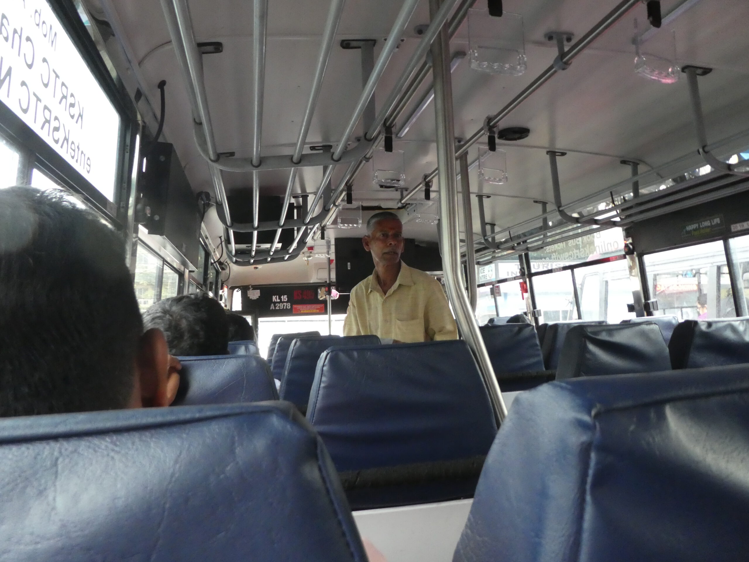 Doch heute fahren wir in Keralas Hauptstadt – auch Trivandrum genannt – und da gibt es ein paar Shops, die auch Computer reparieren. Klaus hat online die Tickets für den Bus bestellt, nur die gestern bestellte Rikscha kommt nicht. Kein Problem, ein Hotelmitarbeiter bestellt sofort eine andere und wir sind am Busbahnhof, bevor das Fahrzeug der Red Line Gesellschaft eintrifft. Der Bus gilt als komfortabel, aber das können wir nicht bestätigen. Es gibt kein Gepäckfach für unsere Koffer, die müssen mit in den Fahrgastraum und rutschen in jeder Kurve ungebremst hin und her, bis Klaus sie am Geländer des Ausstiegs festbindet. Die Sitze sind schmal, keine Sicherheitsgurte, keine Fußstützen, ganz zu schweigen von Wasser für die Fahrt.