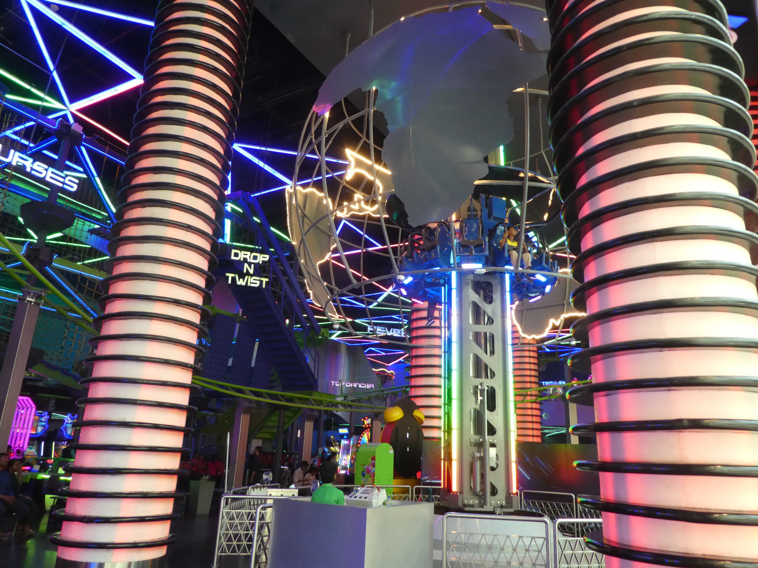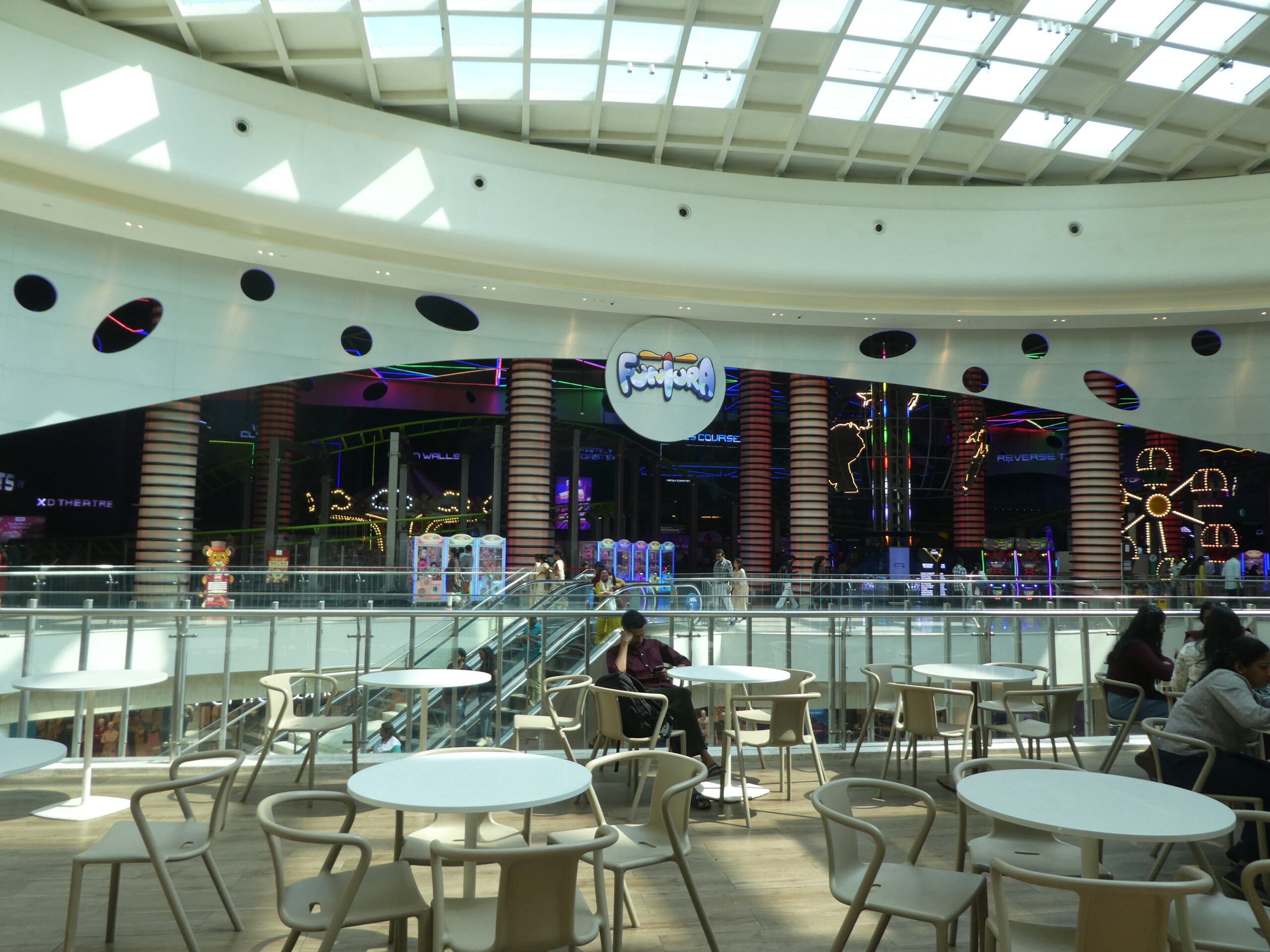 Wir lassen uns ins Lulu Einkaufszentrum bringen, um noch einige Besorgungen zu machen und etwas zu essen. Im zweiten Stock befindet sich auf ca. 8000 m² der größte Indoor Vergnügungspark Indiens. Außer den Klassikern Karussell, Riesenrad und Autoskooter gibt es verschiedene Achterbahnen, einen Turm, an dem Gondeln in die Höhe gezogen und wieder fallengelassen werden und noch andere Attraktionen für Adrenalin-Junkies.
