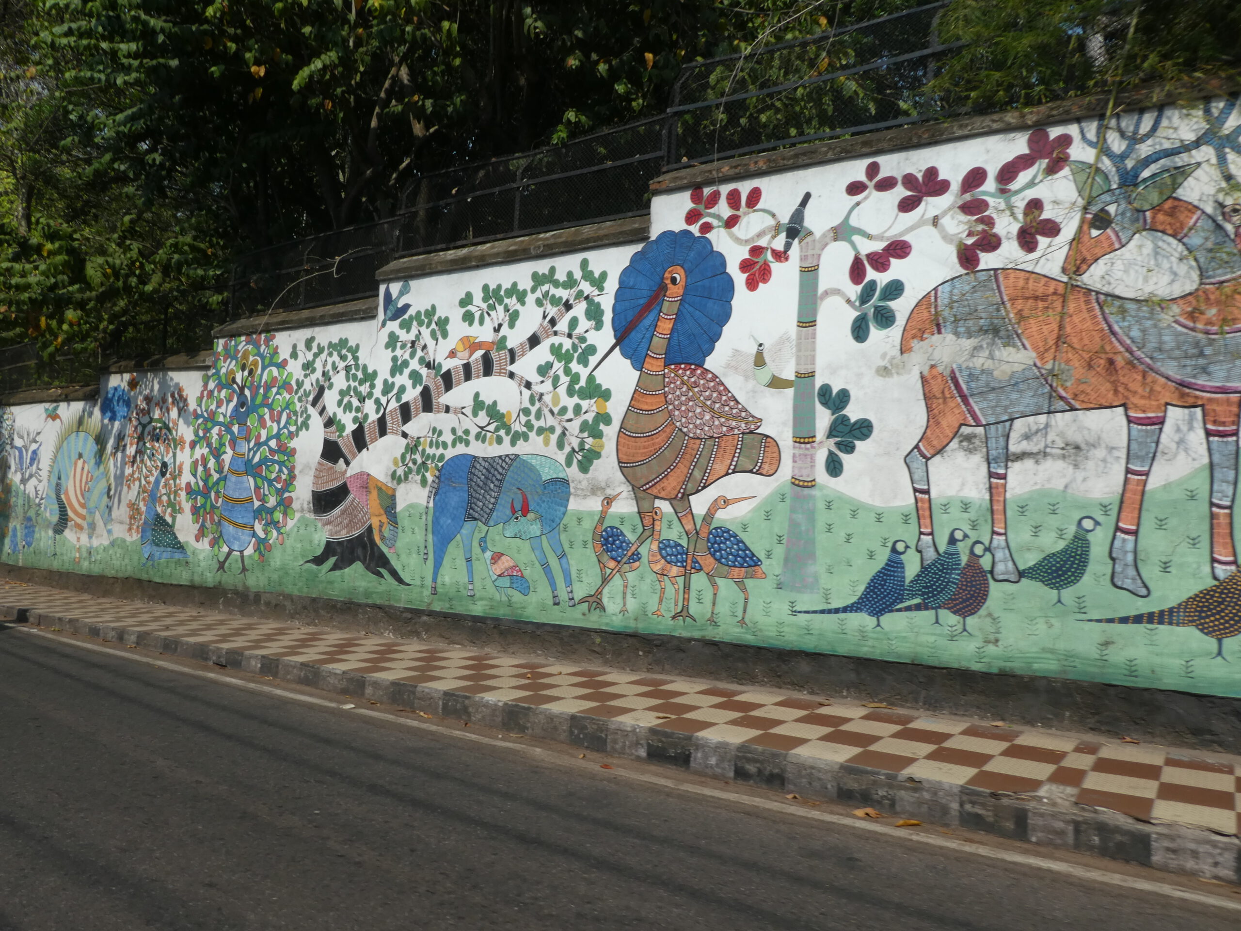 An einer bemalten Mauer vorbei, von denen es viele in Fort Kochi gibt, gehen wir in ein Café, gleichermaßen beliebt bei Touristen und Einheimischen. Entsprechend sind die Preise, wobei wir bei 3,50€ für ein Sandwich mit Thunfisch- bzw. Hühnersalat wirklich nicht meckern können. Abends entdecken wir ein weiteres Café in der Nähe unserer Unterkunft, das Mahé ist in einer über 100 Jahre alten gepflegten Villa mit viel Grün rundherum eingerichtet. Die Kolonialherren haben es sich wirklich gutgehen lassen.
