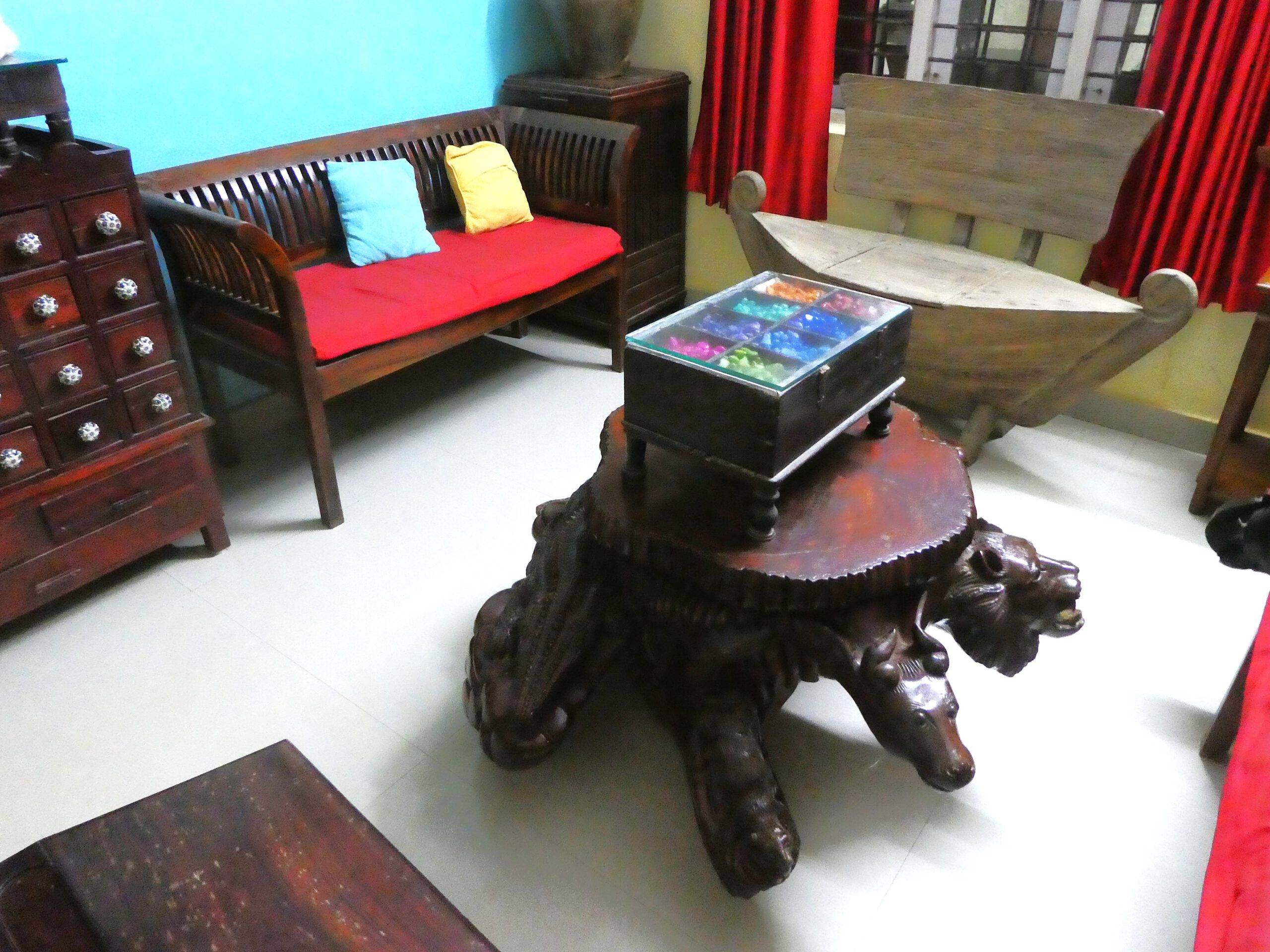 Am Busbahnhof herrscht das übliche Gewimmel, wir weichen sofort nach links zur Straße aus, denn hier stehen genügend Rikschas bereit. Das gebuchte Homestay liegt direkt am Meer, doch zuerst müssen wir eine lange Barriere umfahren, den Flughafen. Die letzten 100 Meter geht es über eine Sandpiste, direkt am Meer. Die Besitzer erwarten uns schon, leider sprechen sie wenig oder für uns kaum verständliches Englisch. Das Haus ist schon alt und von innen wunderschön, die Erbauer waren bestimmt wohlhabend. Eine massive Holztür mit hoher Schwelle führt von der Terrasse in unser Zimmer, sie kann nur von innen mit einem dicken hölzernen Riegel verschlossen werden. Es gibt aber noch eine andere Tür ins Innere des Hauses. Wir trauen uns zuerst gar nicht dort raus, weil wir durch die Privaträume der Besitzer müssen, aber es ist der richtige Weg. Der Couchtisch aus massivem Holz ist mit geschnitzten Tierköpfen und einem ganzen Krokodil verziert. Was mag der wiegen, wenn man schon Schwierigkeiten hat, einen einfachen Stuhl zu tragen. Alle Möbel, die wir bisher gesehen haben, sind aus Massivholz. Sessel für Balkon oder Terrasse meist aus Rattan, manchmal aus Plastik.