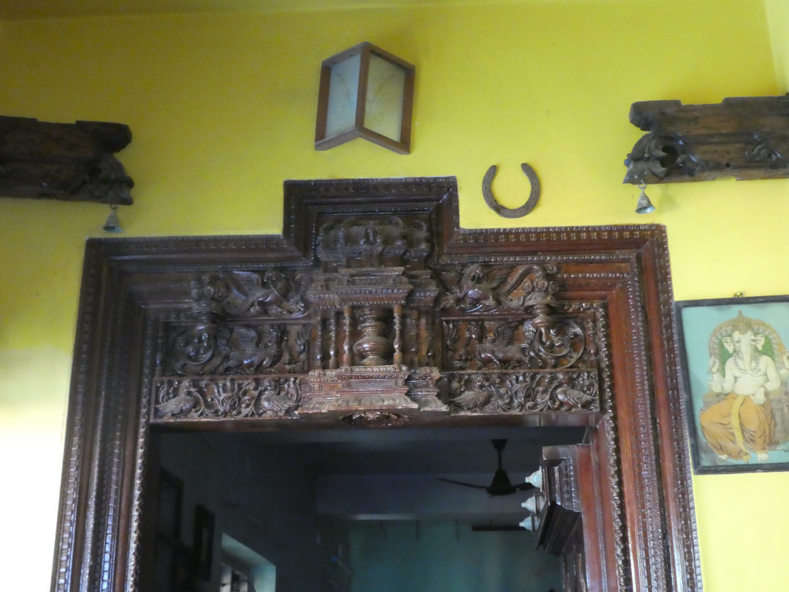Dieses Mal besuchen wir den Mattancherry- oder niederländischen Palast, der 1555 von den portugisischen Eroberern im europäischen und traditionellen Kerala-Stil erbaut und dem damaligen König zum Geschenk gemacht worden ist. Gute hundert Jahre später ist der Palast von den Niederländischen Eroberern renoviert worden und hat seine heutige Bezeichnung bekommen. Über eine unbequeme Treppe gelangen wir in den ersten Stock und sofort fällt uns die kunstvolle Holzdecke auf. Viel ist in diesem Palast, der rechteckig um einen Innenhof angelegt ist, nicht erhalten geblieben, aber es existieren noch die weltberühmten Wandmalereien mit Szenen aus dem Hinduismus und Porträts der Herrscher Kochis der letzten 160 Jahre in der Krönungshalle. Sie sind elegant, aber nicht operettenhaft gekleidet. Die festliche Kleidung für indische Männer gefällt mir sehr, es gibt viel mehr Möglichkeiten als bei uns.