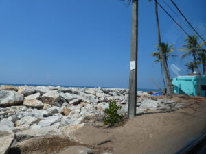 Nach kurzer Strecke trennen sich unsere Wege. Unserer führt am Meer entlang nach Norden. Auch an diesem Küstenabschnitt gibt es viele zerstörte Häuser. Sie stehen kaum 10 Meter vom Meer entfernt und sind Opfer der Küstenerosion, durch die schon knapp 3 km² Land verloren gegangen sind. Die Regierung hat den betroffenen Familien über 330 neue Wohnungen übergeben und arbeitet an Lösungen, weil mit einer Verschärfung der Erosion gerechnet wird. Gerade errichten Bagger Wälle und Buhnen aus großen Felsblöcken.