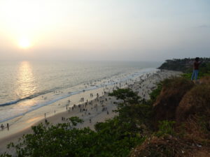 Auf einem Parkplatz ist die Fahrt zu Ende, doch von unserem Hotel ist nichts zu sehen. Der Fahrer fragt ein paar Kollegen, die bestätigen, dass das Hotel gleich um die Ecke liegt, und fährt los. Wir sind verunsichert, doch ein netter Mann, den wir fragen, schnappt sich meinen Koffer und läuft den schmalen Weg und eine Treppe runter über den etwas gammeligen Hinterhof zu unserem Hotel. Von der richtigen Seite sieht hier alles gut aus, nur der Name Sea View passt nicht ganz, vom Meer ist nichts zu sehen. Erst als wir im angeschlossenen Restaurant im ersten Stock sitzen, sehen wir sowohl Meer als auch Strand. Der feinsandige Strand von Varkala ist begrenzt von ca. 20 bis 30 Meter hohen Klippen aus rotem Laterit, die flache Mitte teilt sie in Nord- und Südkliff.