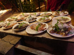 Am Abend entdecken wir ein kleines Karree, in dem Lokal an Lokal grenzt, hauptsächlich Touristen essen hier. Erst als wir eines entdecken, in dem Einheimische essen, setzen wir uns dazu und bekommen auf Plastiktellern köstliches Essen serviert.