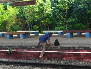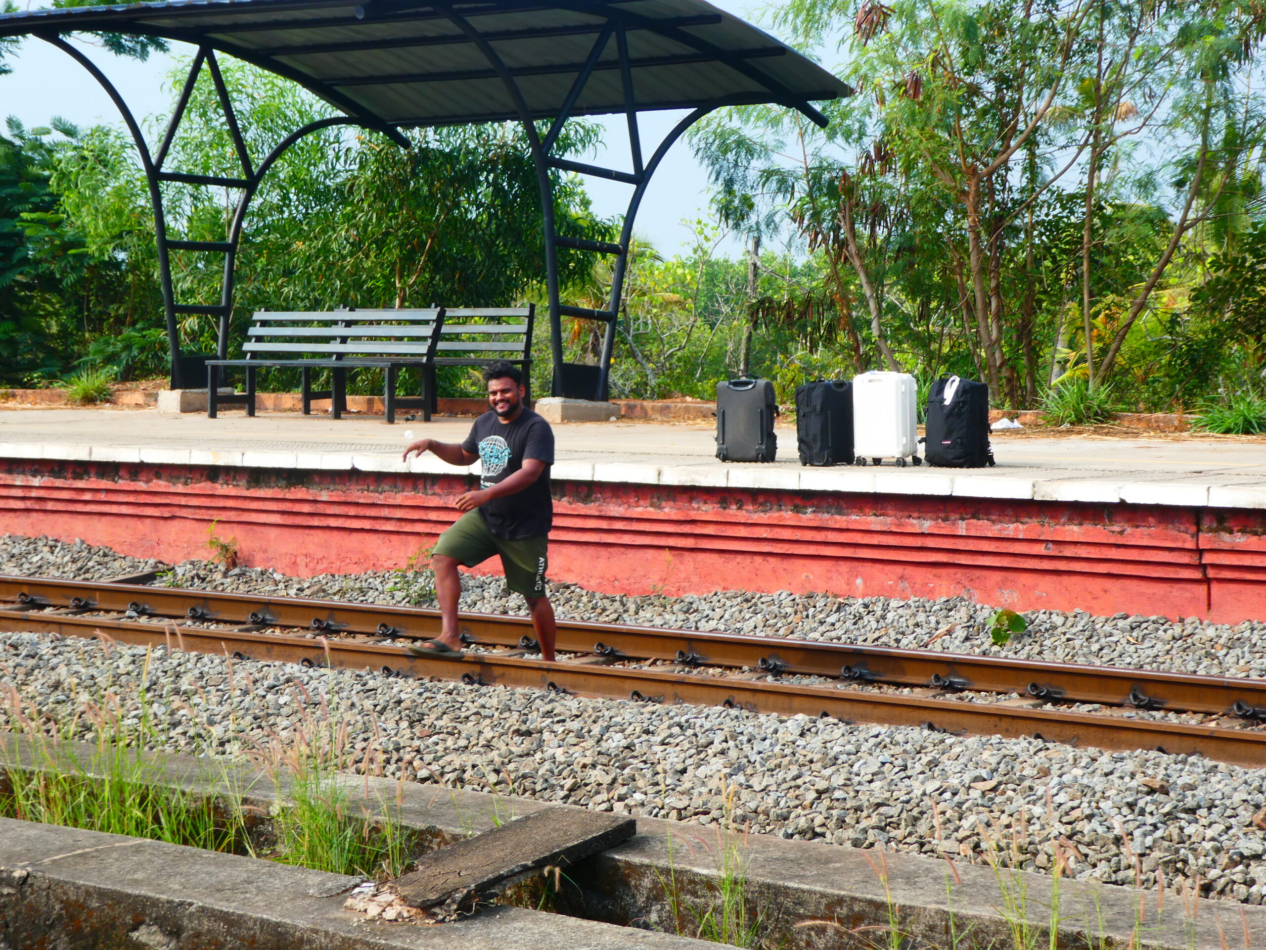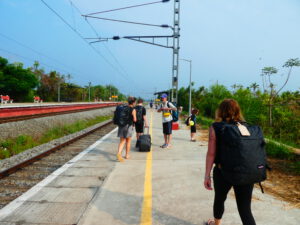 Midhun begleitet uns auf seinem Motorrad zum Bahnhof. Klaus kauft inzwischen die Fahrkarten, für die 90 Kilometer lange Strecke kosten sie 40 Rupien (0,40 €) pro Person. Der Zug fährt auf dem gegenüber liegenden Gleis ab und während wir noch überlegen, wie wir auf die andere Seite kommen, springt Midhun schon auf die Schienen und bringt das gesamte Gepäck nach und nach auf die andere Seite. Als einer der Franzosen ihm folgen will, schickt er ihn mit strenger Miene zum Ende des Bahnsteigs, wo es Treppen gibt.