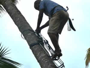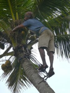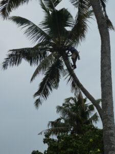 An einem Morgen kommt ein Mann mit merkwürdigen Metallschienen in den Hof. Er ist Kokospalmen-Kletterer und für die Pflege der Palmen verantwortlich. Zuerst befreit er die Stämme in Bodennähe von den verwelkten Wedeln, dann legt er die Schienen an den Stamm, schiebt seine Füße in die angebrachten Schlaufen und ist in Windeseile in der Krone in 15 Meter Höhe angekommen. Er schneidet die reifen Nüsse ab und wirft sie auf den Sand, das Blechdach über der Terrasse hat schon genug Dellen von heruntergefallenen Kokosnüssen. Anschließend behandelt er die Palmen noch mit einem Mittel gegen den roten Palmrüssler. Zum nächsten Frühstück bekommen wir köstlichen Kokossaft, gemixt aus Kokoswasser und Fruchtfleisch.