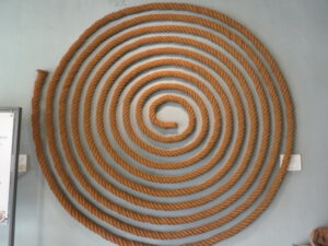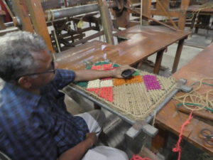 Kerala ist der Kokosnuss-Staat, das geht aus dem Namen hervor, Kera = Kokospalme und Alam = Land. Über lange Zeit haben viele Einwohner Keralas ihren Lebensunterhalt mit der Verarbeitung der Kokosnüssen verdient. Wasser und Fruchtfleisch werden in der traditionellen Küche verwendet, außerdem ist das gepresste Öl das am meisten verwendete in der indischen Küche. Aus den harten Schalen entstehen Schüsselchen, Löffel oder Schmuckgegenstände. Und dann gibt es noch die Fasern (Coir) aus denen Teppiche, Läufer, Fußmatten, Seile, Füllstoffe und noch einiges mehr entstehen. In unserer Nähe befindet sich das „Internationale Coir-Museum“, wo ein Eindruck von den Anfängen der Verarbeitung bis zum Beginn dieses Jahrhunderts vermittelt wird. Die heutige Produktion ist in neuen Gebäuden untergebracht, der Anteil der Handarbeit stark rückläufig. In verschiedenen Räumen sehen wir fertige Produkte und Geräte die zur Verarbeitung der Fasern verwendet werden, darunter massive Webstühle.
